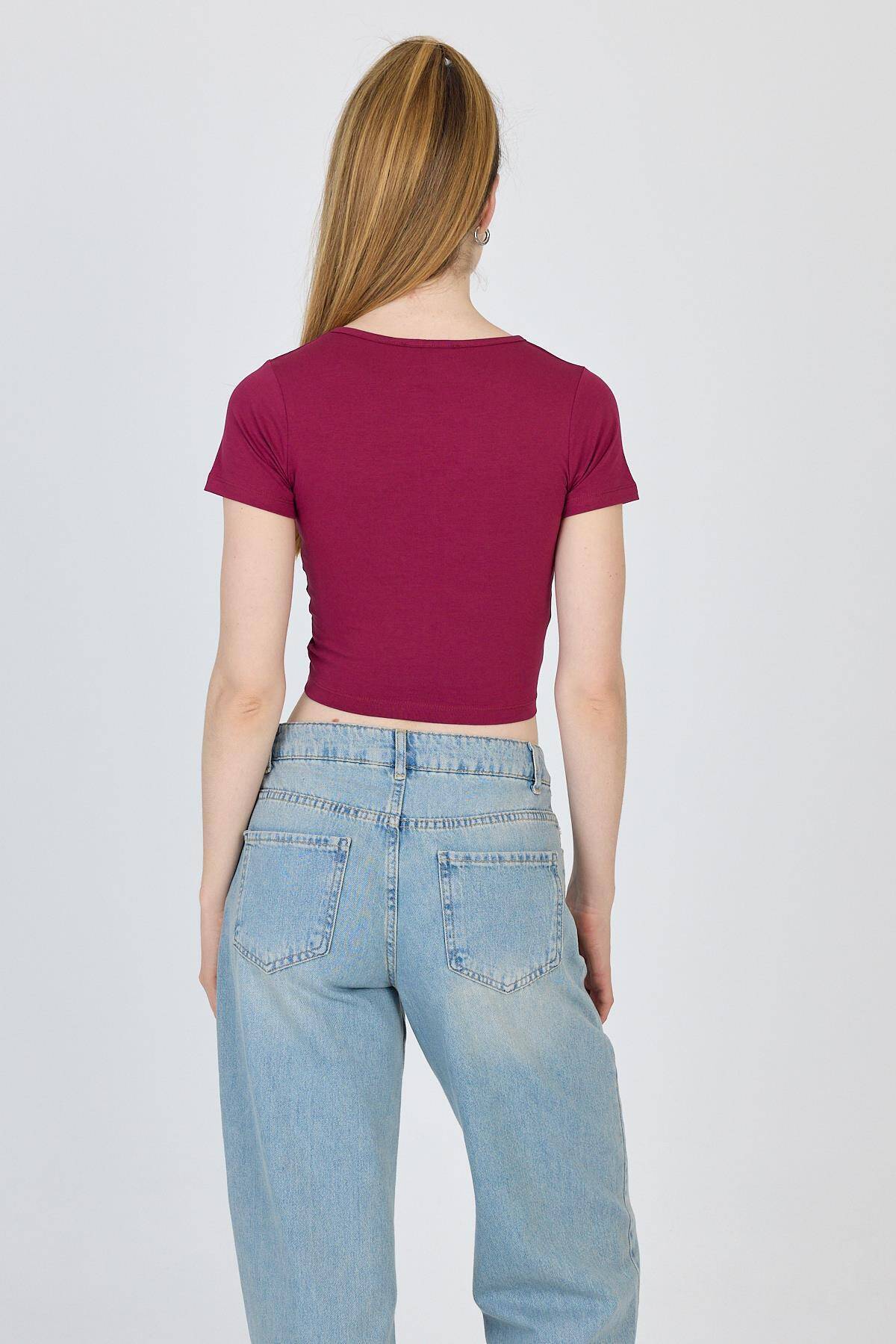 Bordo V Yaka Büzgülü Crop Tişört 9201M