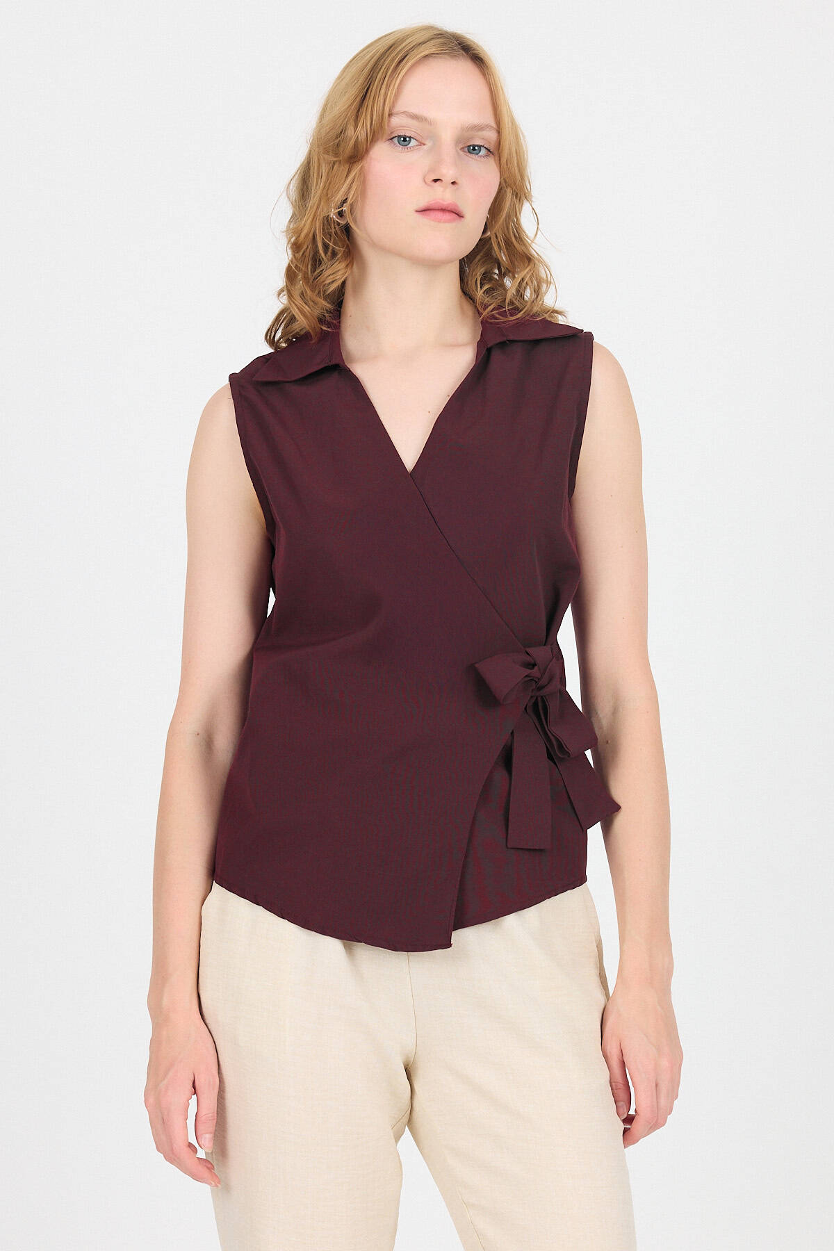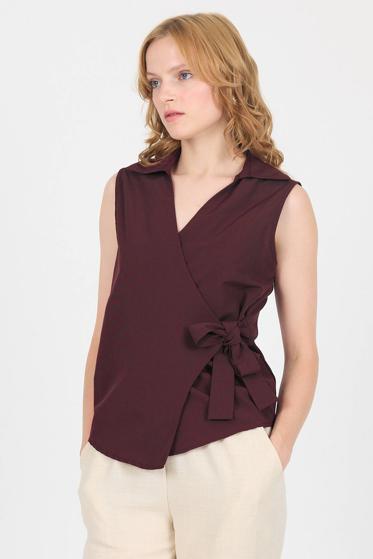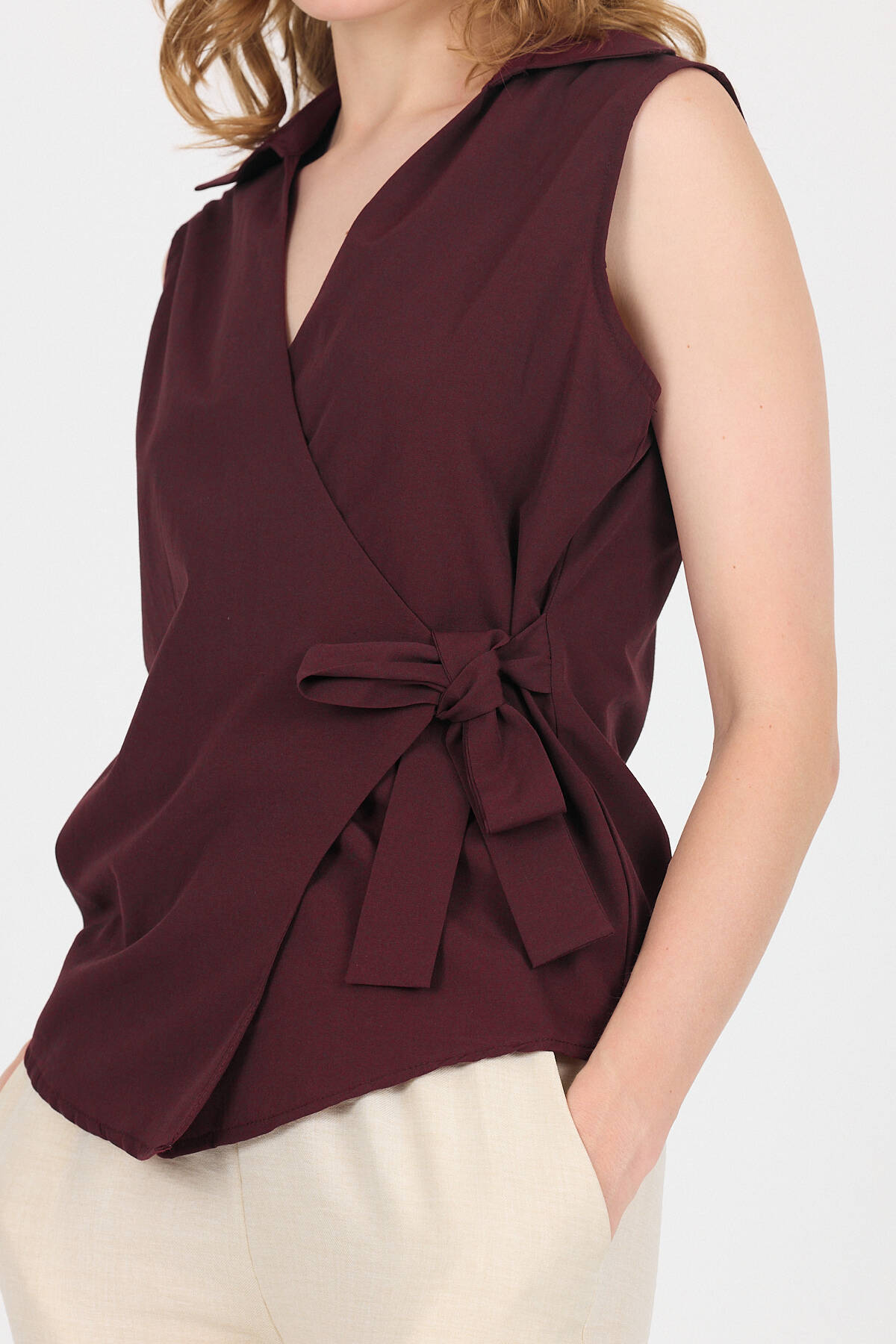 Bordo Yan Bağlama Detaylı Kolsuz Kruvaze Bluz 8047