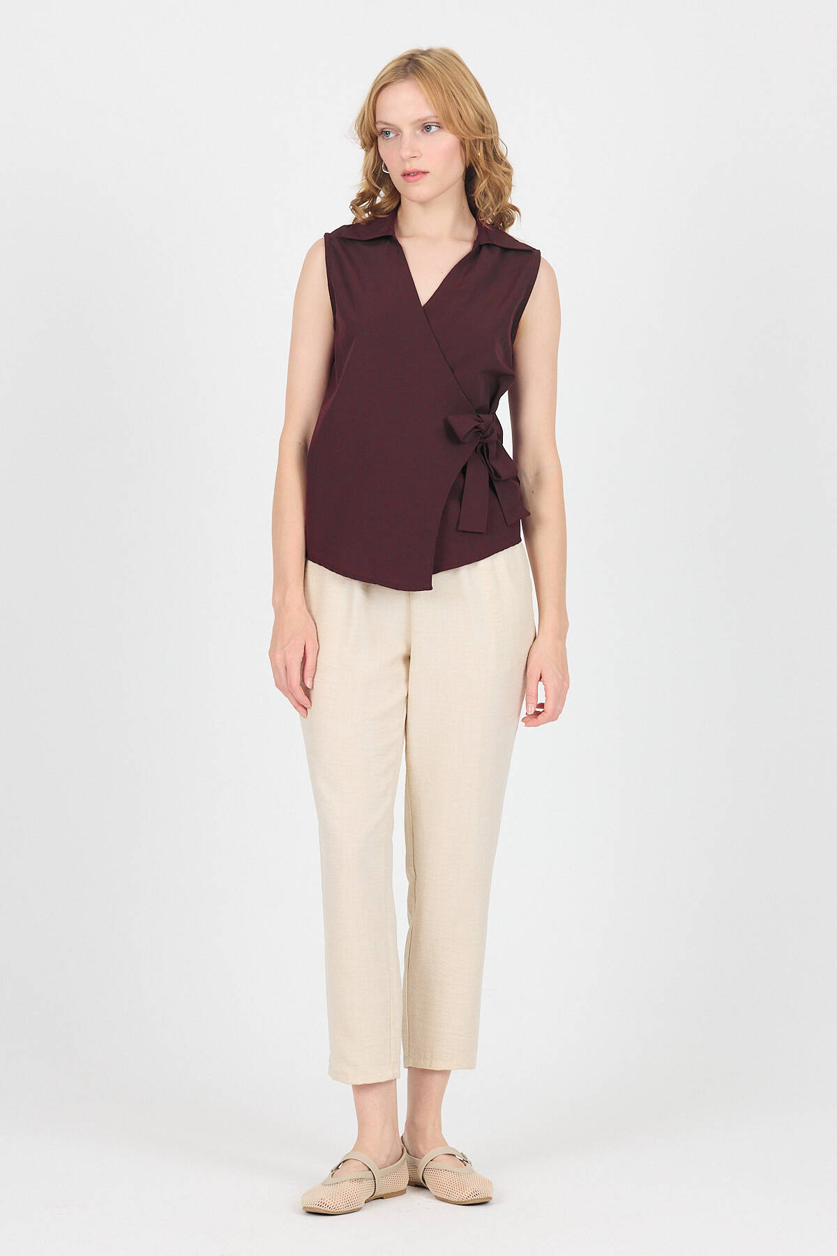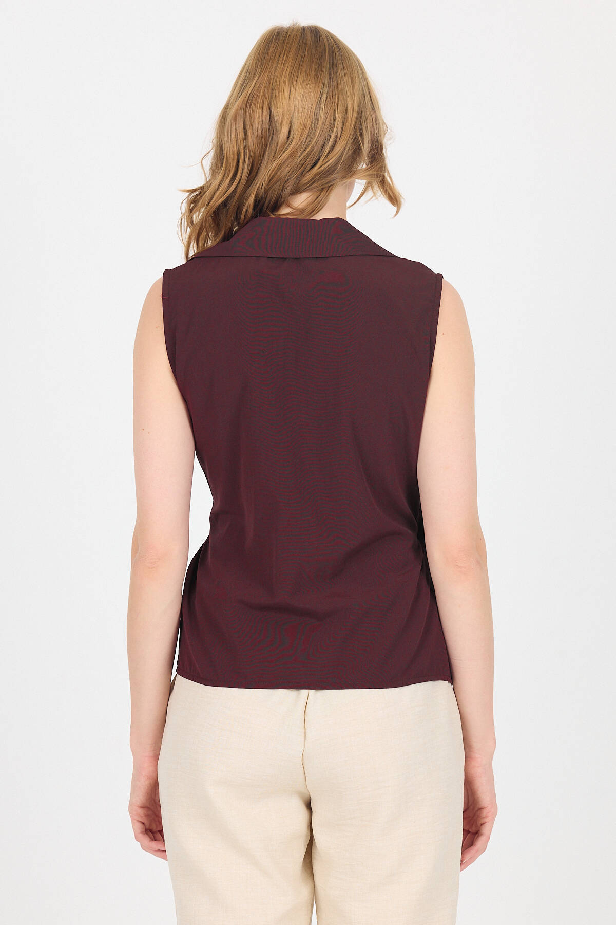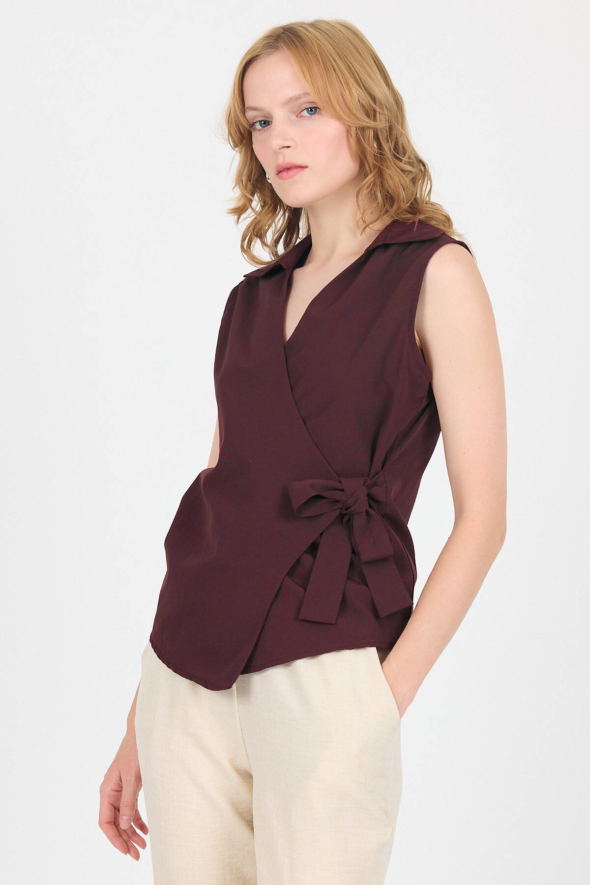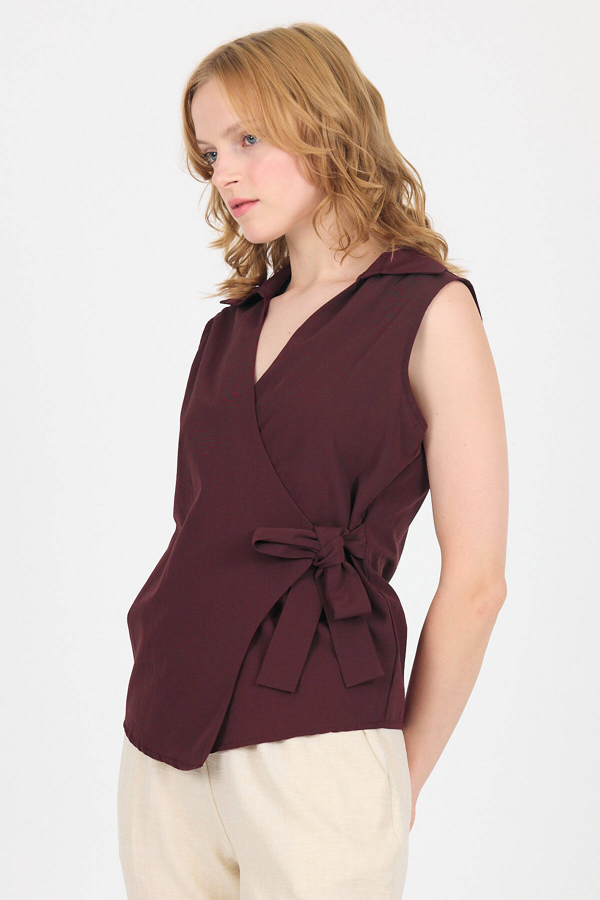 Bordo Yan Bağlama Detaylı Kolsuz Kruvaze Bluz 8047