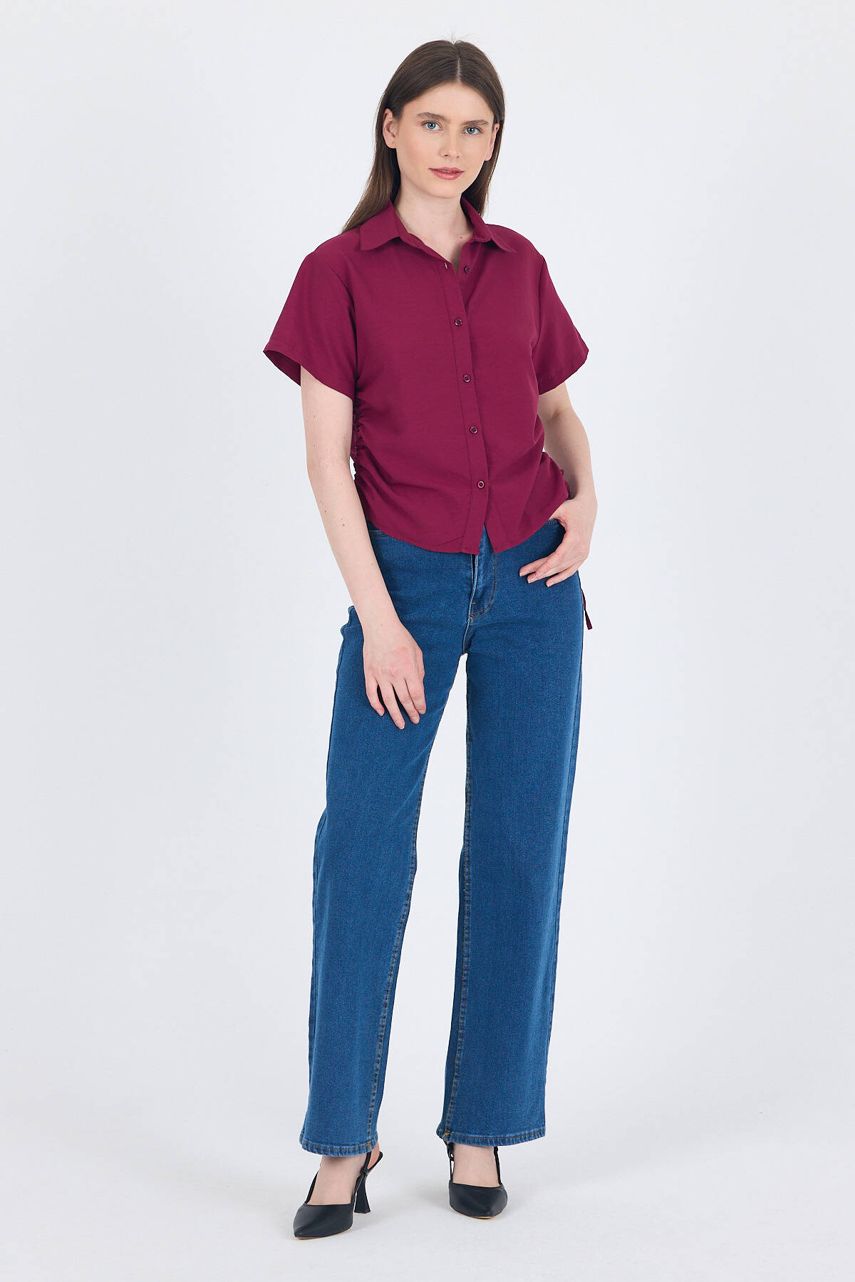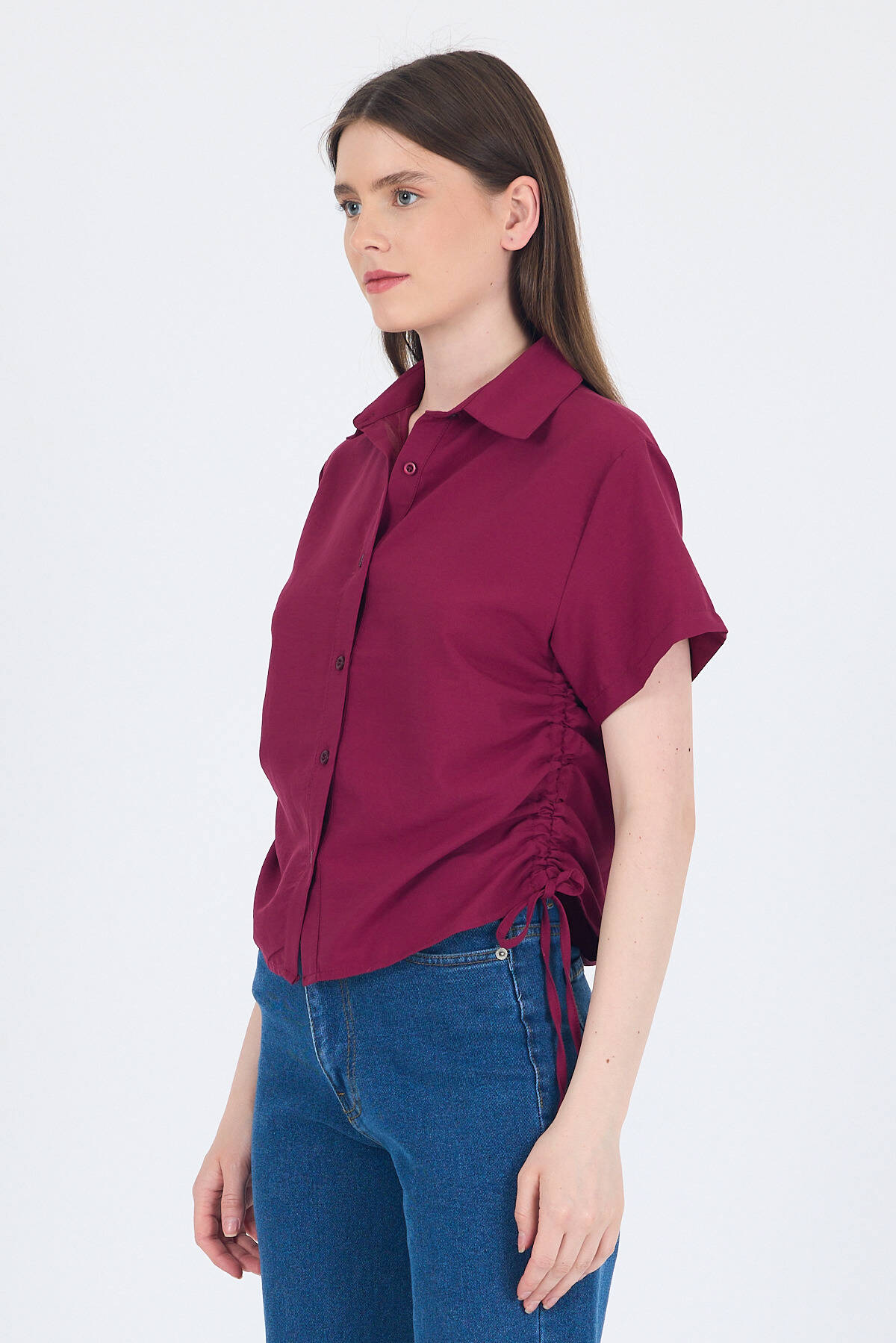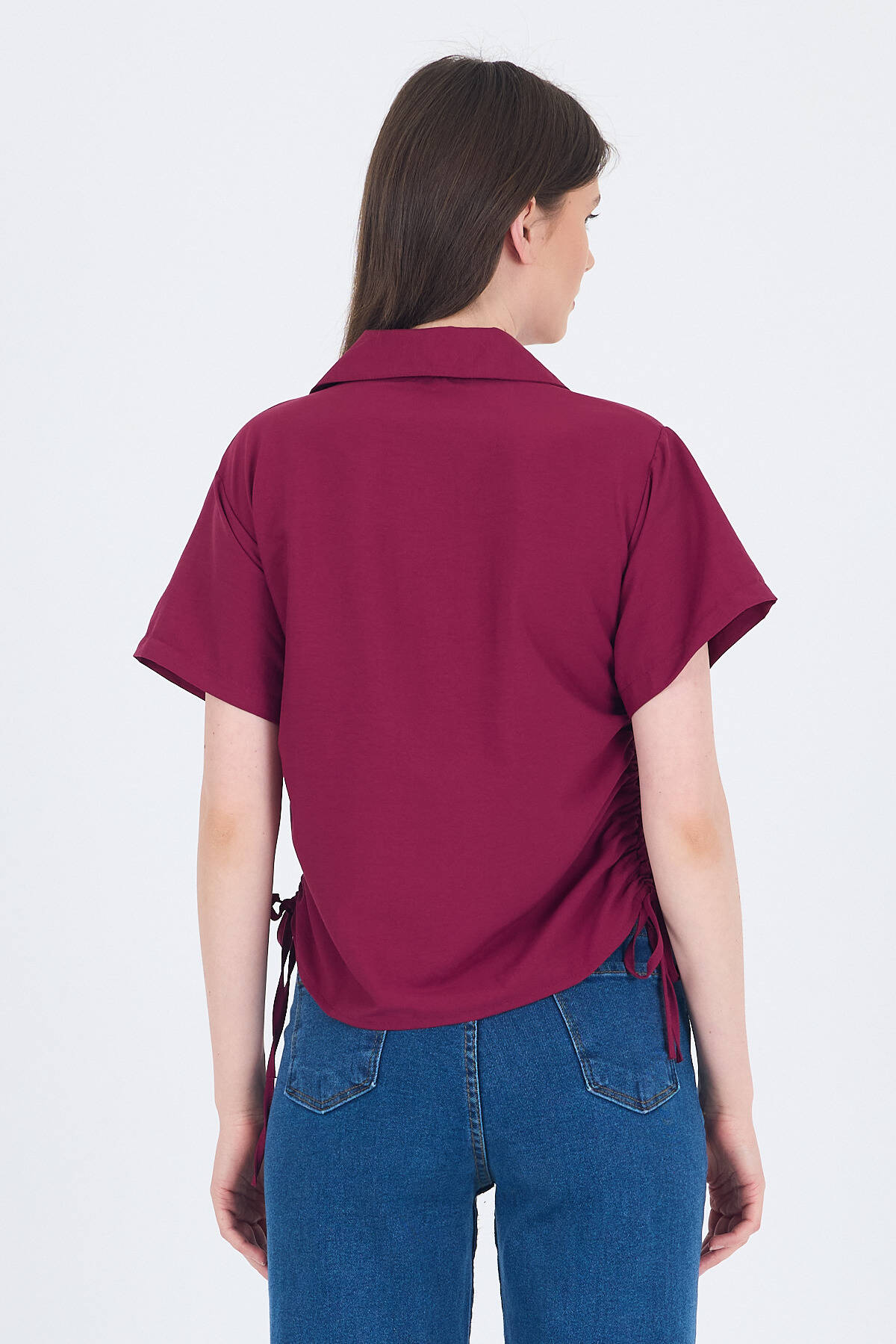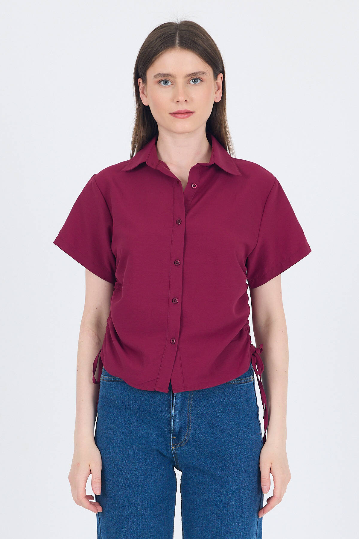 Bordo Yanları Büzgülü Bağcıklı Kısa Kollu Gömlek 4368A