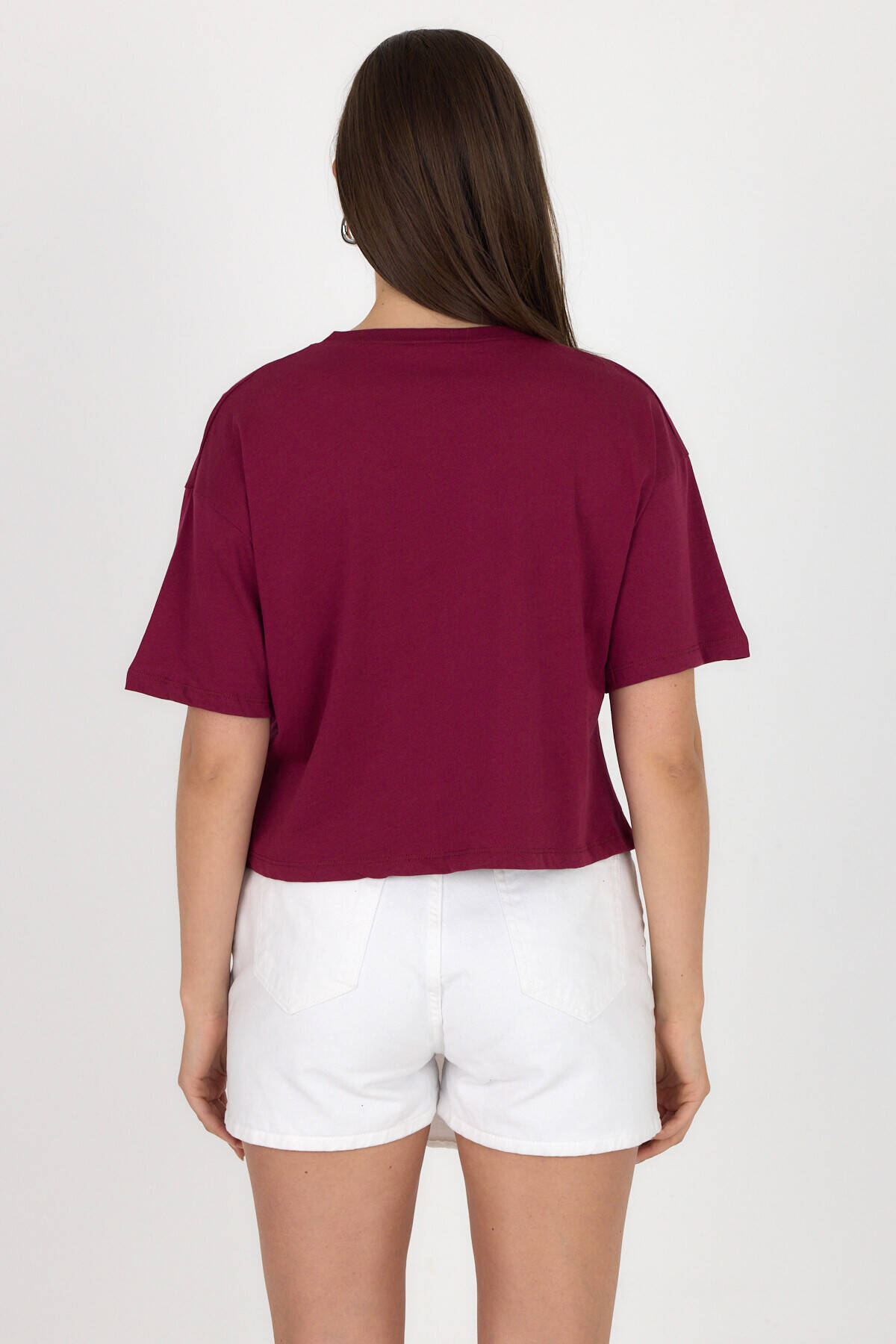 Bordo Yazı Baskılı %100 Pamuk Crop Tişört 9188M