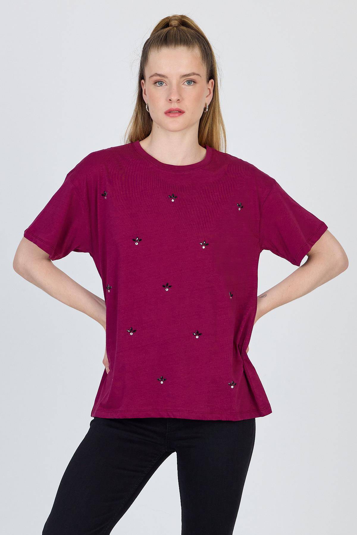 Bordo Yazı Baskılı %100 Pamuk Oversize Tişört 2150-18M