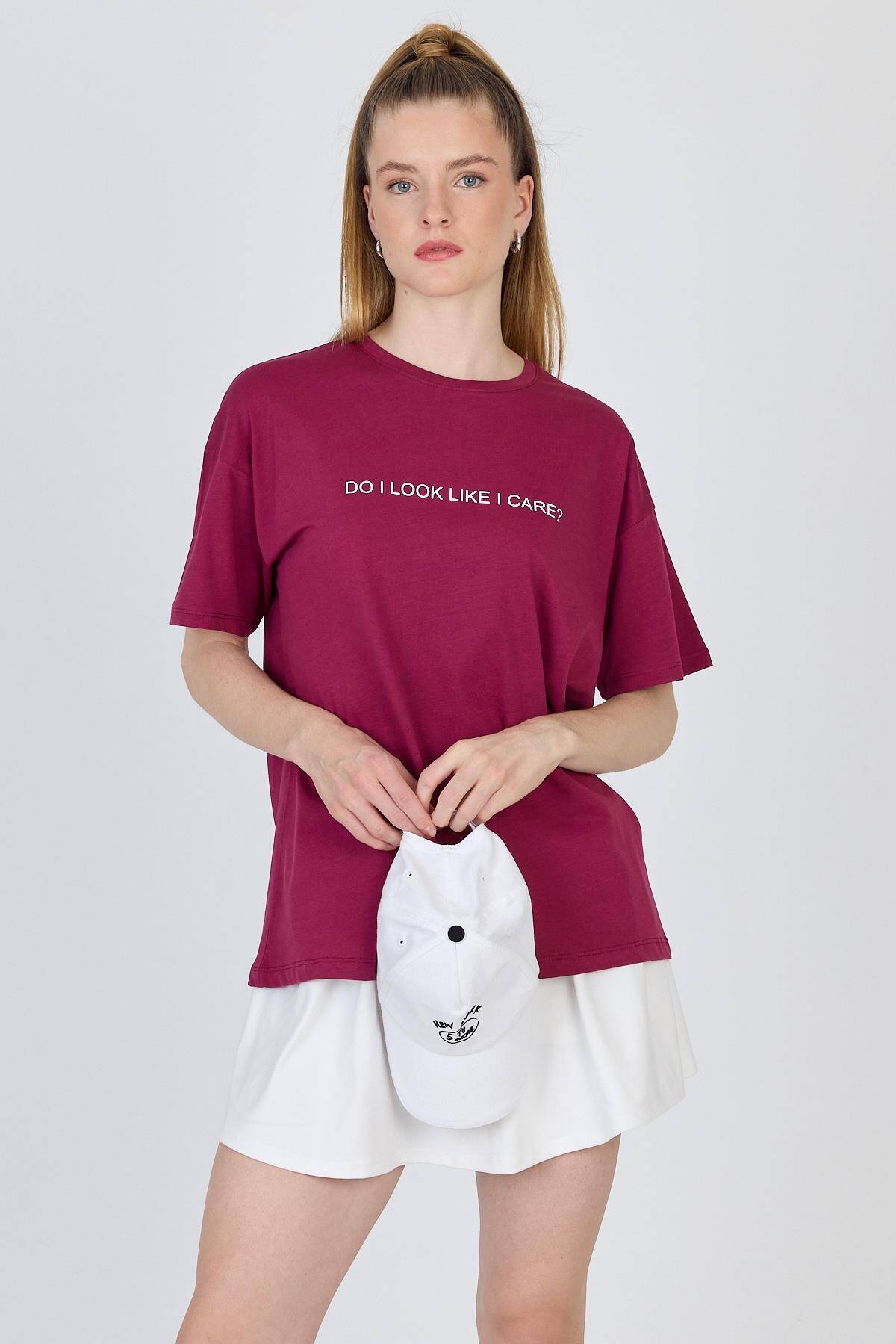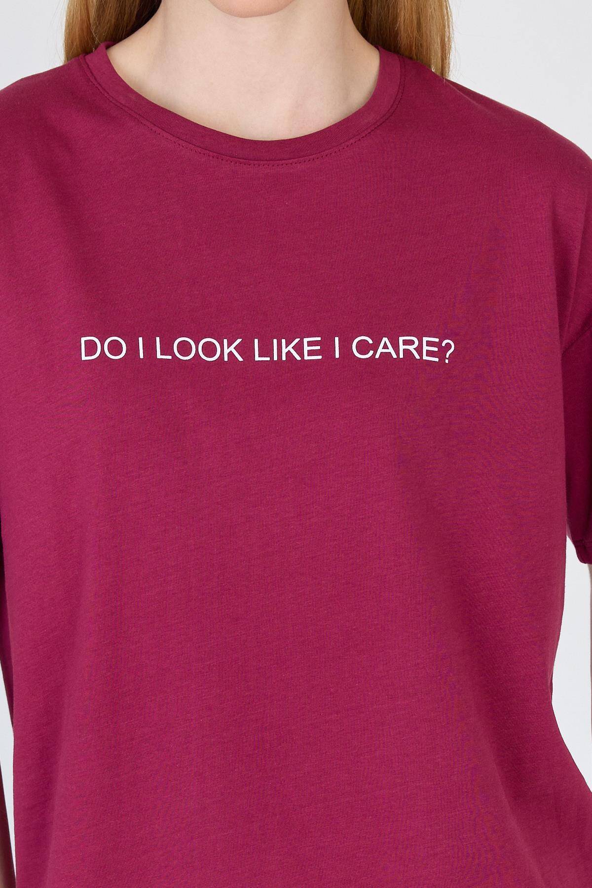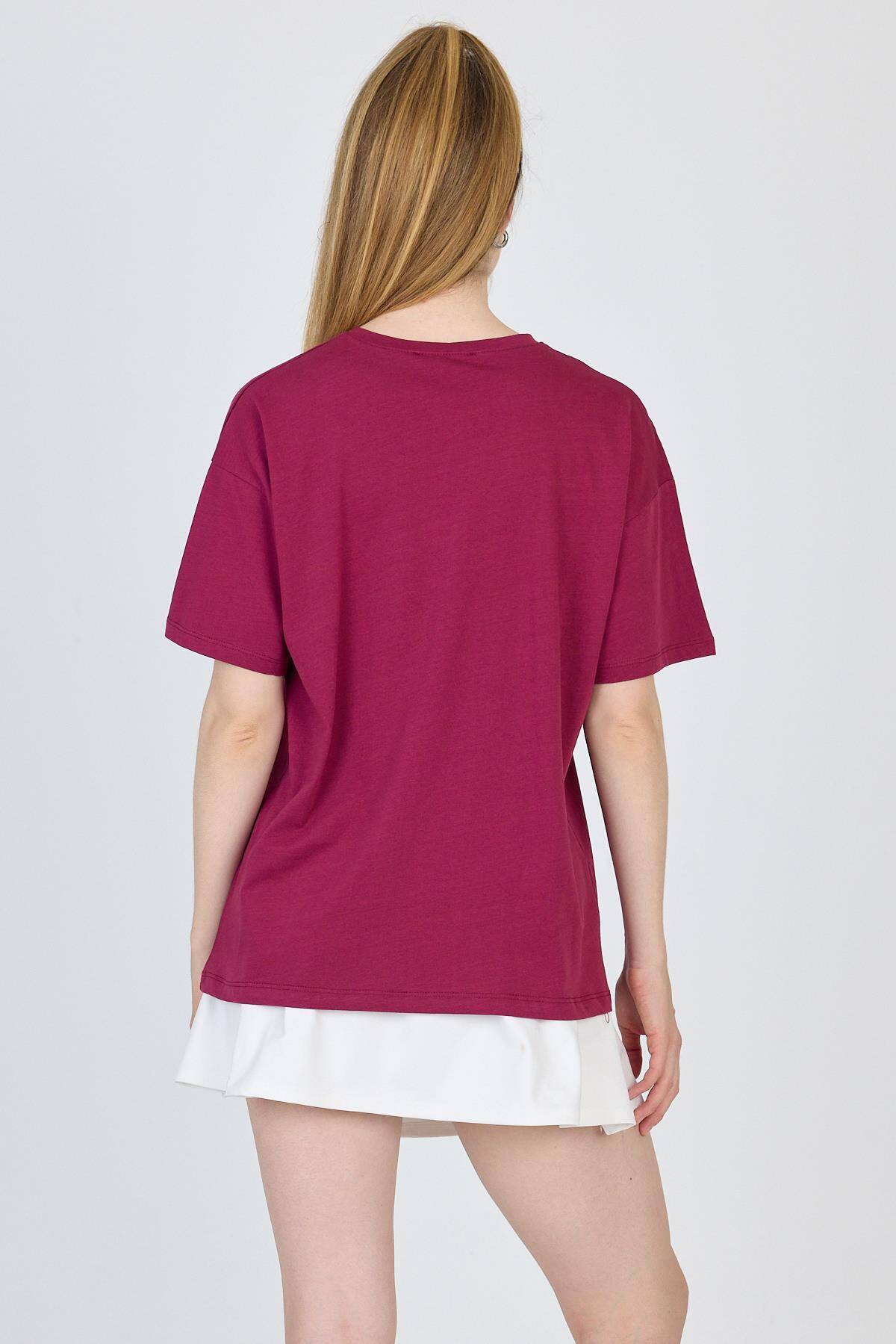 Bordo Yazı Baskılı %100 Pamuk Oversize Tişört 2150-5M