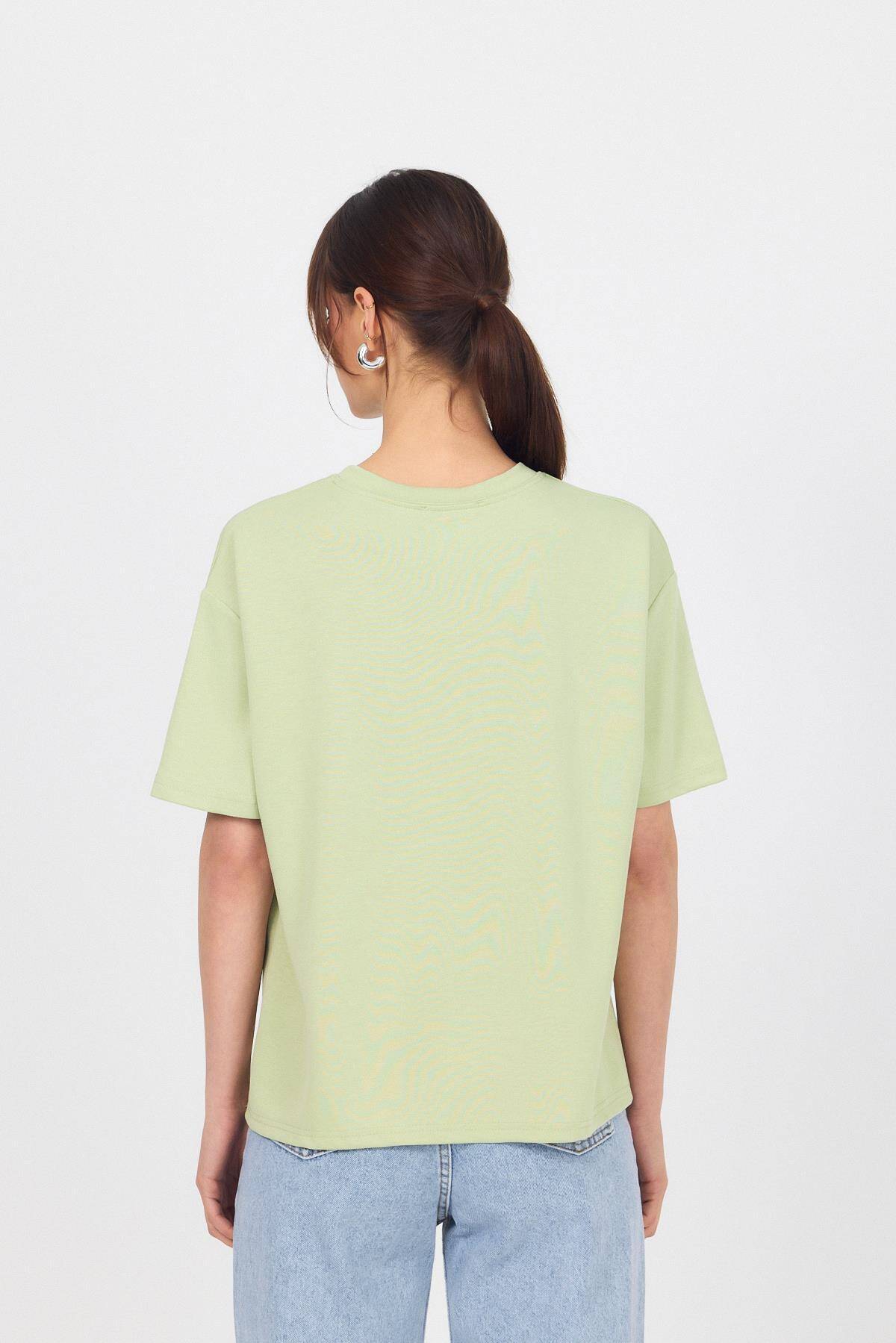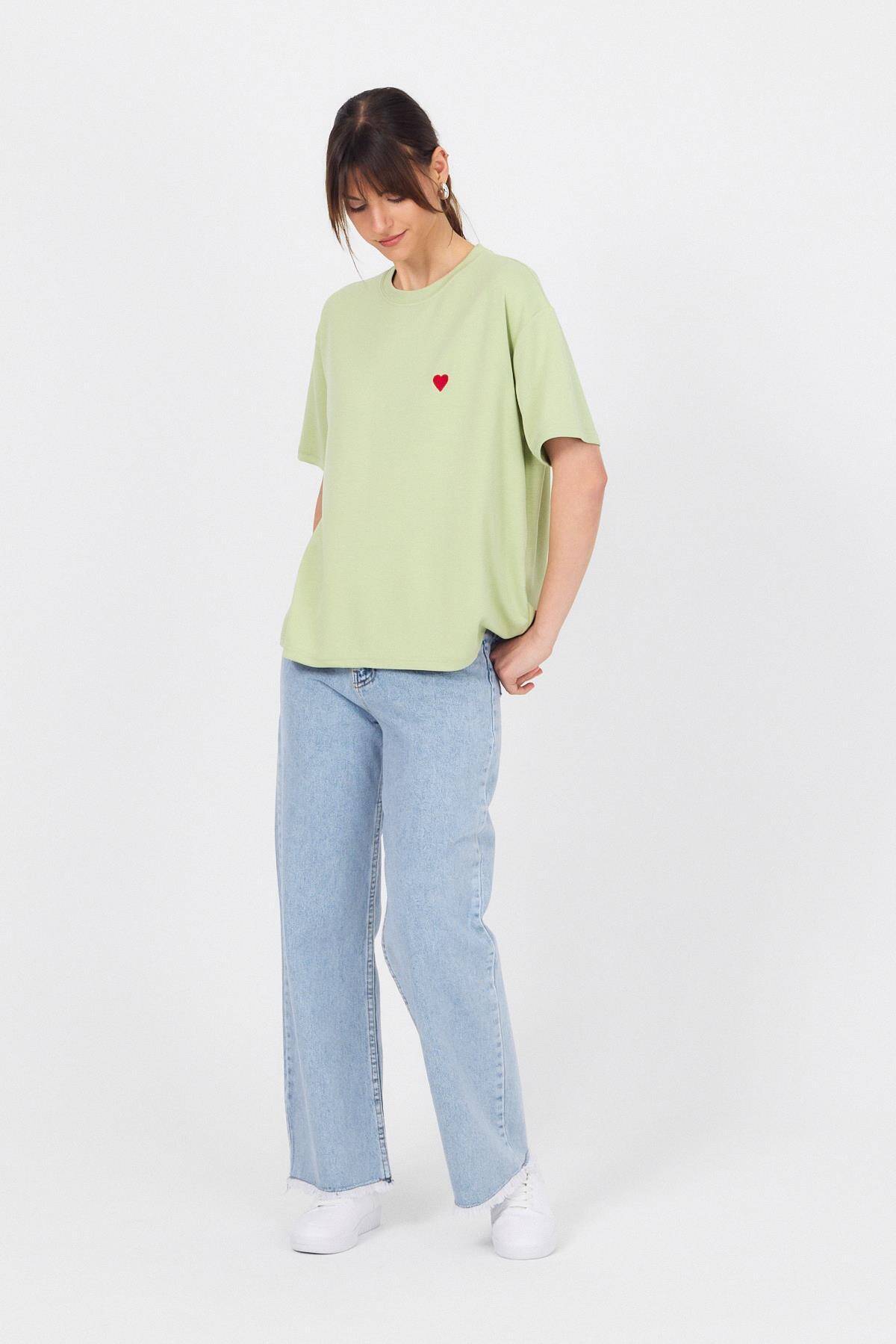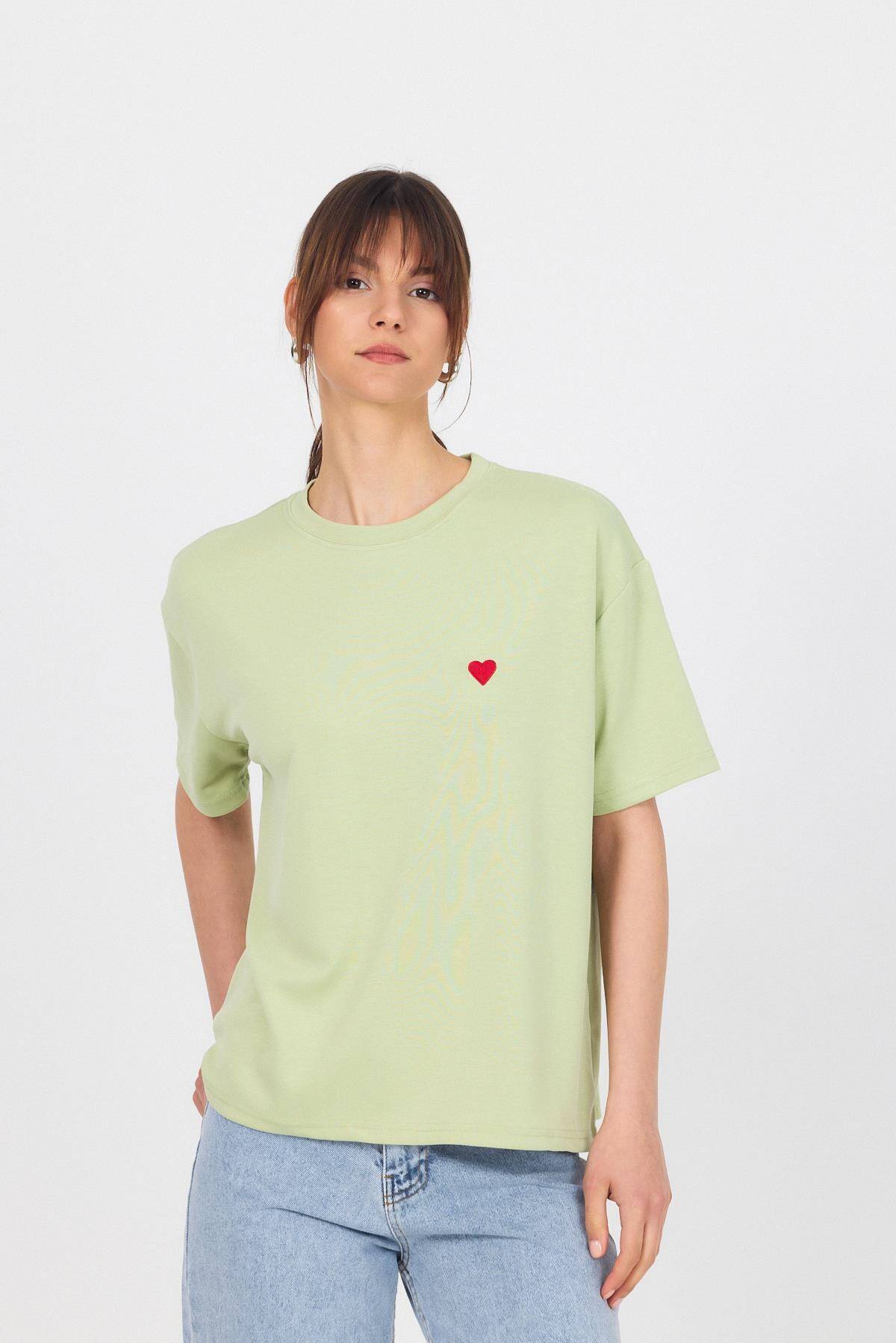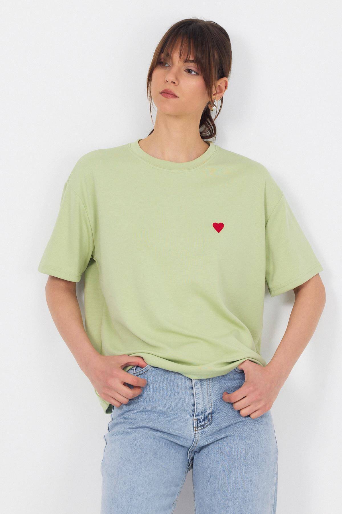 Çağla Yeşili Kalp Nakışlı Premium Kumaş Tişört 6218