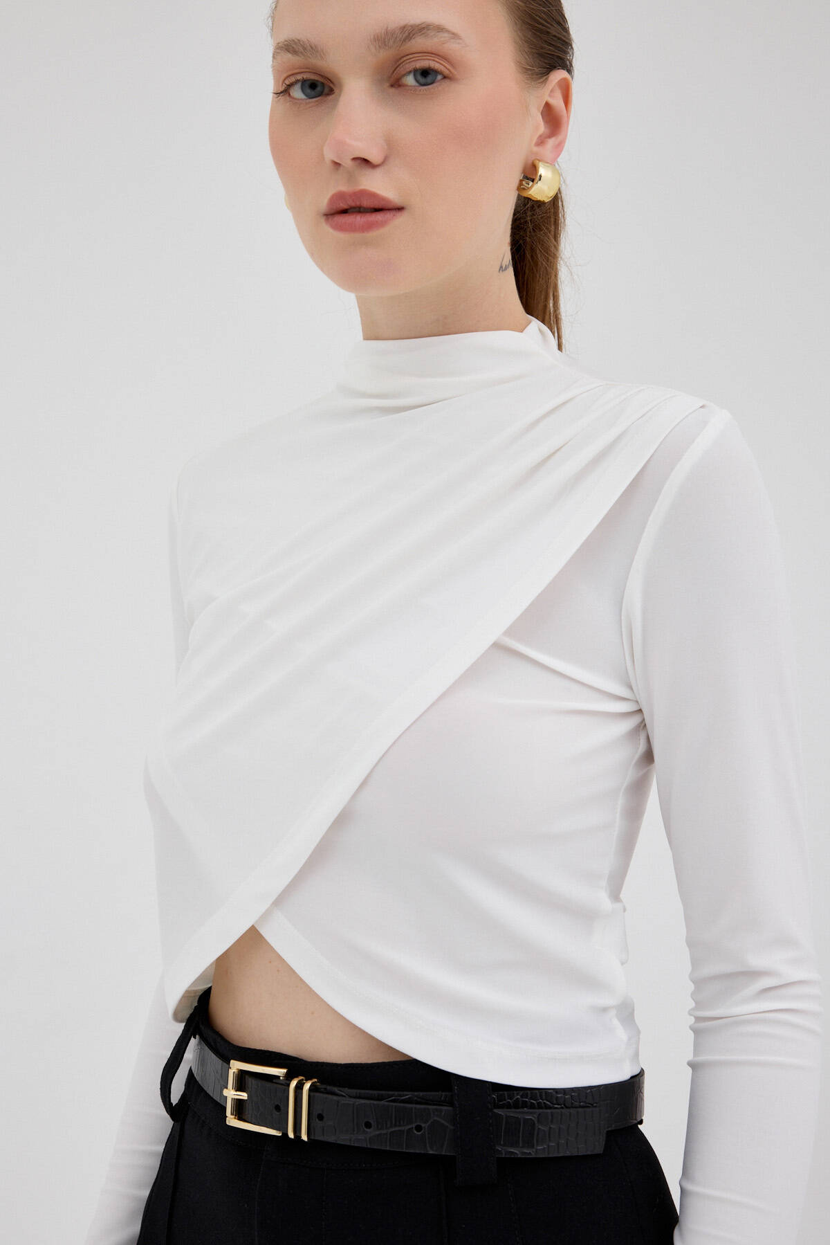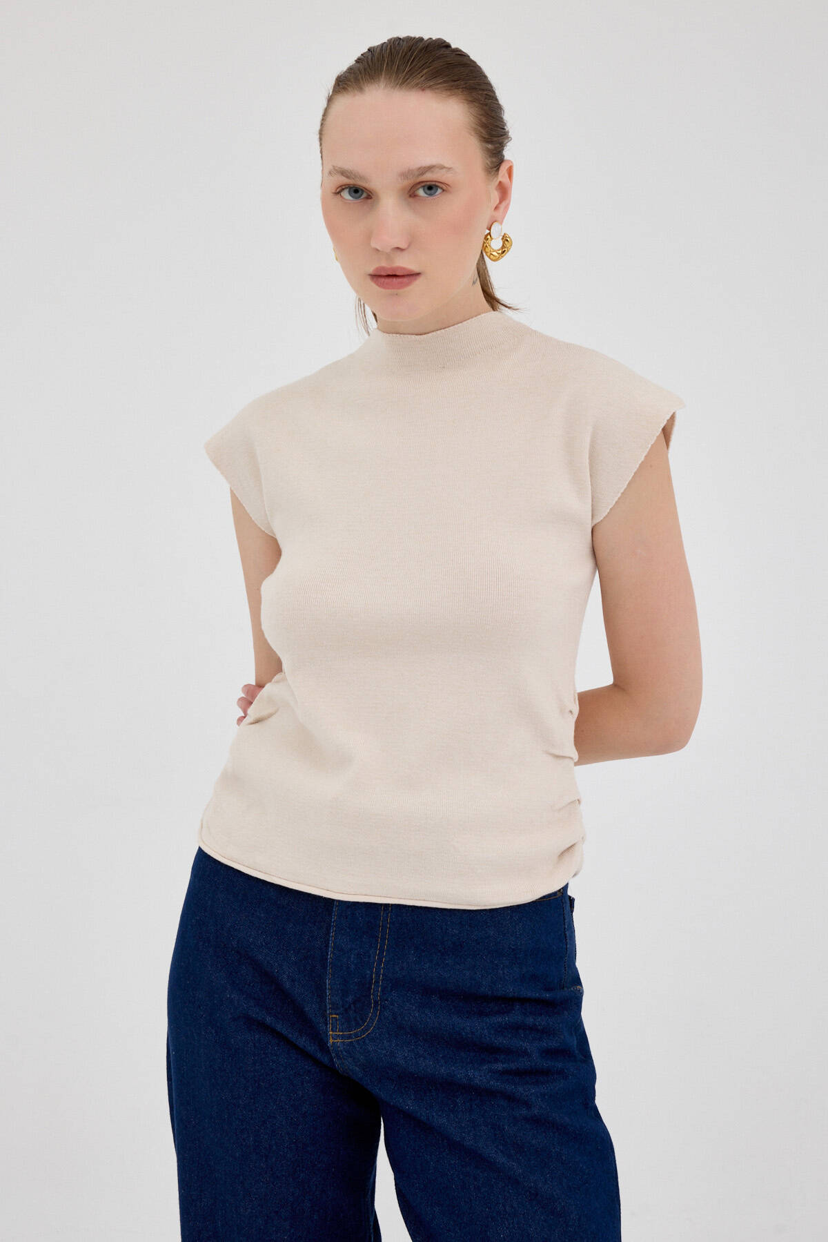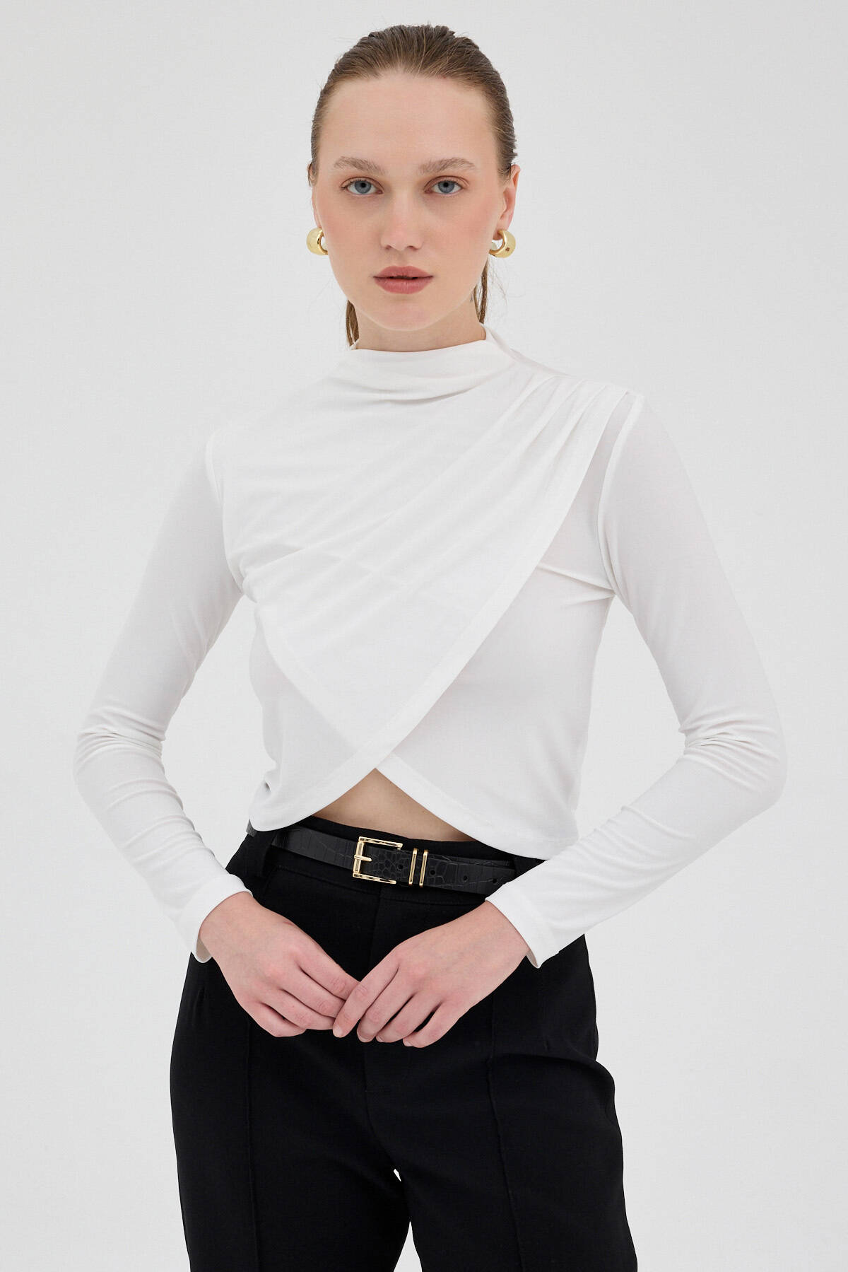 Ekru Drapeli Yüksek Yaka Uzun Kollu Bluz 2379