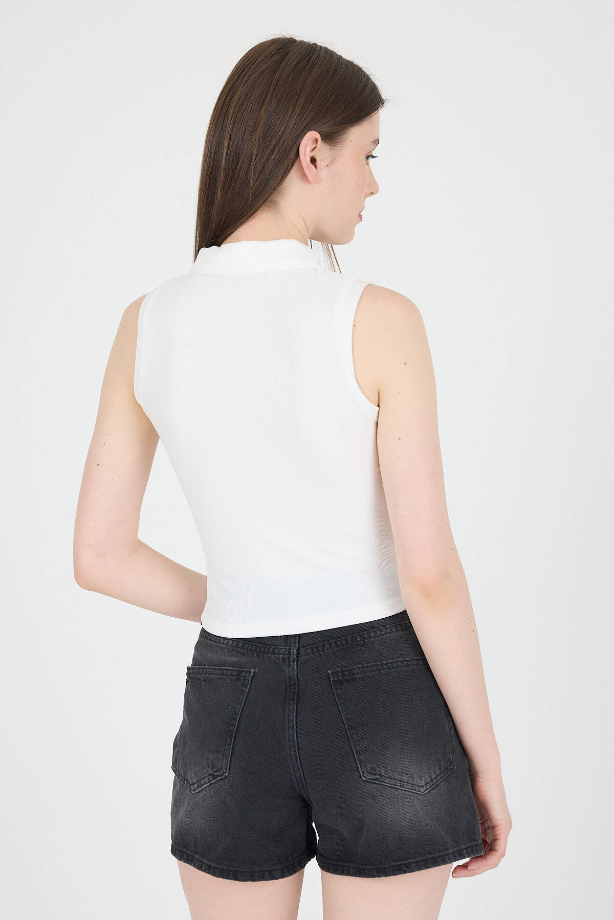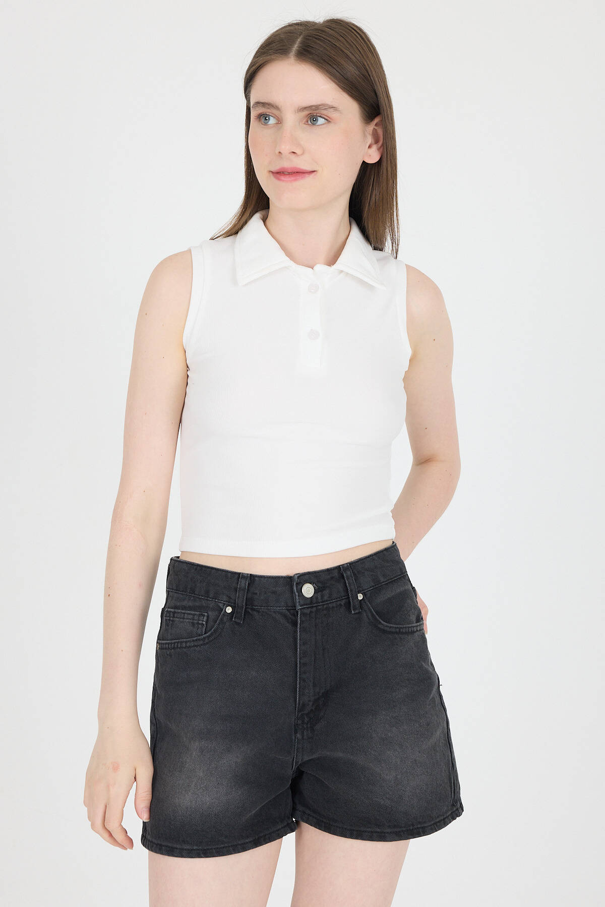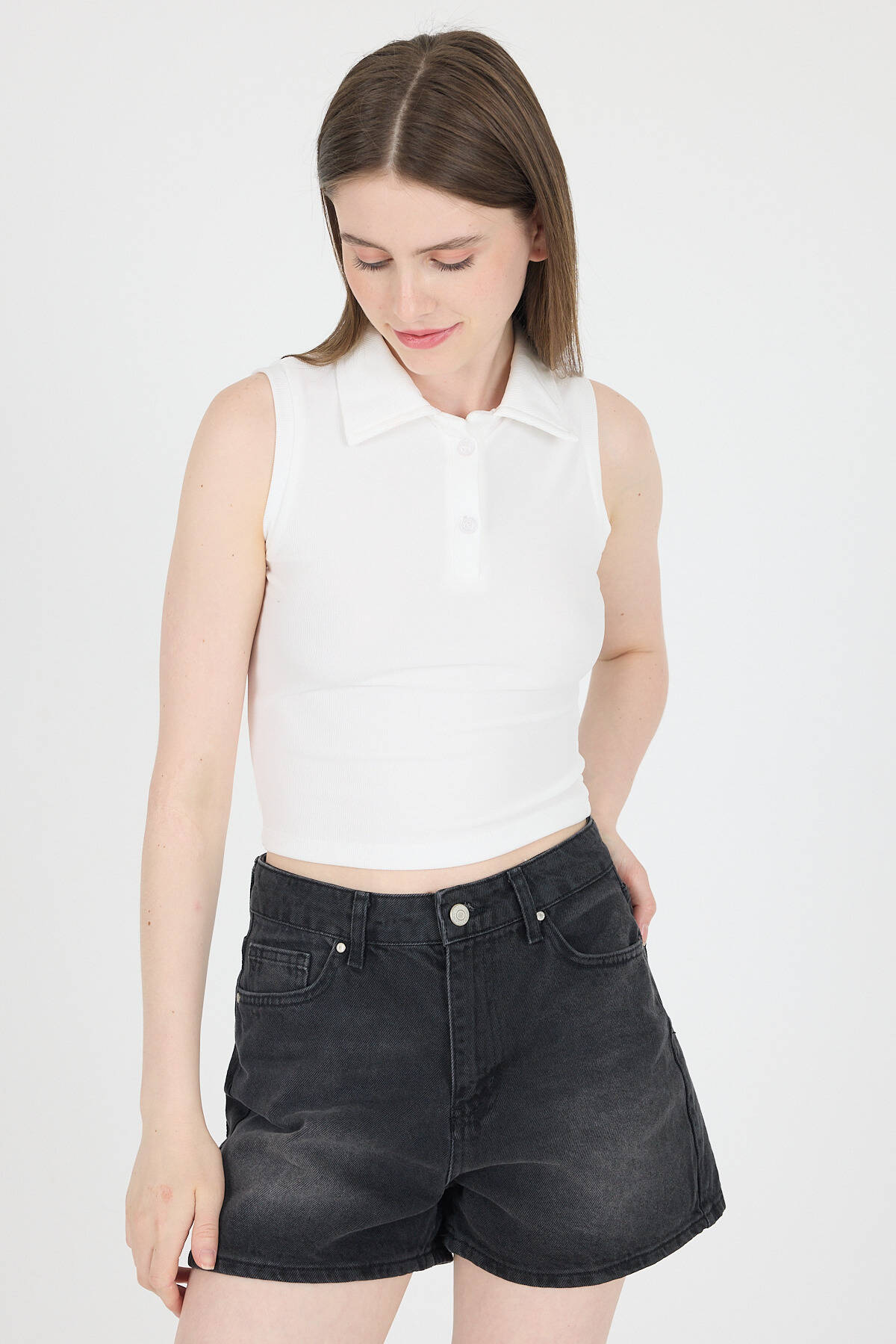 Ekru Düğmeli Polo Yaka Sıfır Kol Örme Bluz 2219