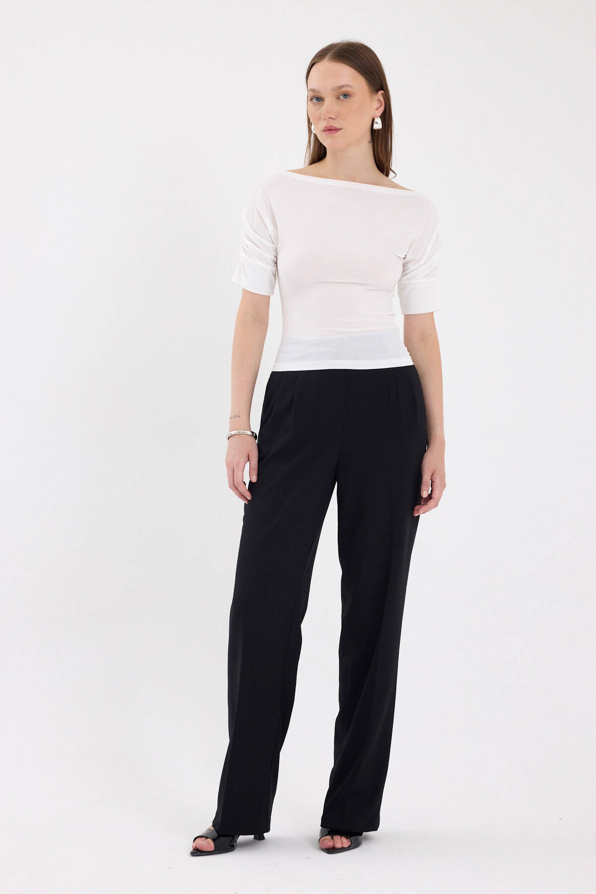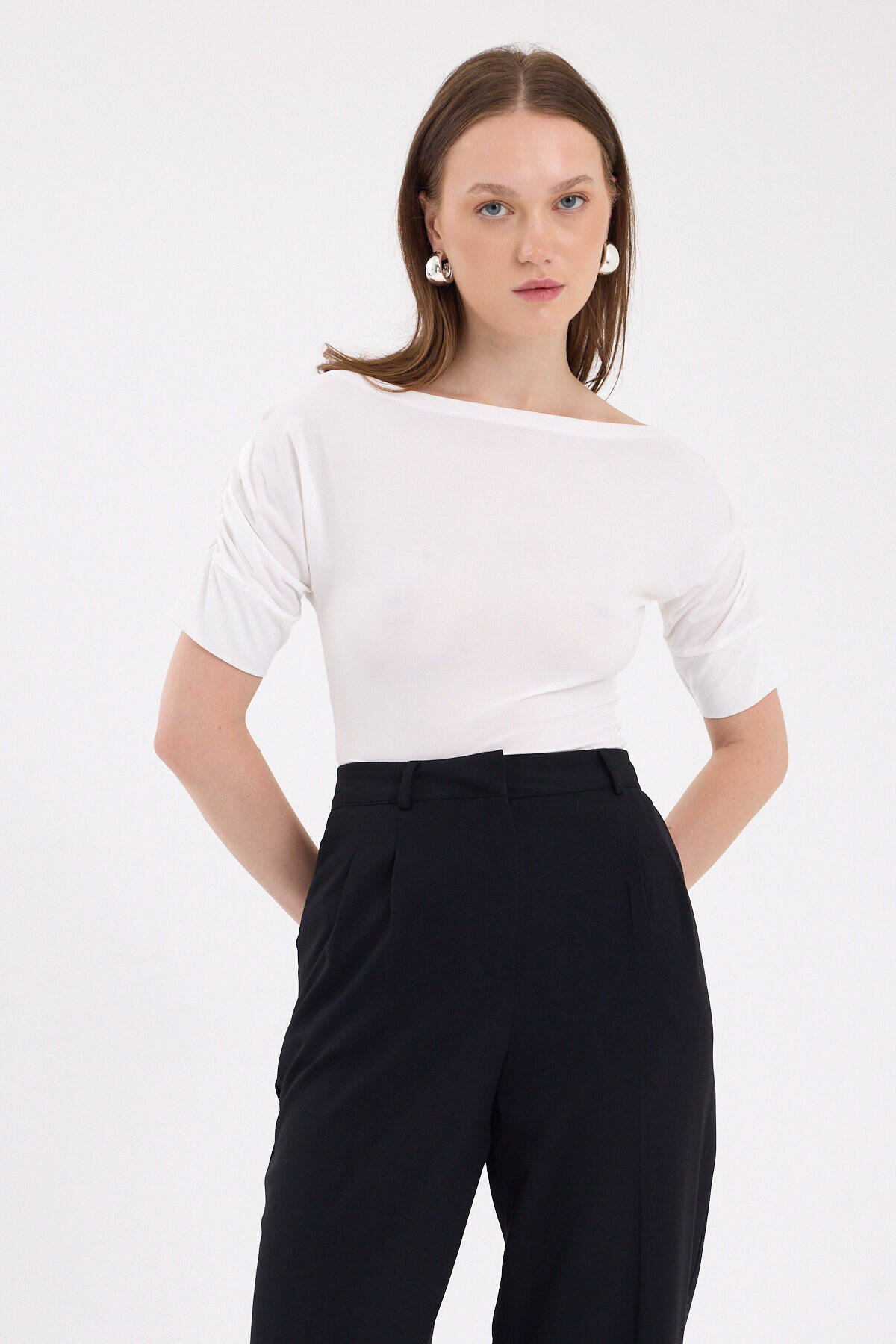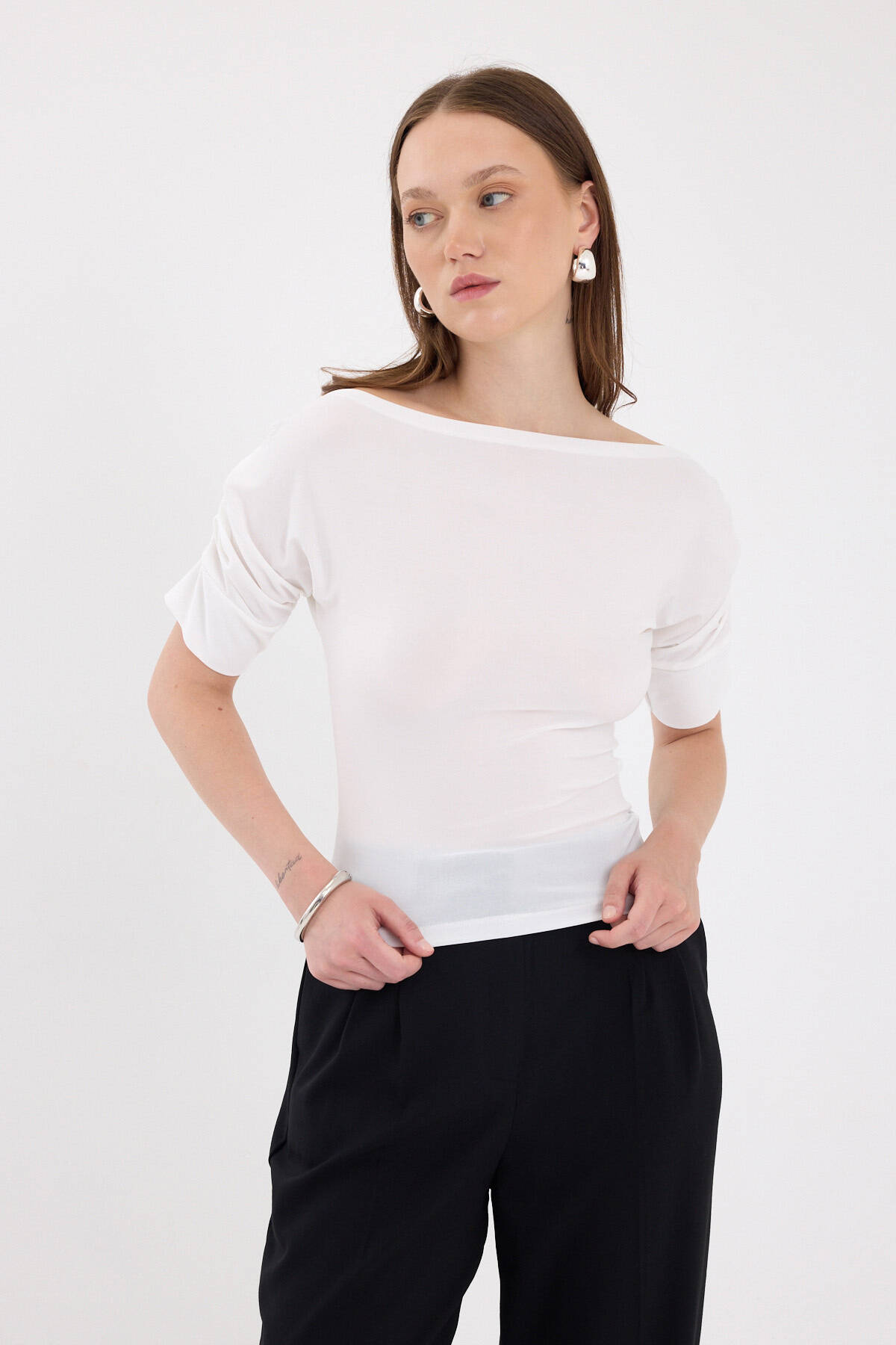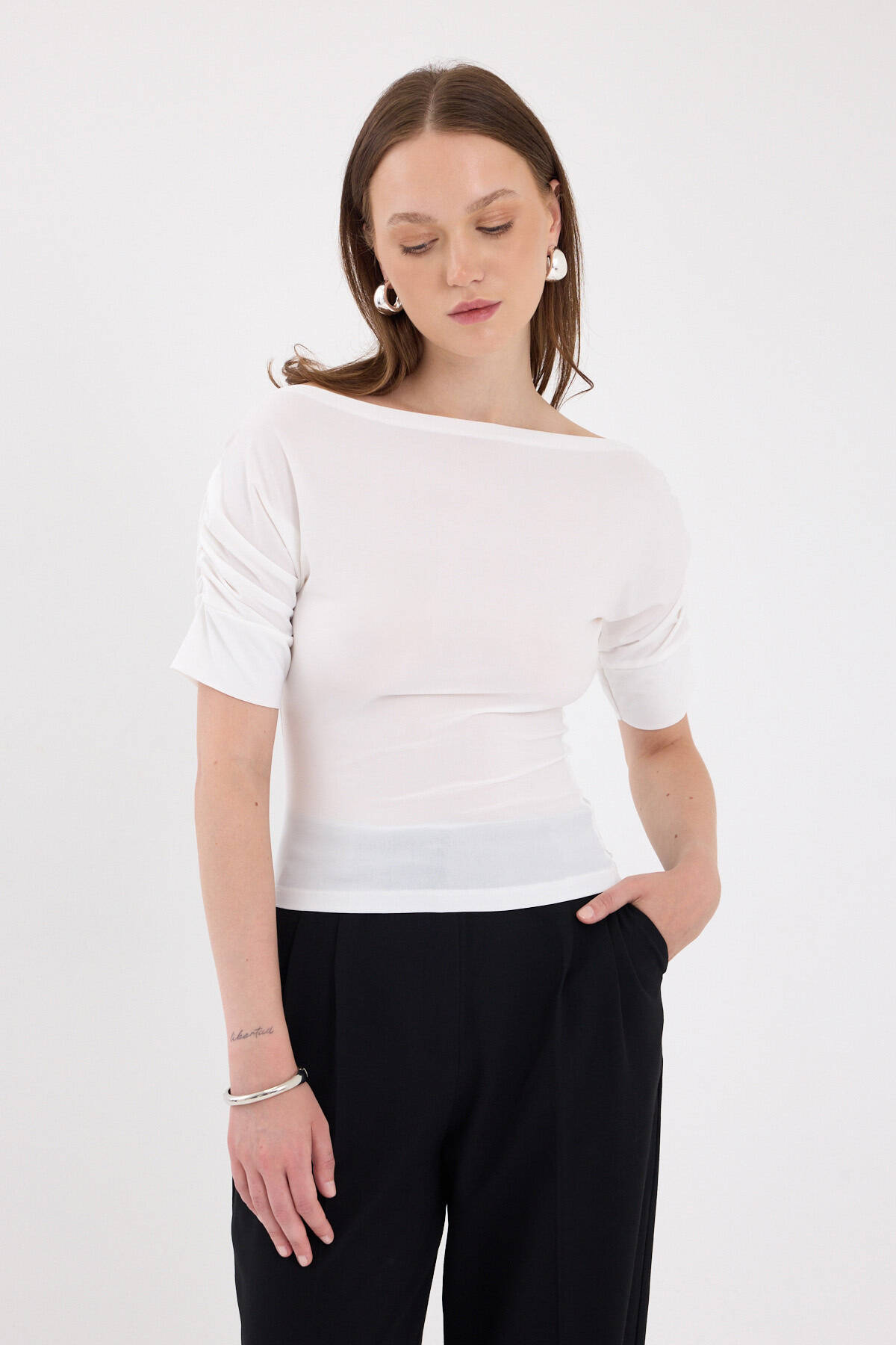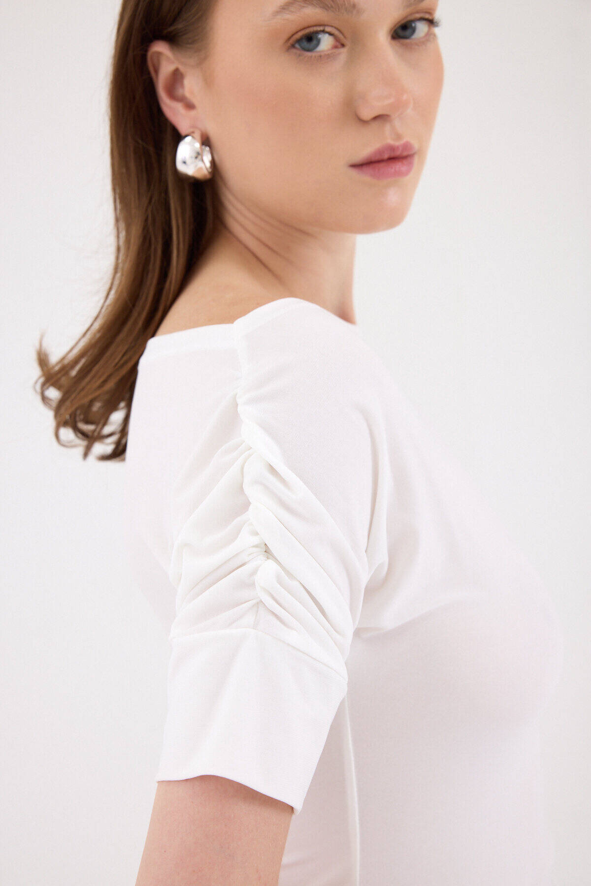 Ekru Kayık Yaka Kol Büzgülü Bluz 2515