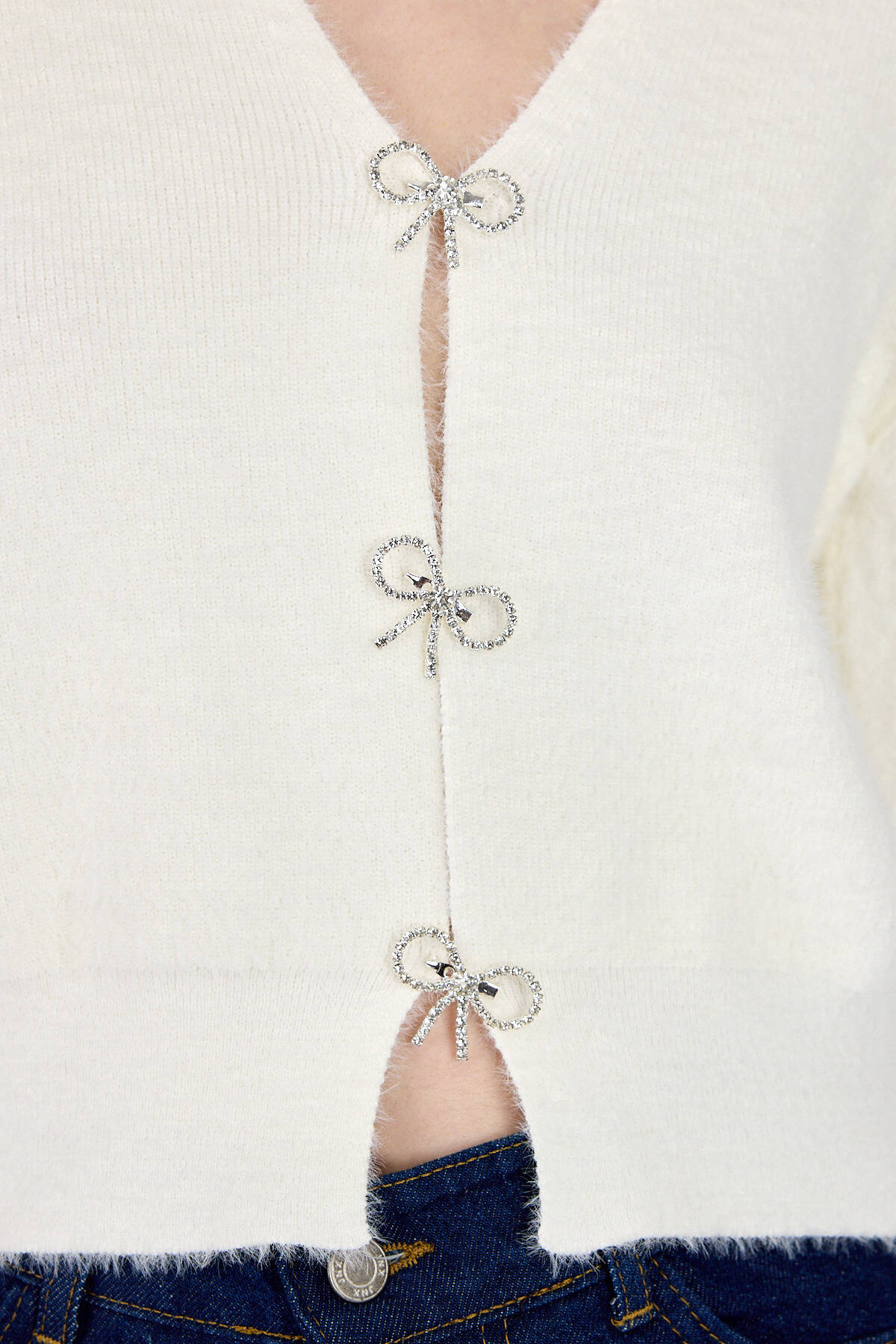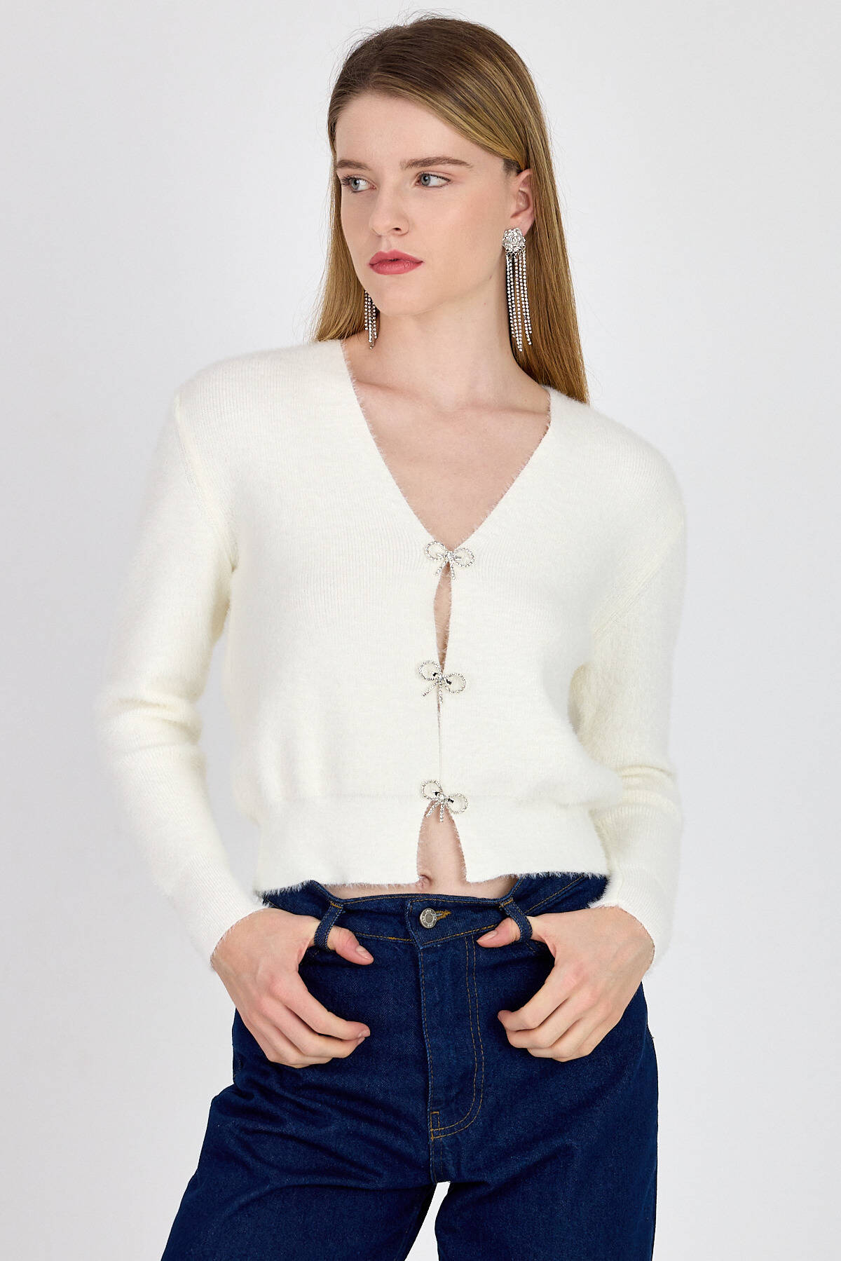 Ekru Taşlı Fiyonk Düğmeli Kadın Triko Hırka 6803