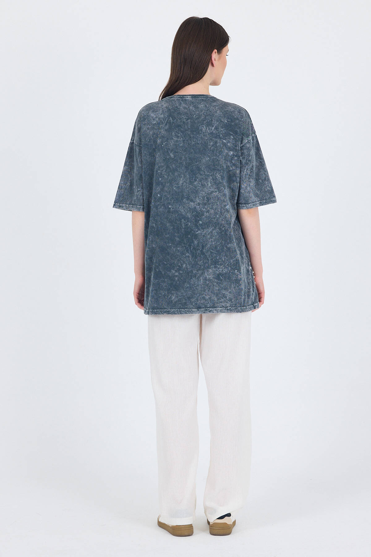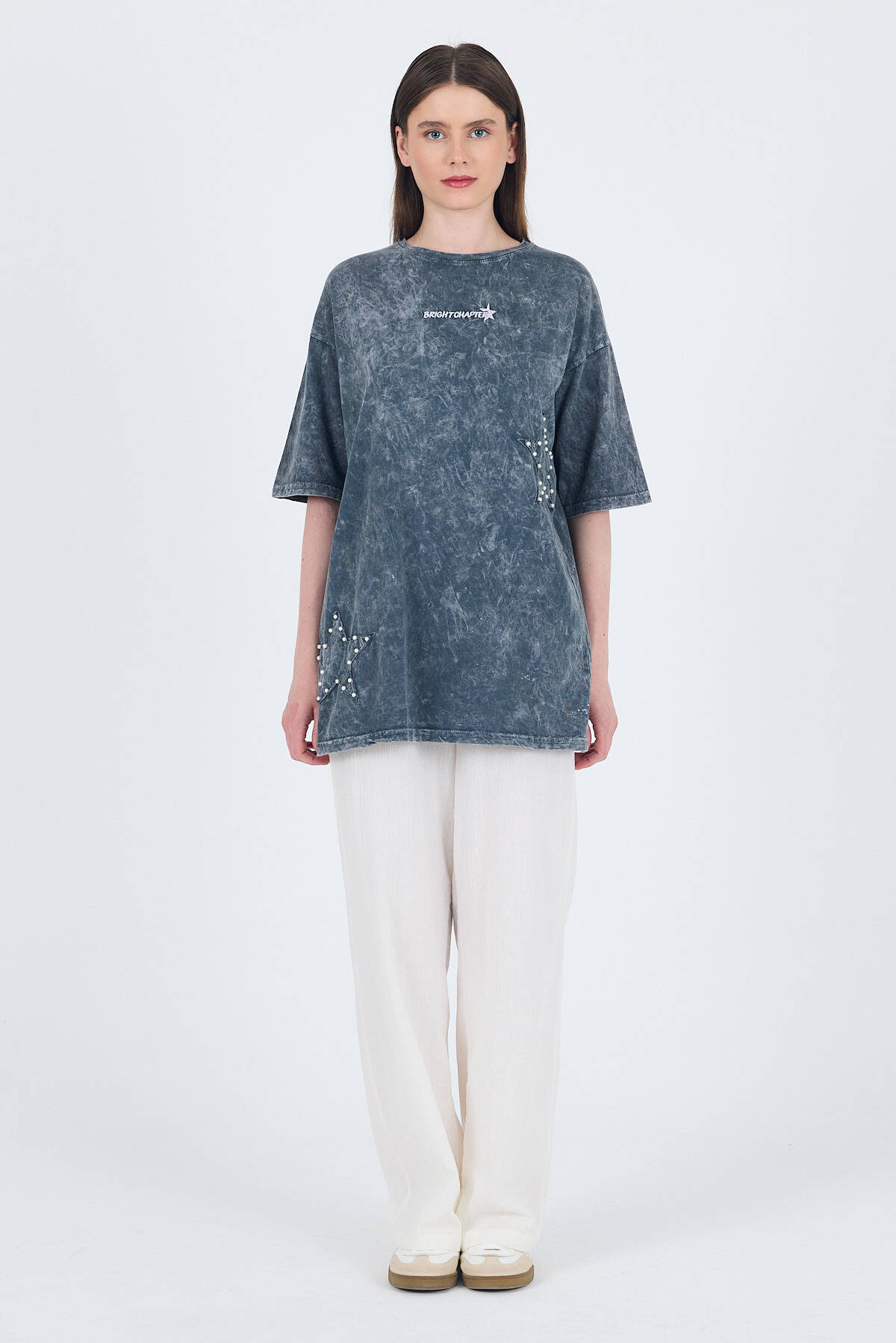 Füme İnci Yıldız Nakışlı Oversize Tişört 253018