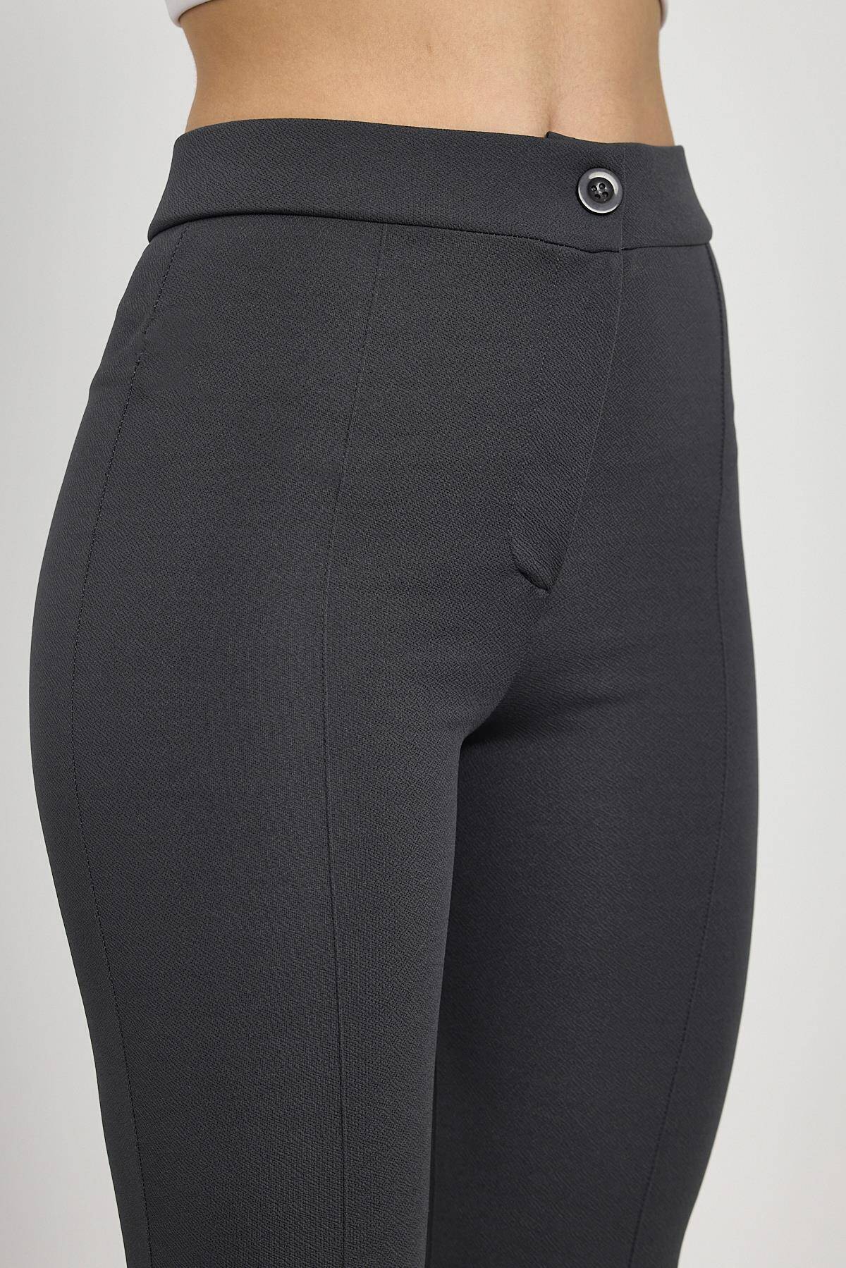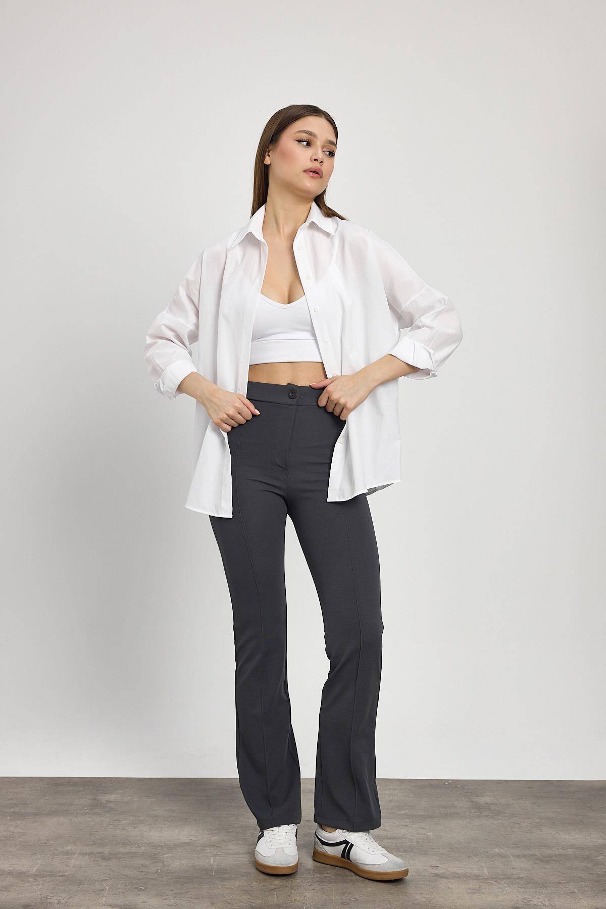 Yüksek bel tasarımıyla modern ve zarif bir görünüm sunar.; ; Nervür dikiş detaylarıyla şıklık katarken, dokuma kumaşıyla dayanıklı ve konforludur.; ; Minimalist cepsiz tasarımıyla sade ve zarif bir stil sağlar.; ; Füme rengi, kolayca kombinlenebilen zamansız bir seçenektir.; ; Düz paça kesimi vücut hatlarını nazikçe sarar, günlük ve şık kombinlere uyum sağlar.; ; Hem günlük kullanım hem de özel günler için ideal bir tercih.