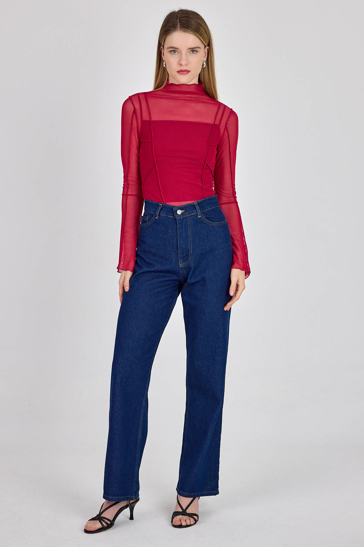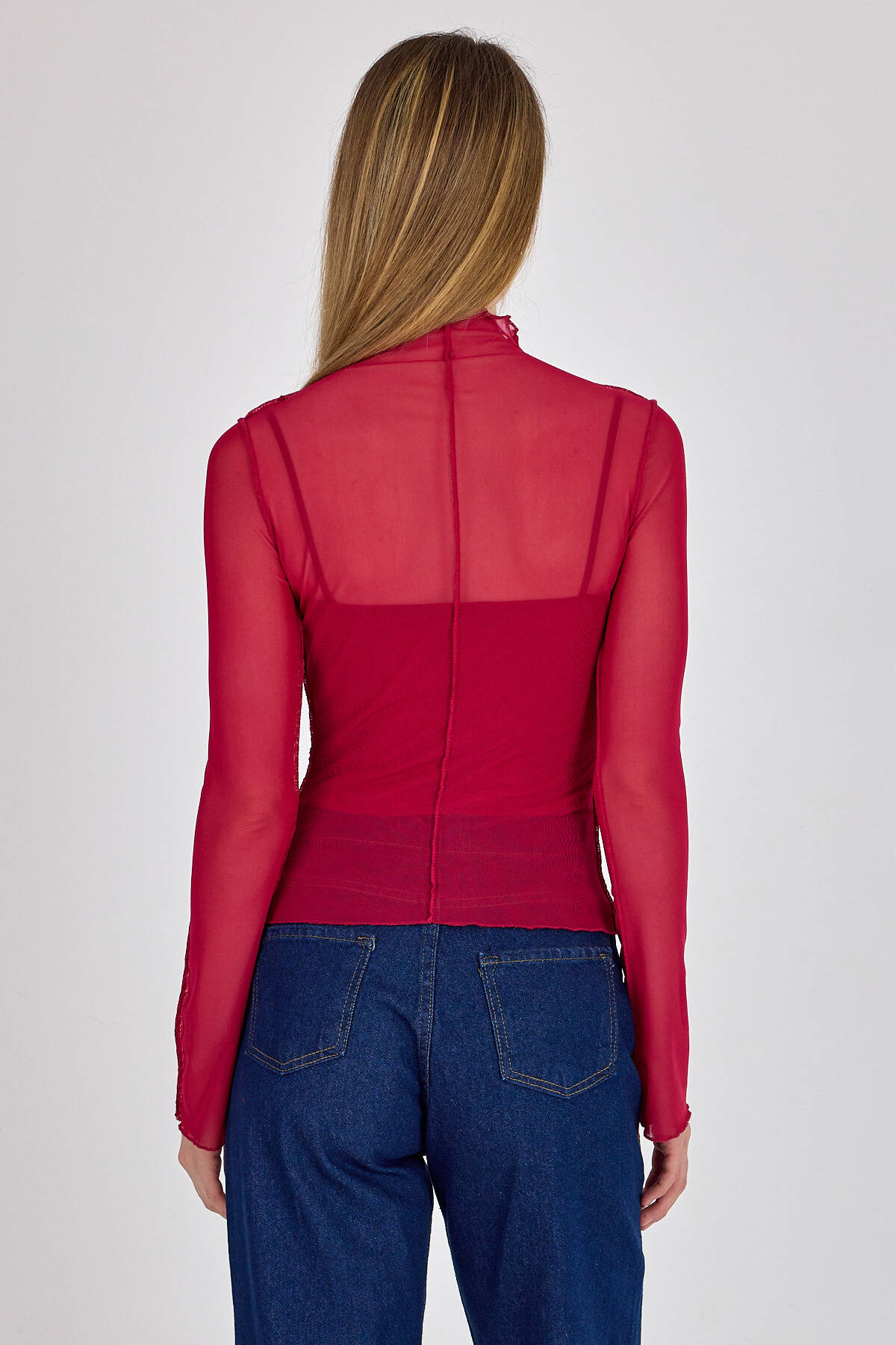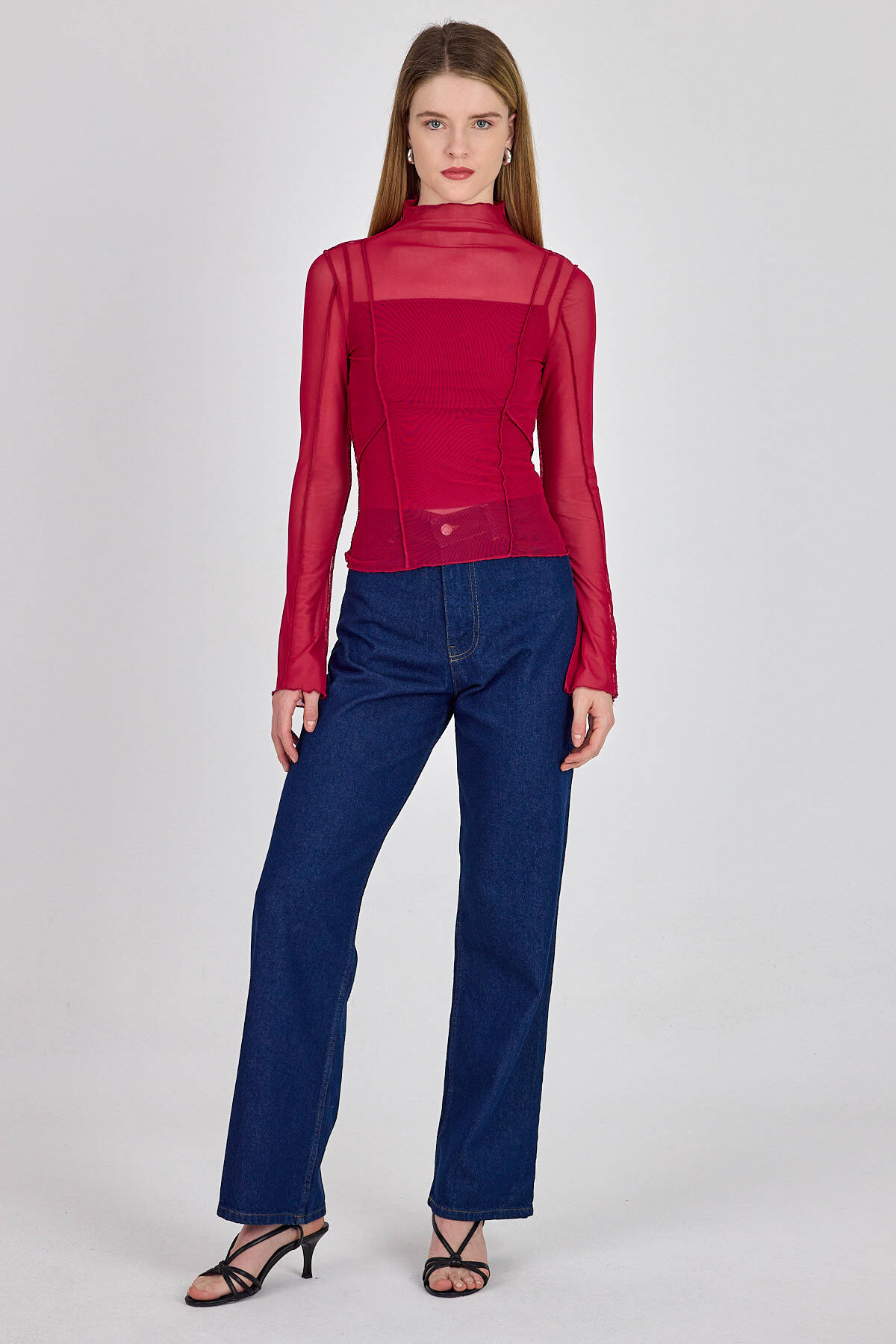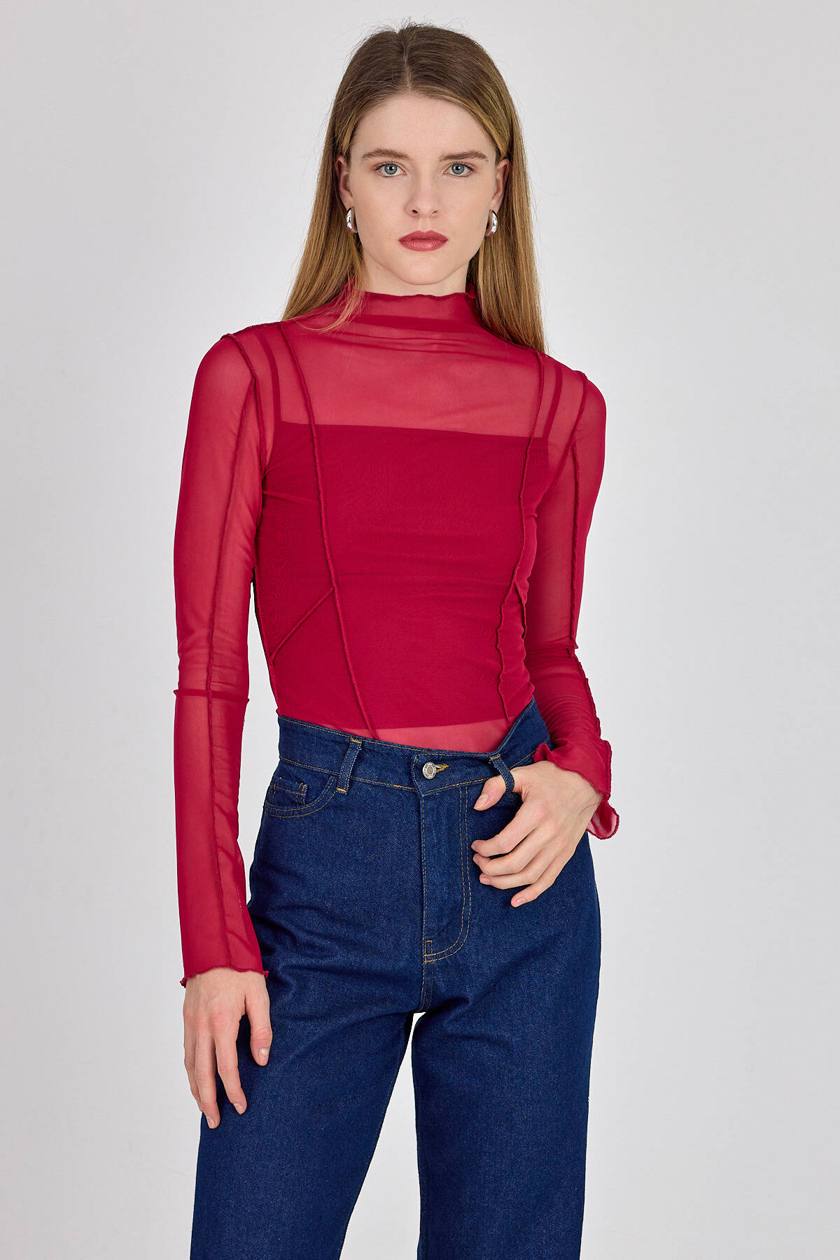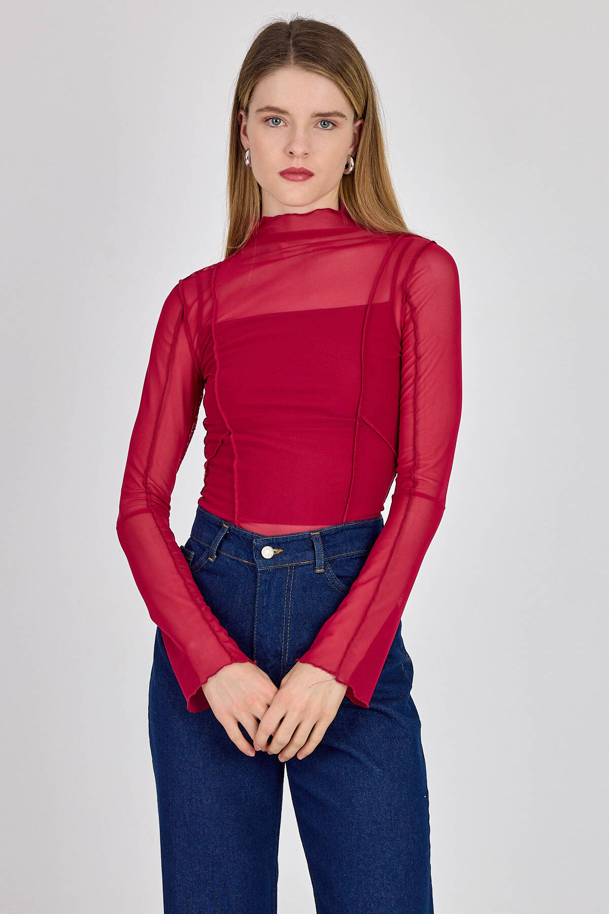 Fuşya Dikiş Detaylı Uzun Kollu Tül Bluz 233163