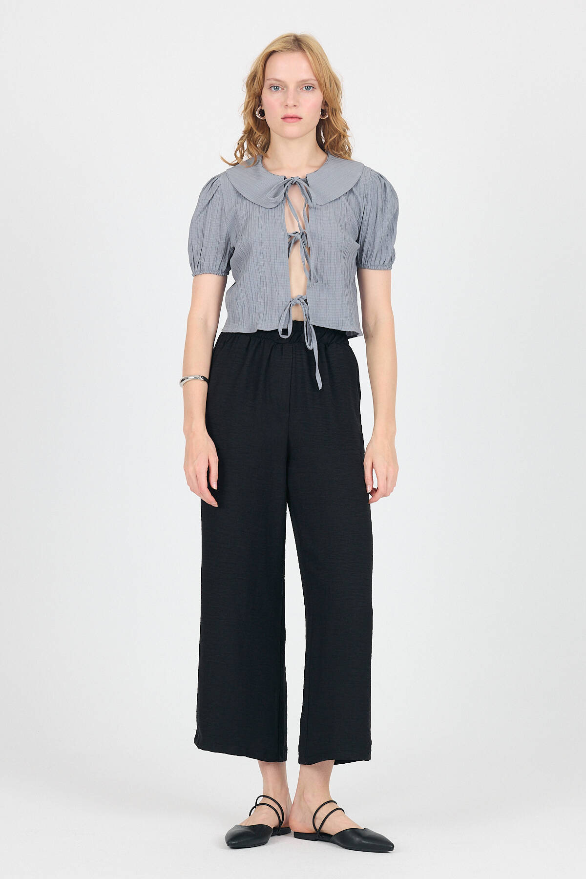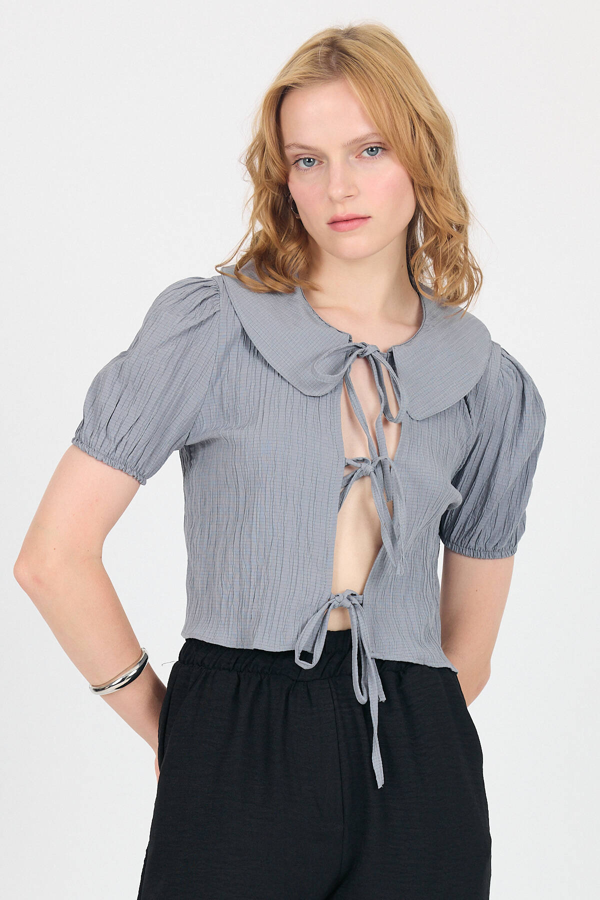 Gri Bağlama Detaylı Bebe Yaka Crop Bluz 8064