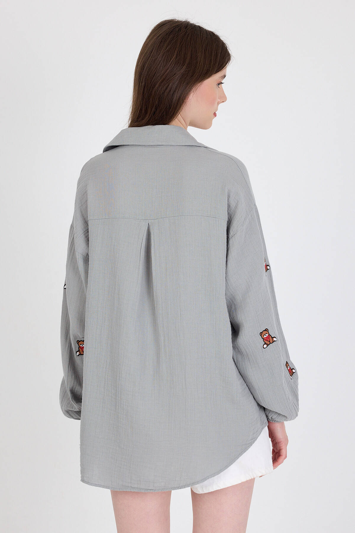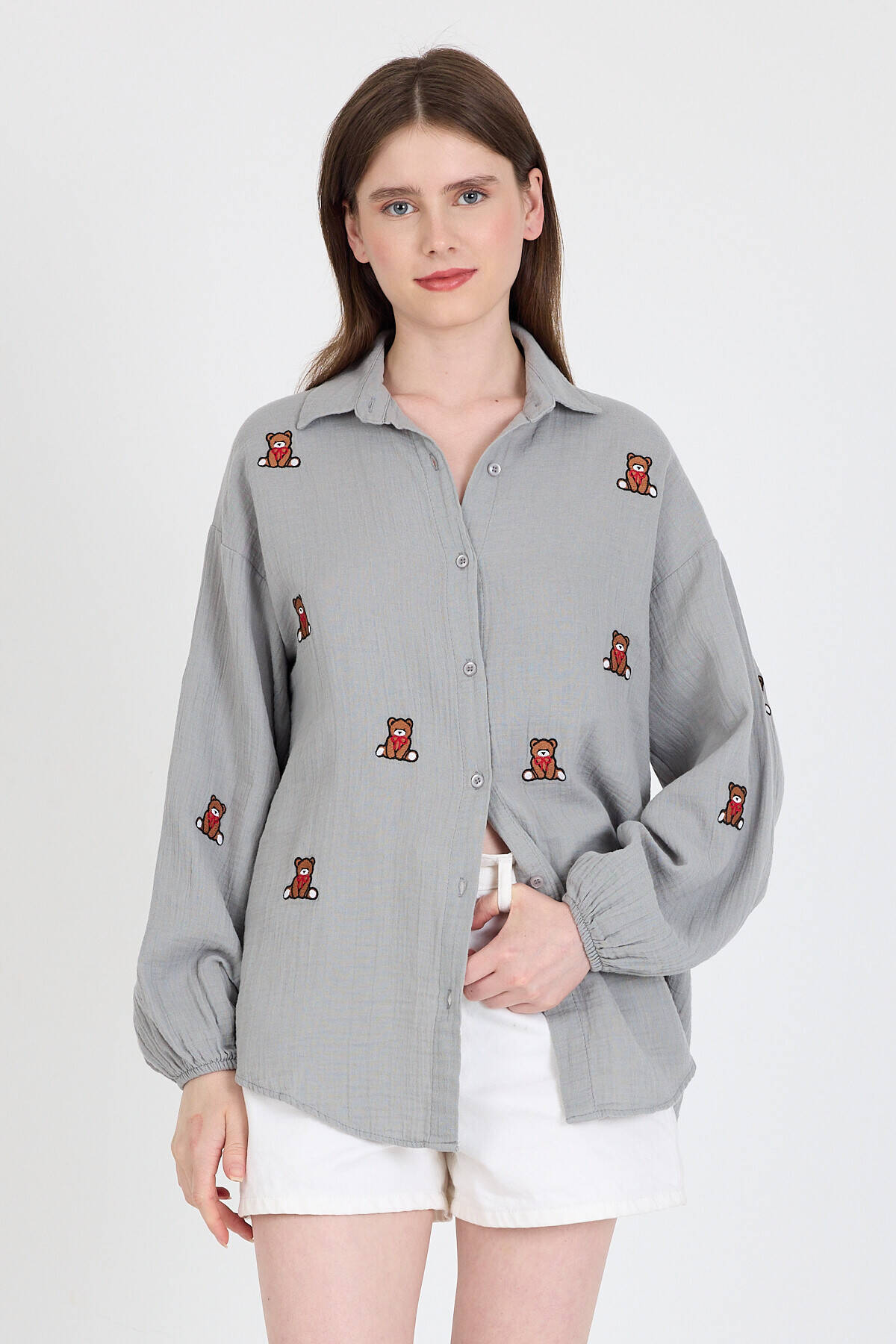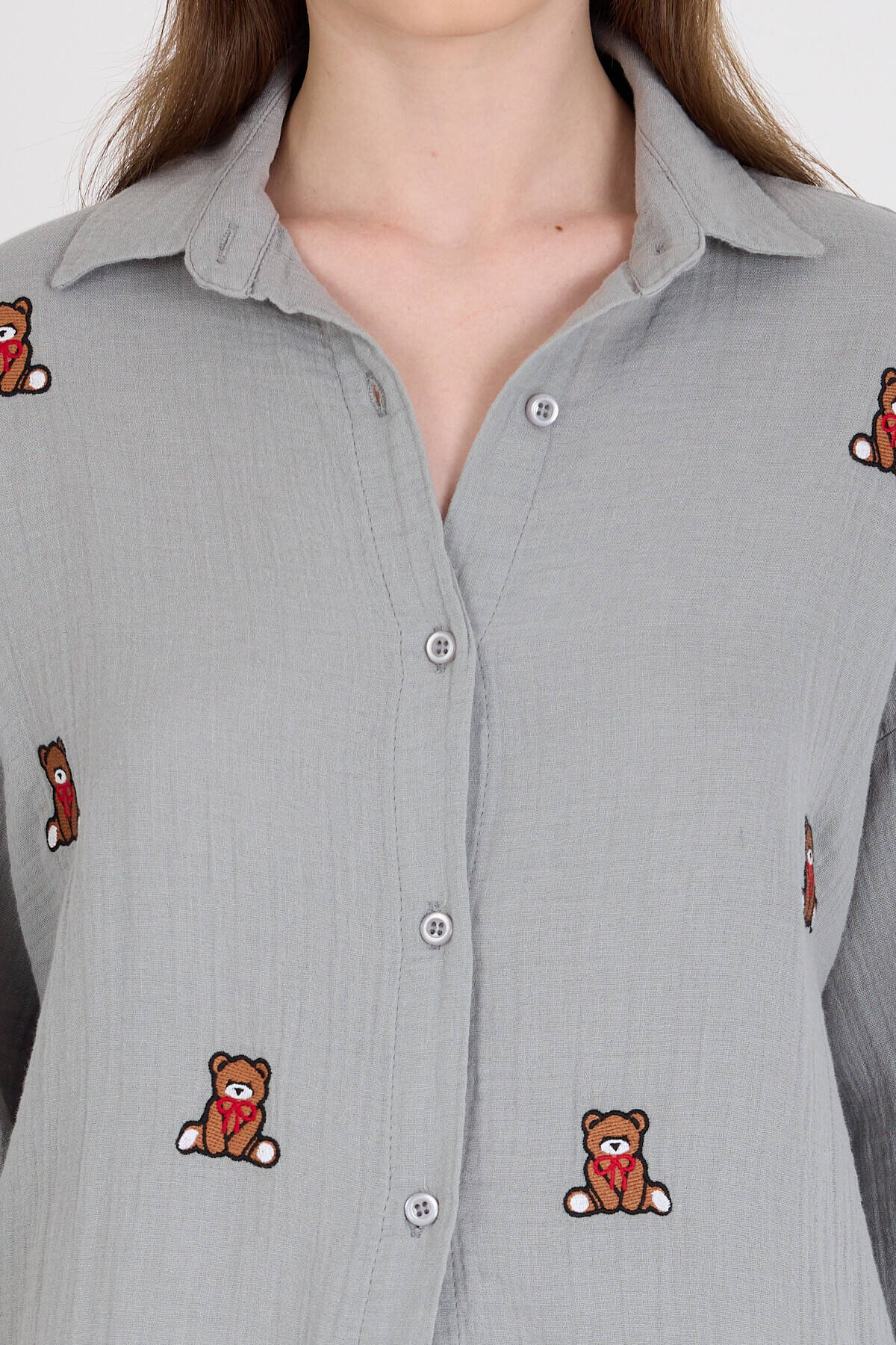 Gri Keten Görünümlü %100 Pamuk Ayıcık Nakışlı Gömlek 4798A