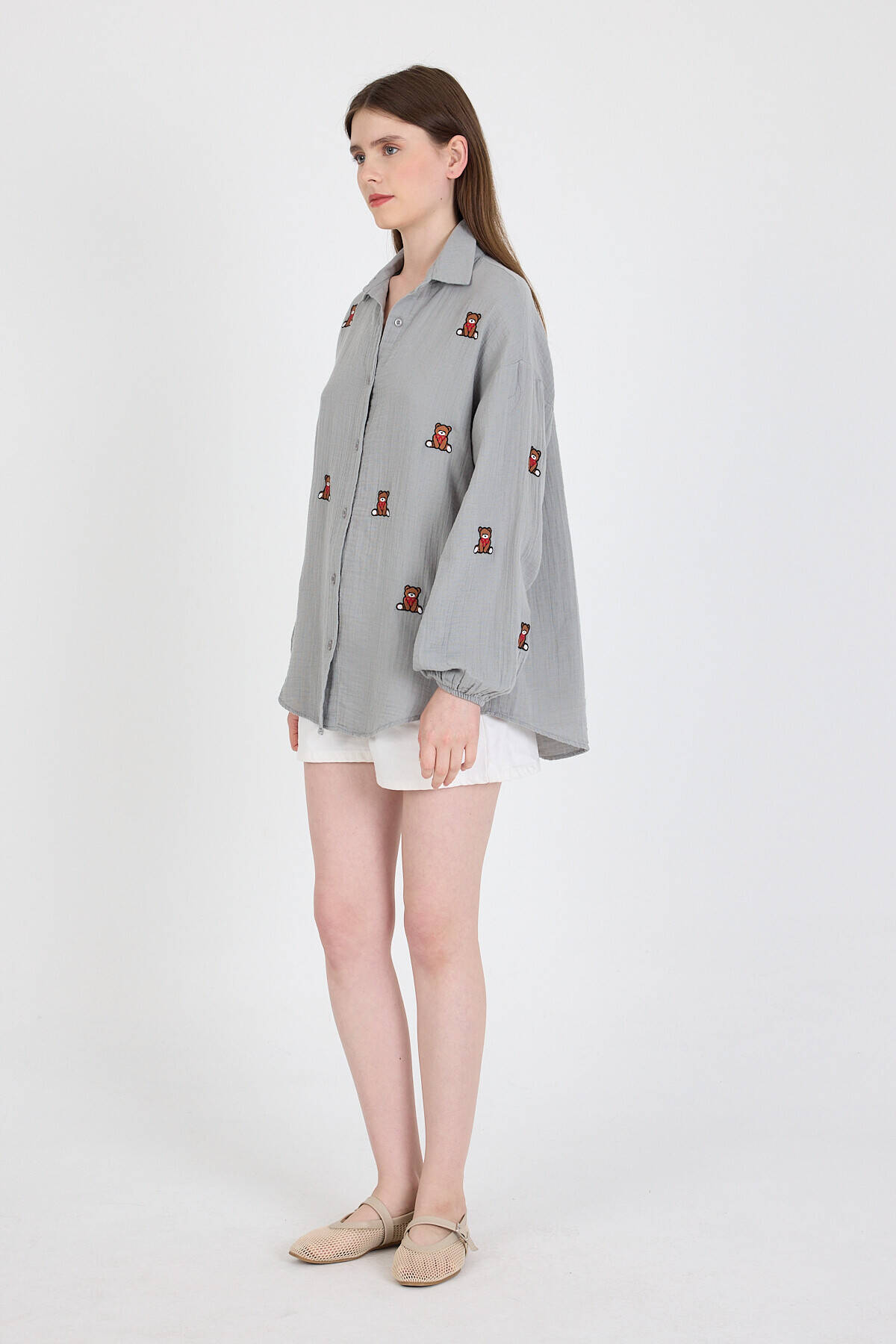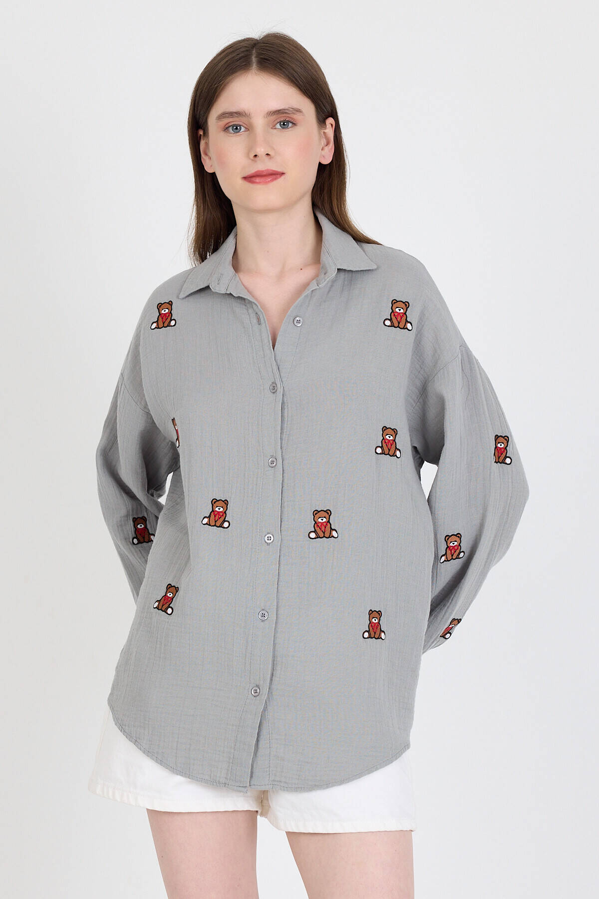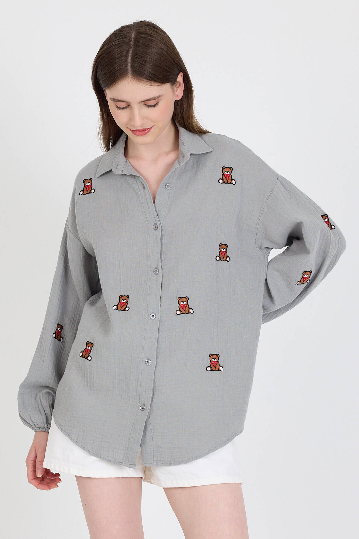 Gri Keten Görünümlü %100 Pamuk Ayıcık Nakışlı Gömlek 4798A