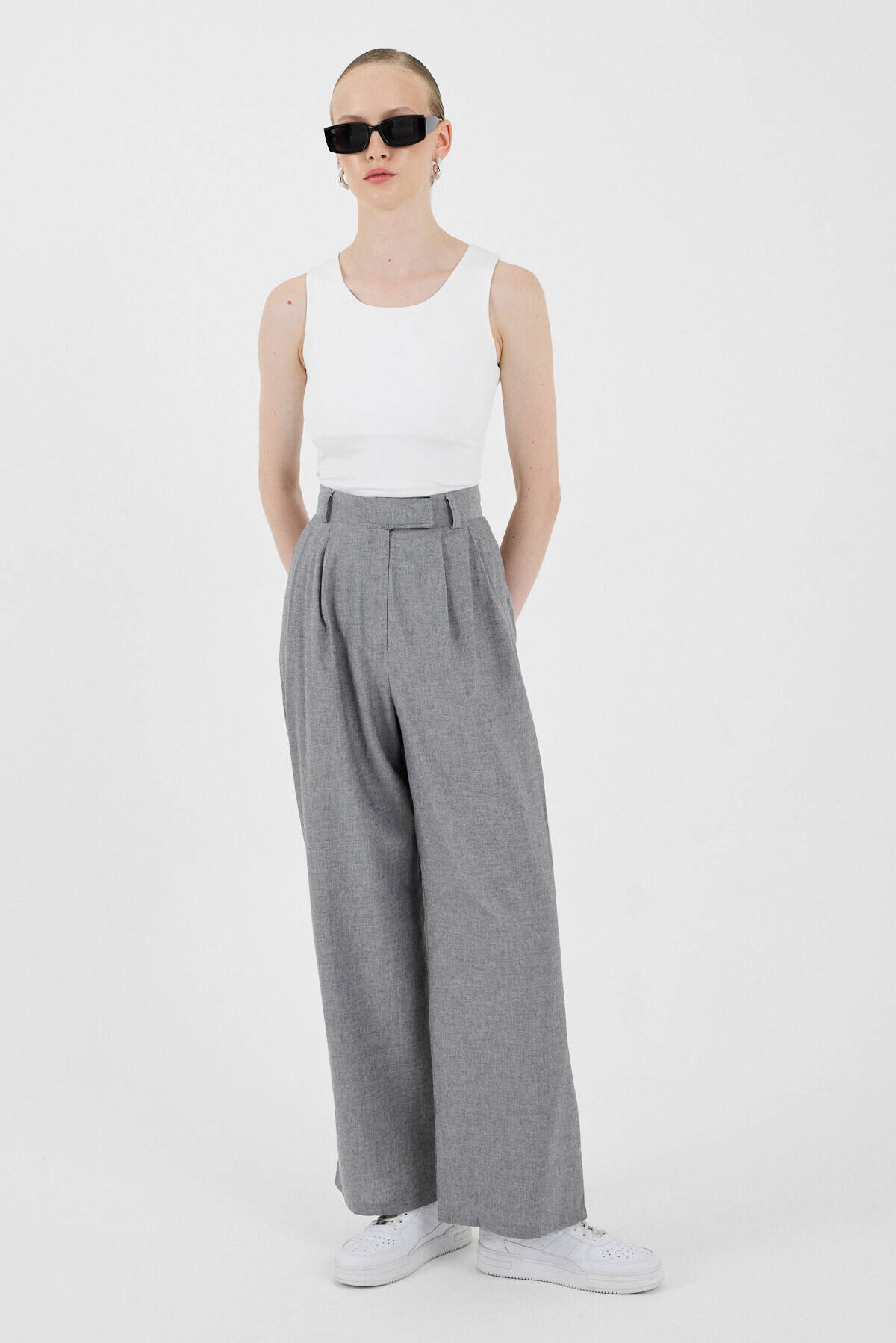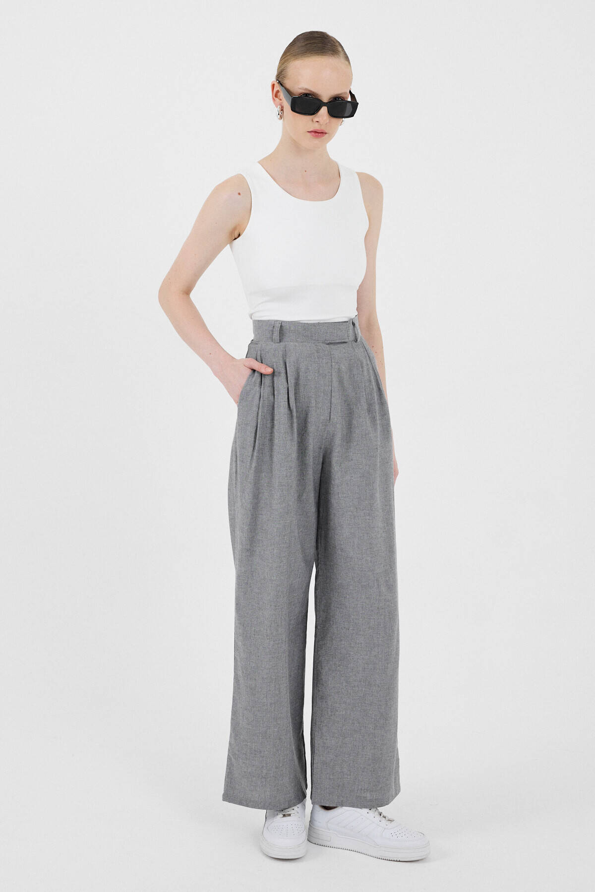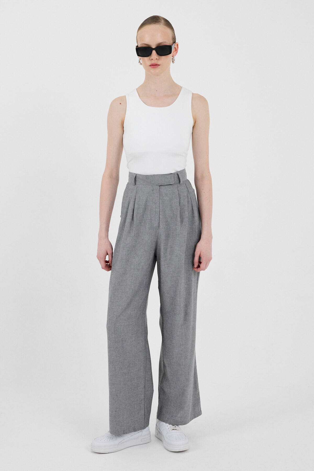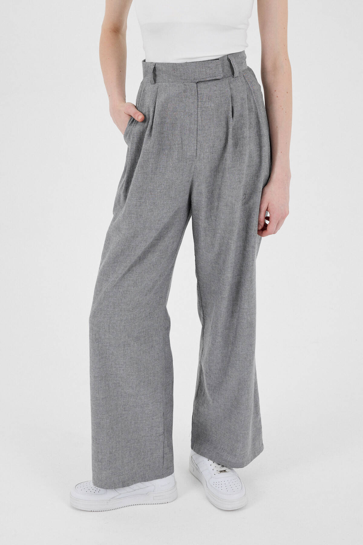 Gri Yüksek Bel Cırt Kapama Detaylı Pamuklu Palazzo Pantolon 8062A