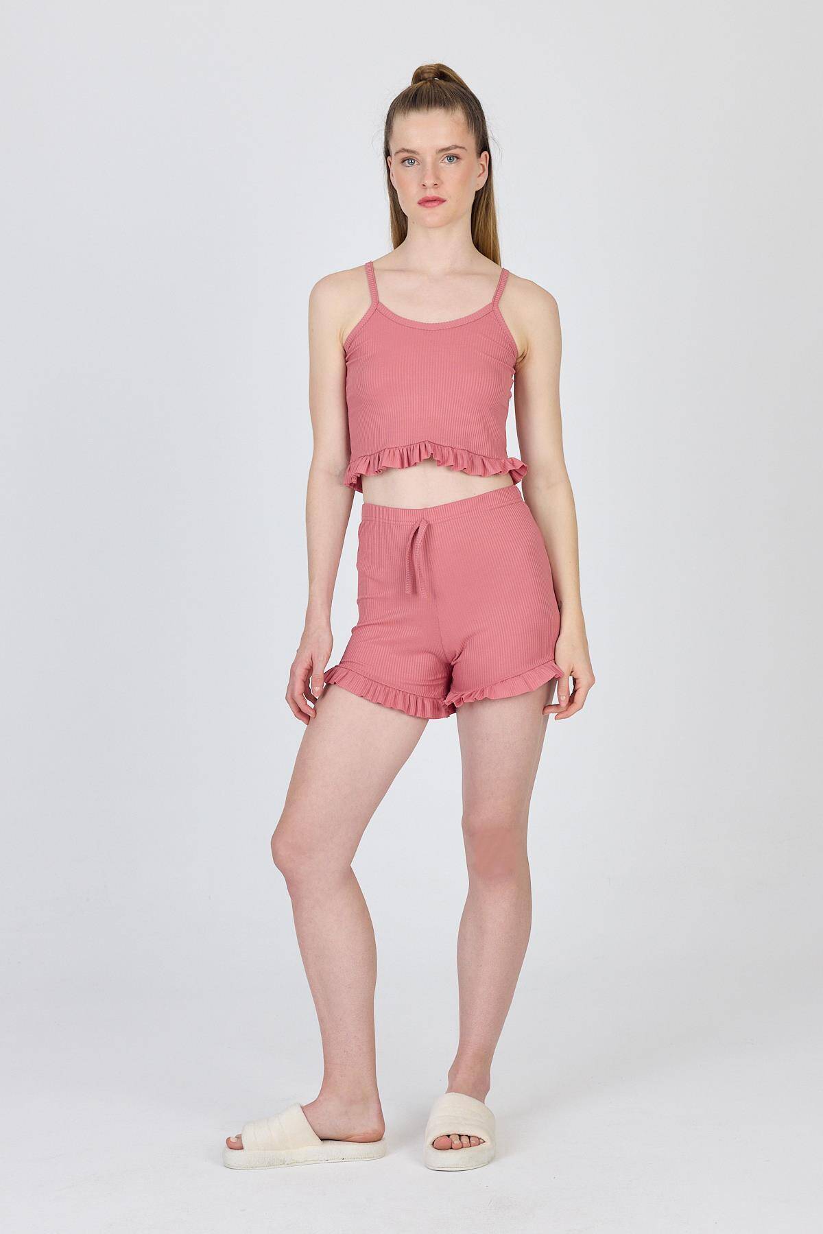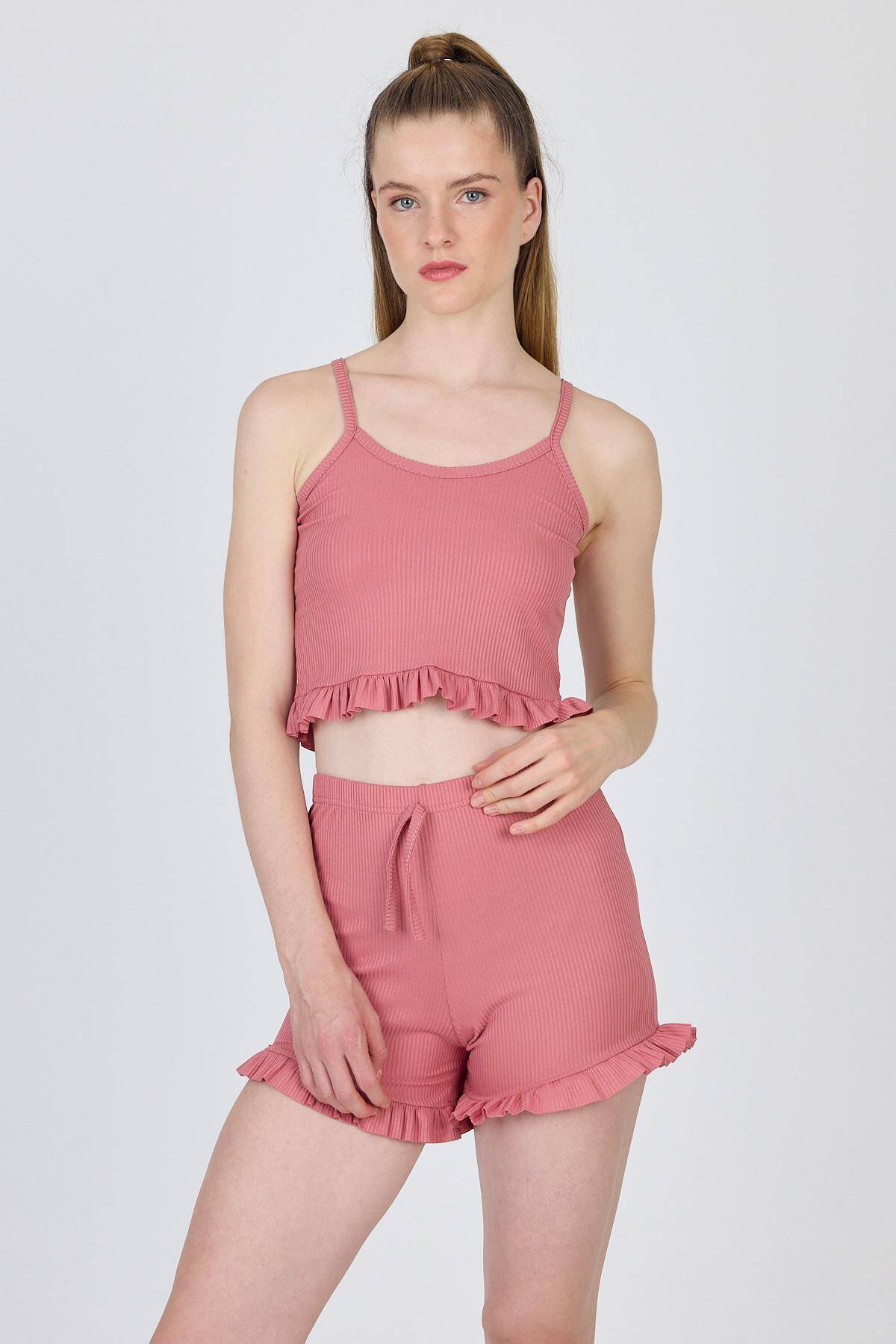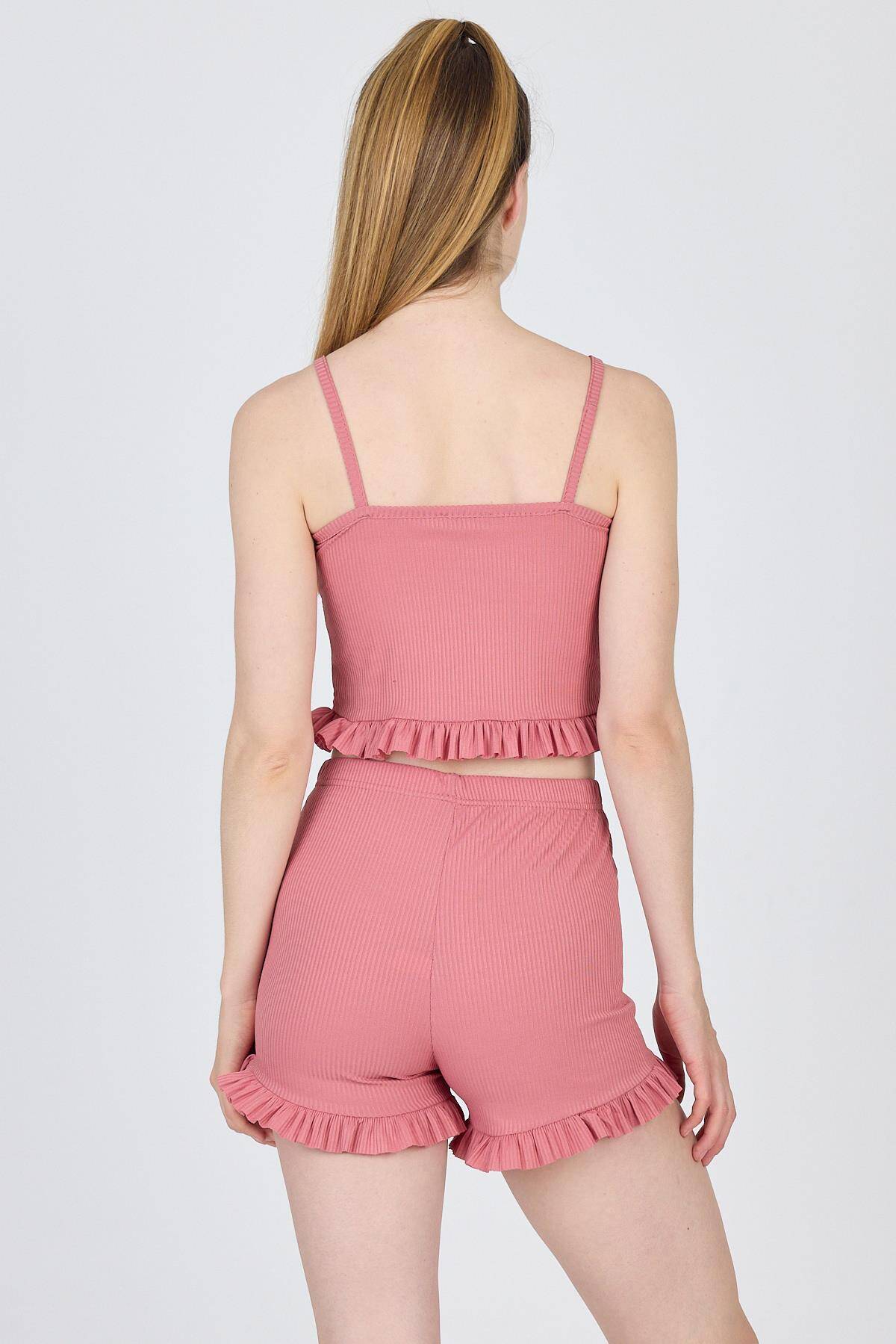 Gül Kurusu İp Askılı Fırfırlı Şortlu Takım 0703