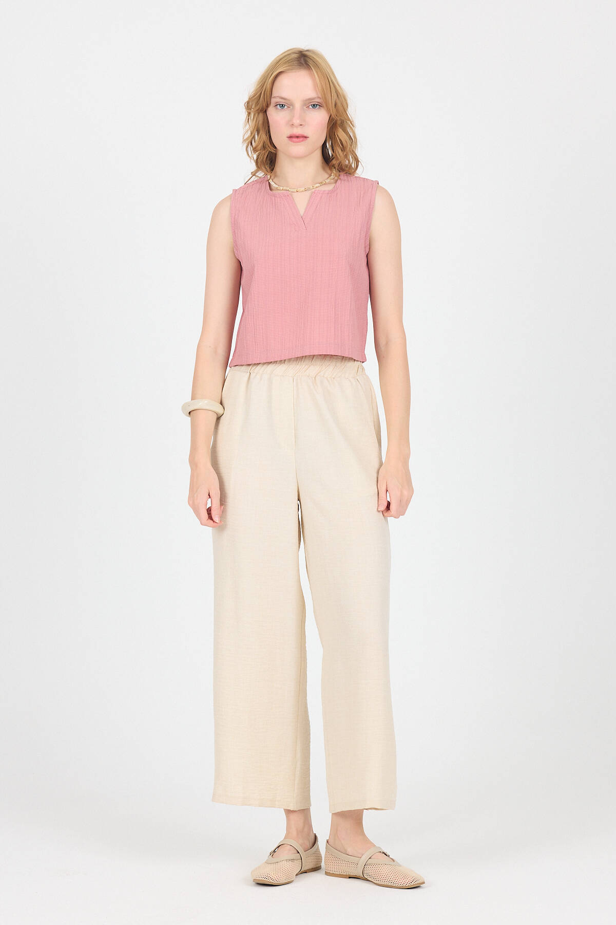 Gül V Yaka Kolsuz Crop Bluz 8027