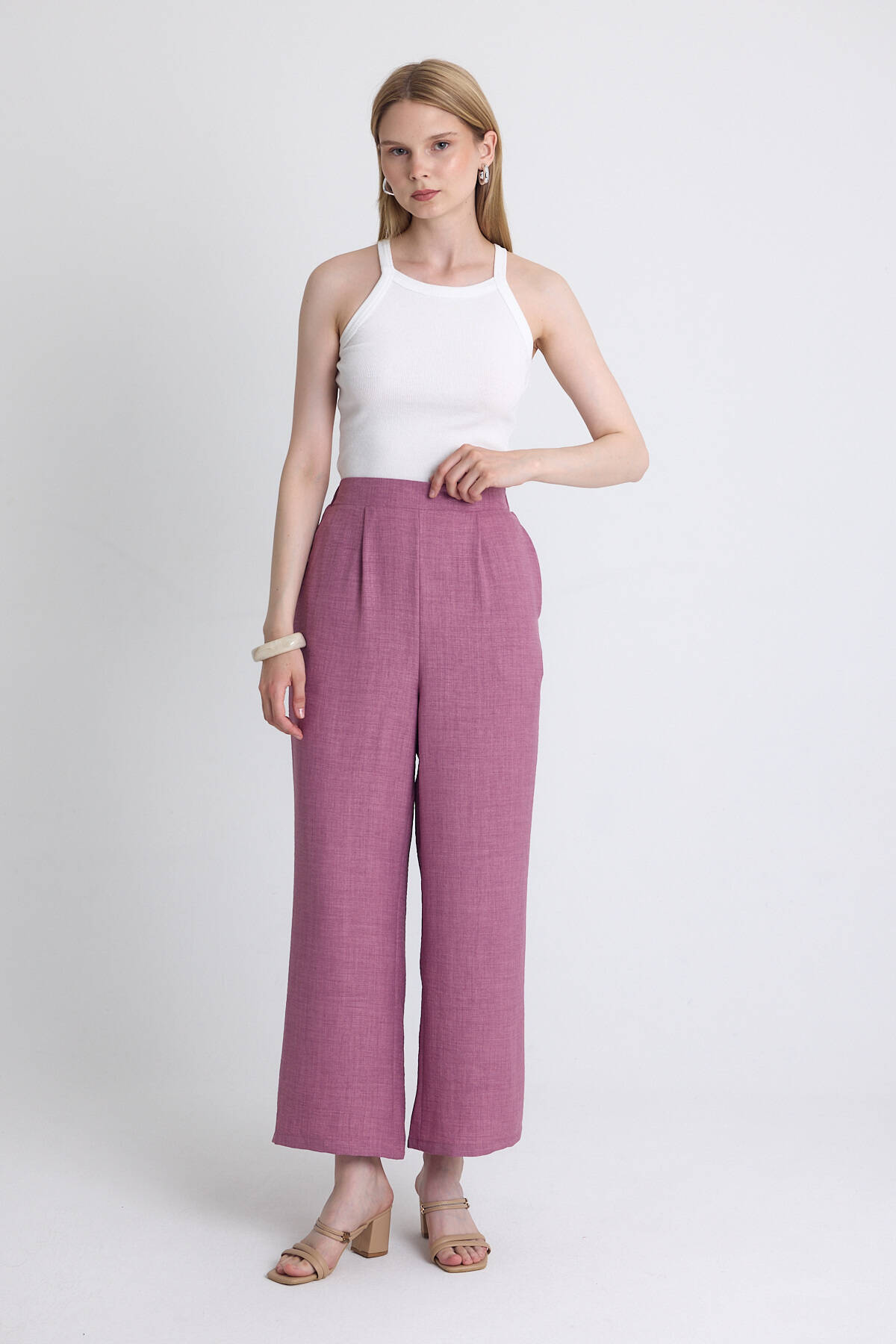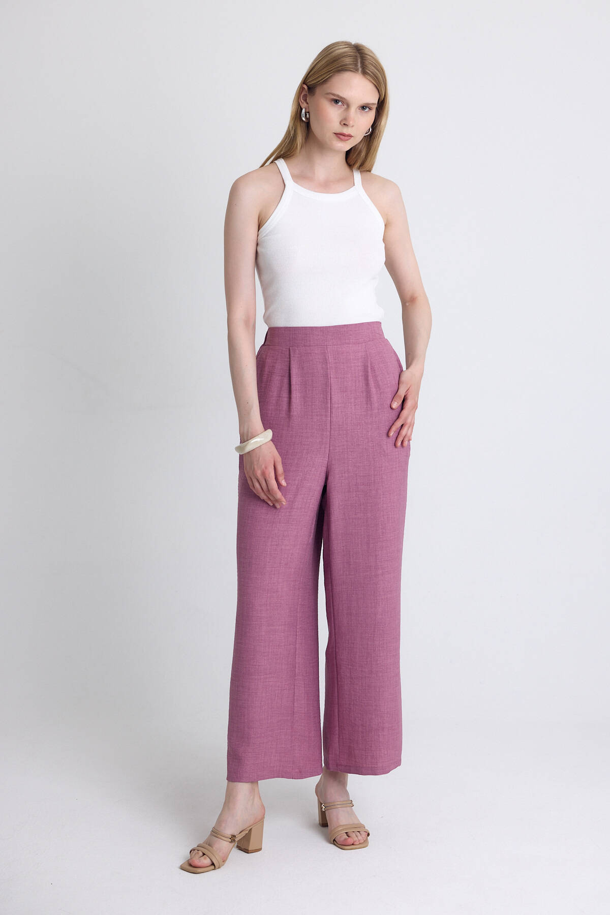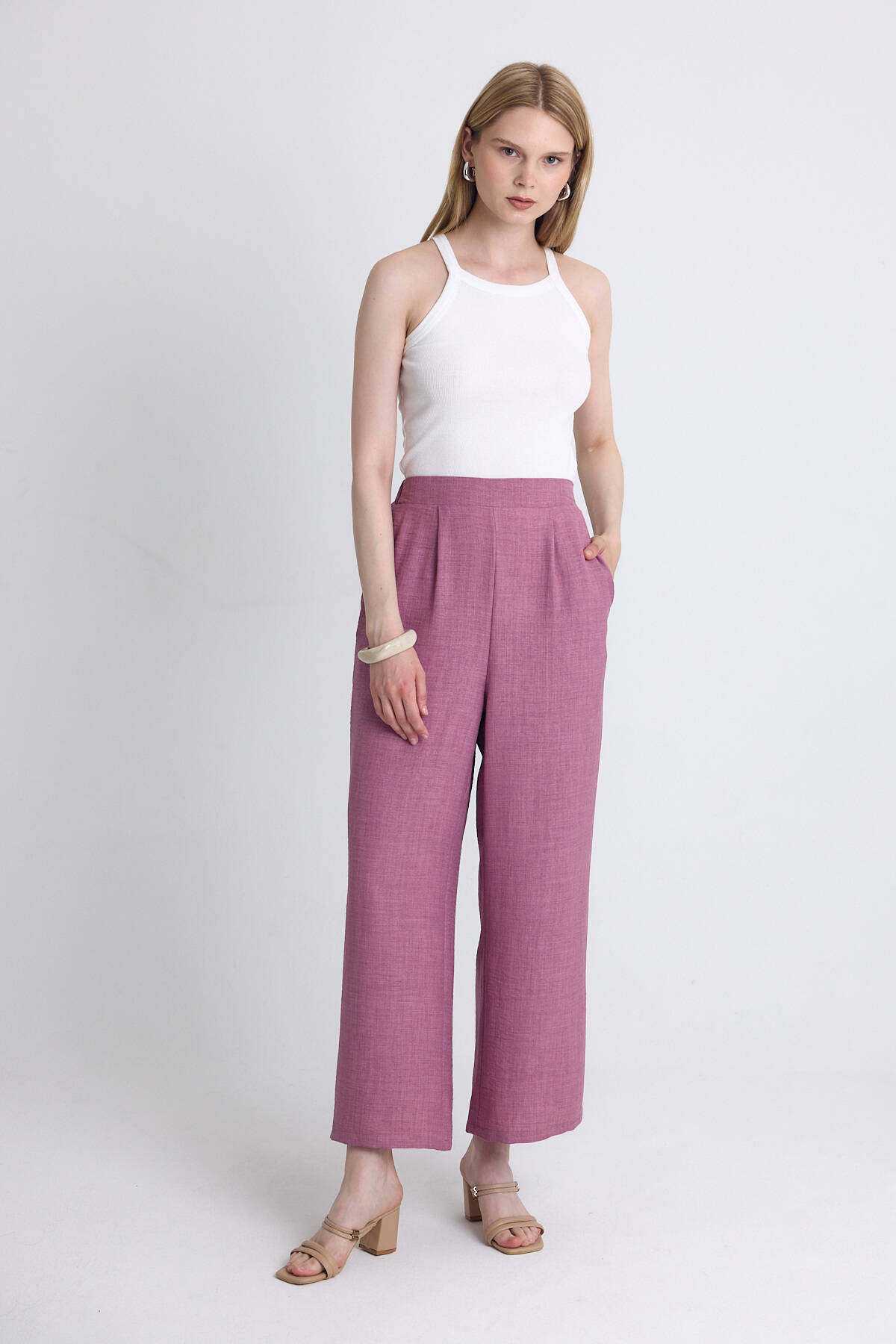 Gül Yüksek Bel Ön Pile Detaylı Pamuklu Bol Paça Pantolon 8014A