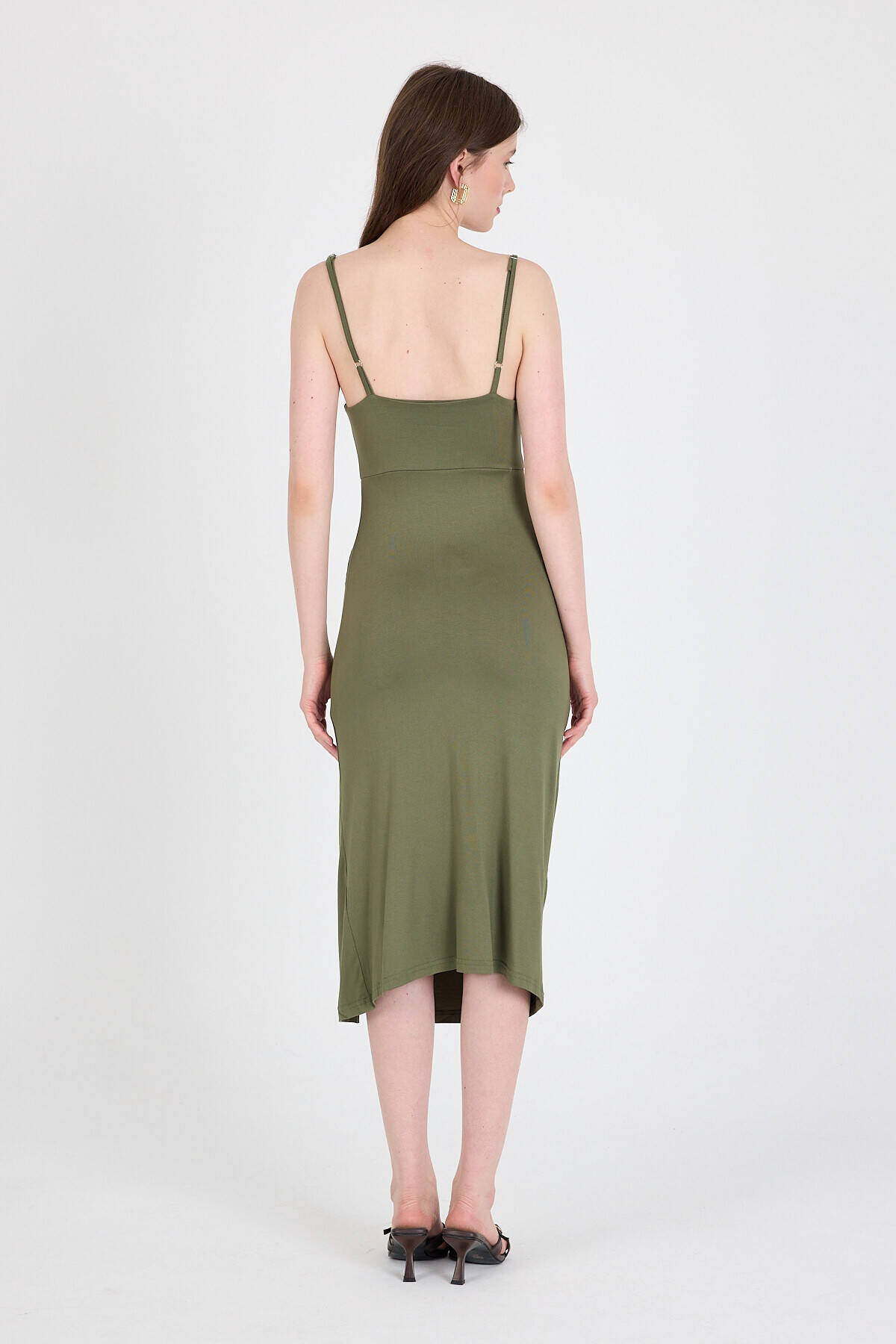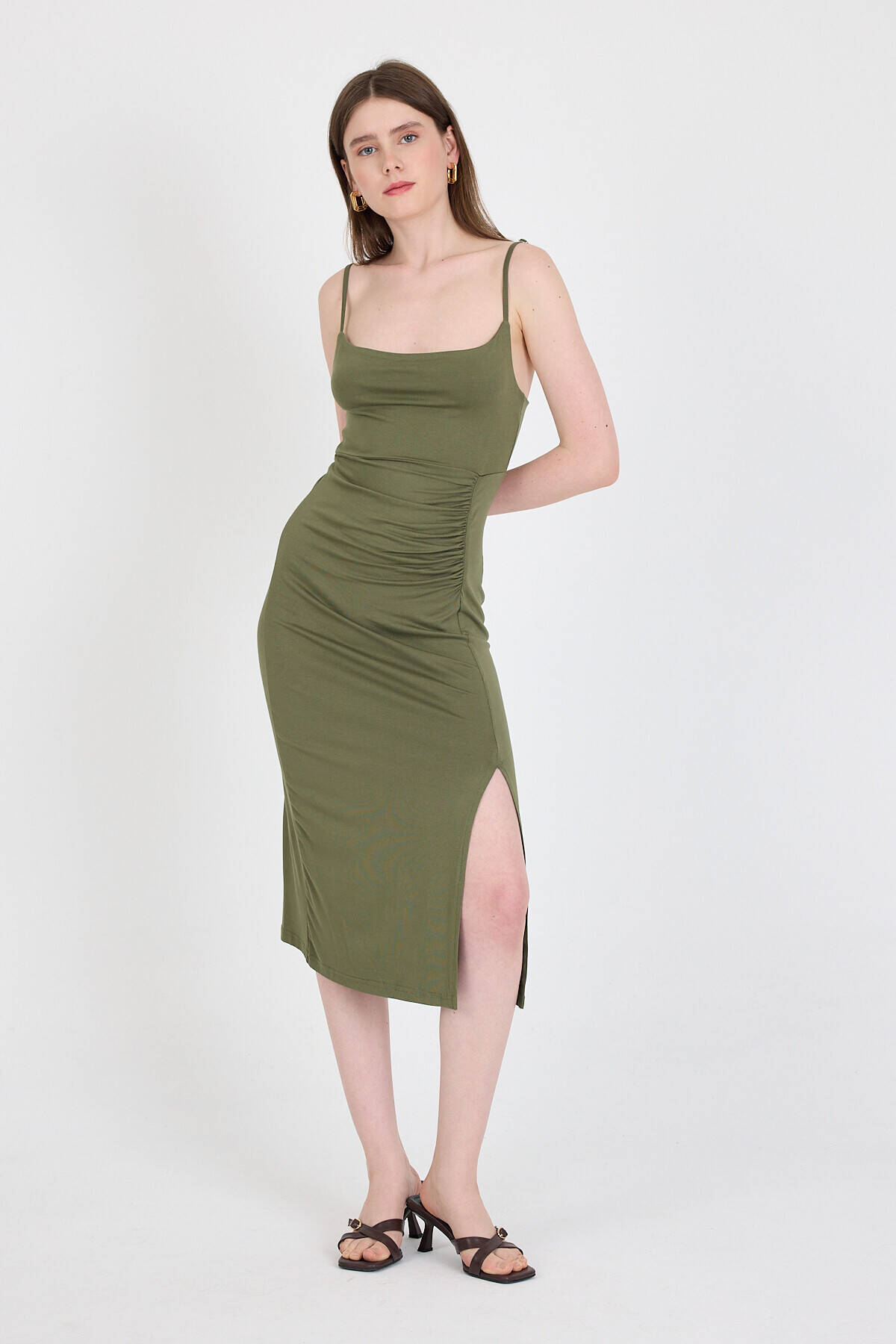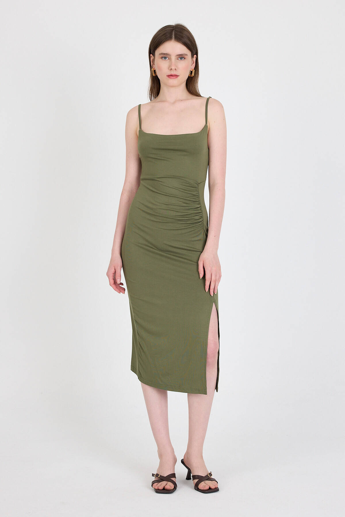 Haki Askılı Yırtmaçlı Drape Detaylı Dokuma Elbise 21003