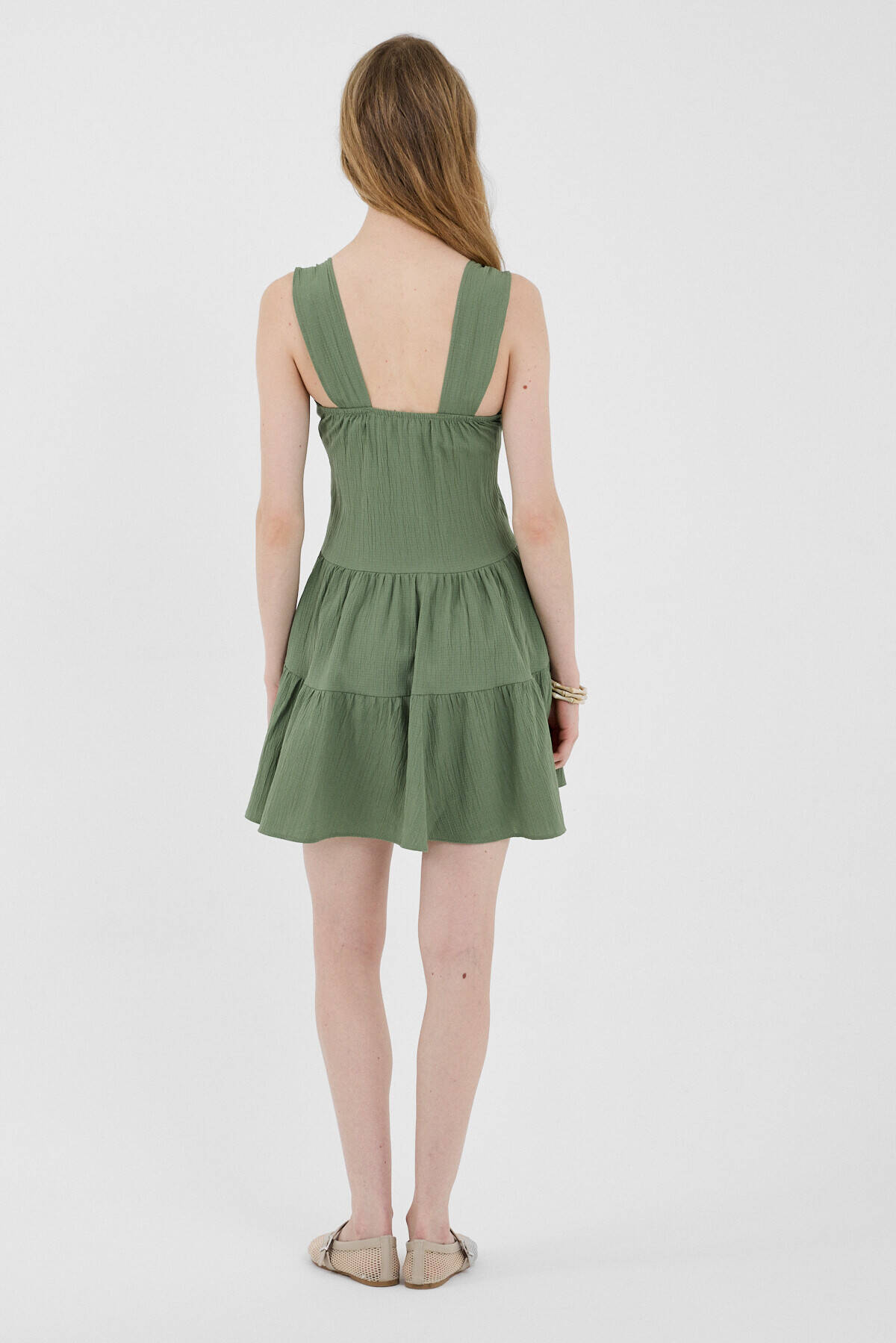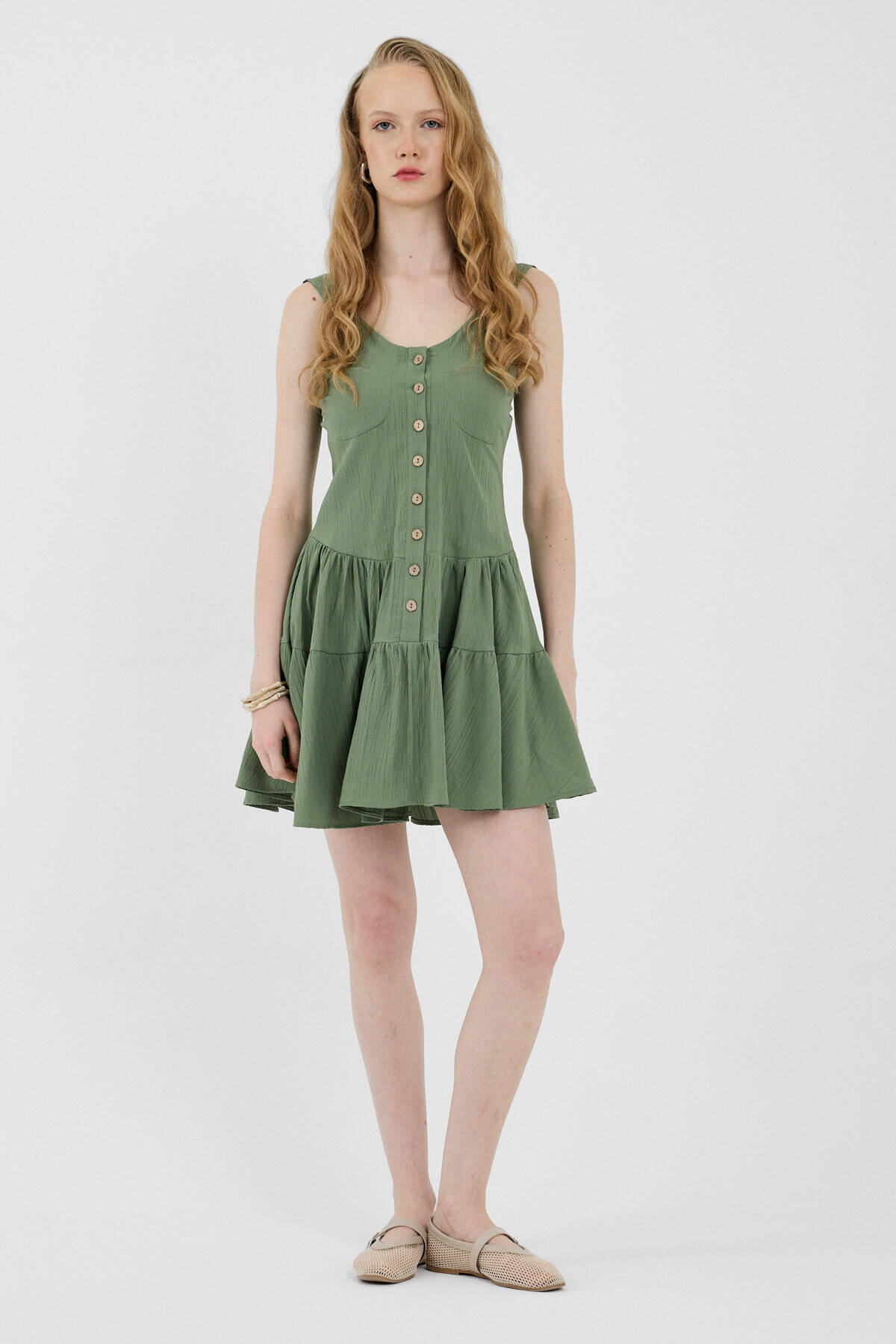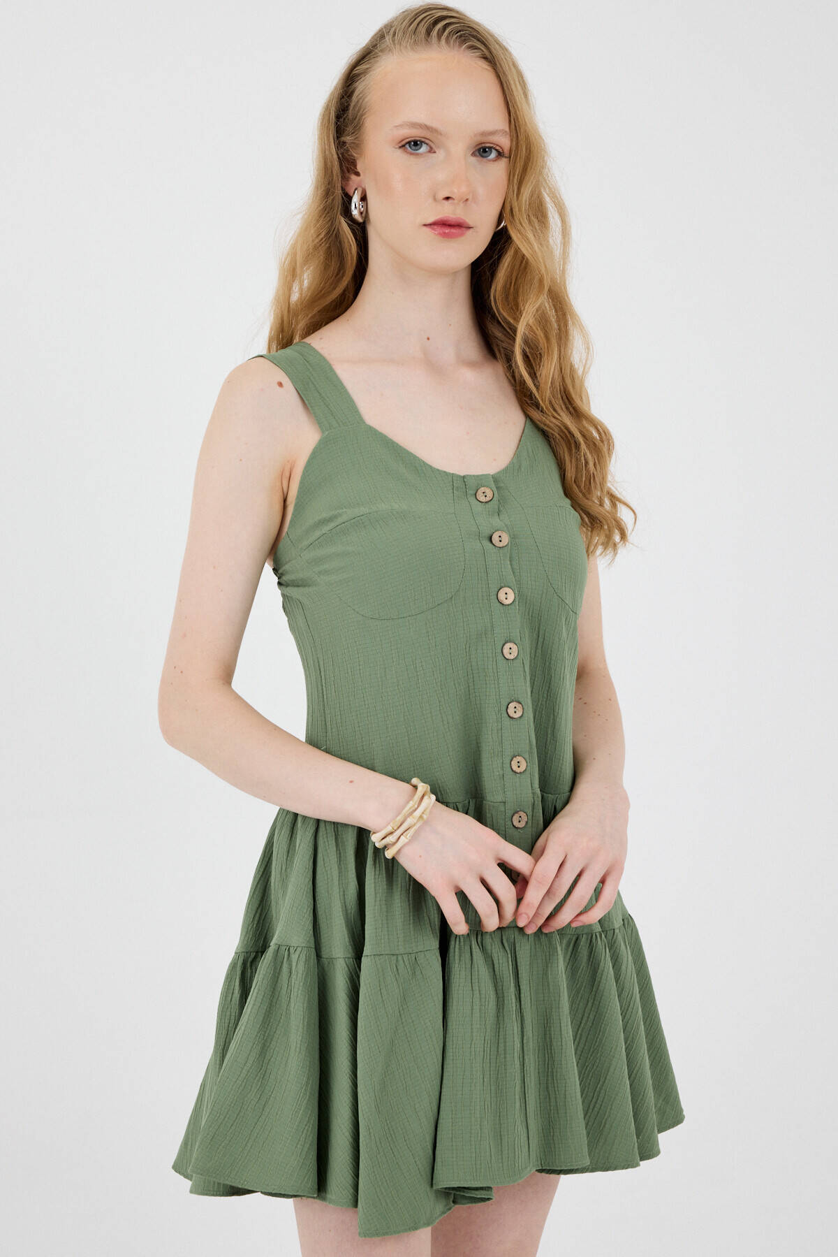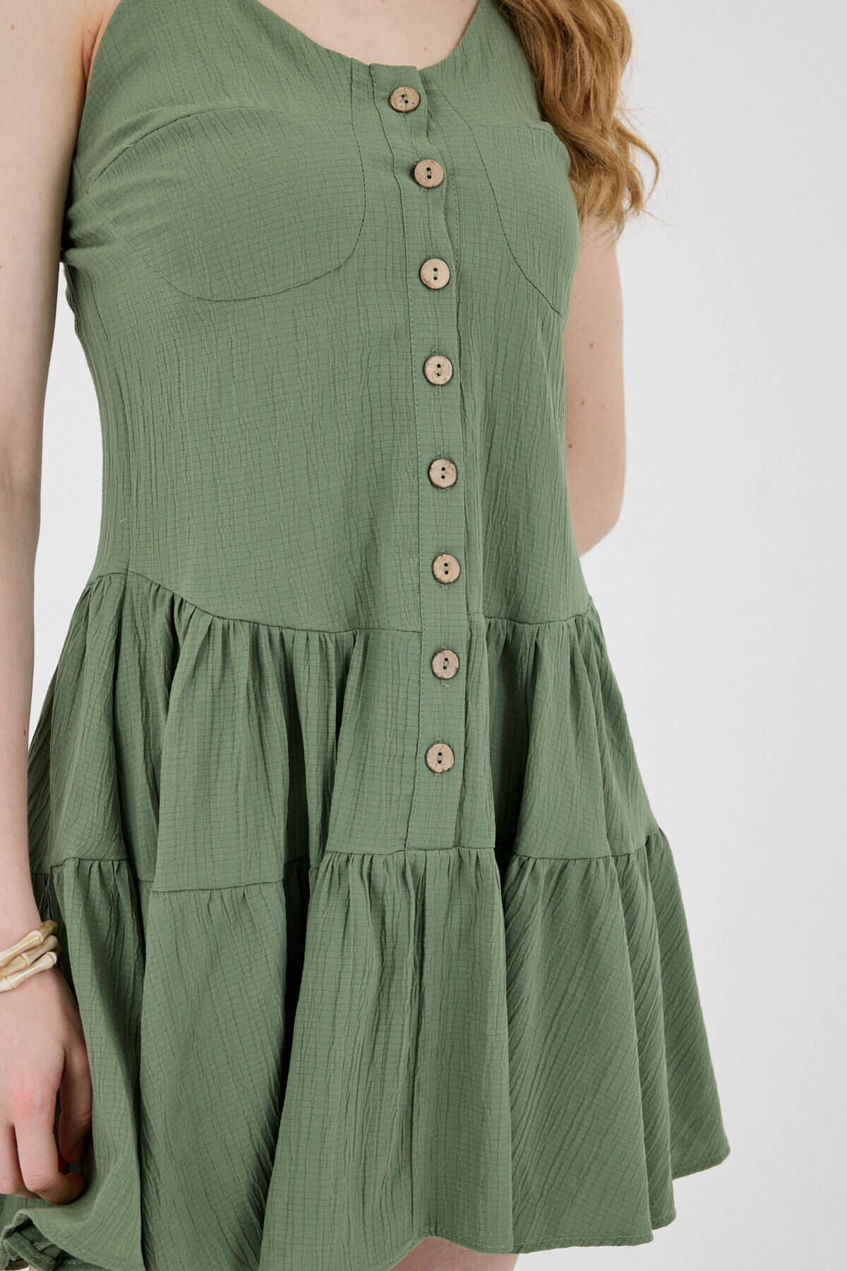 Haki Düğmeli Askılı Kat Etekli Mini Elbise 8042A