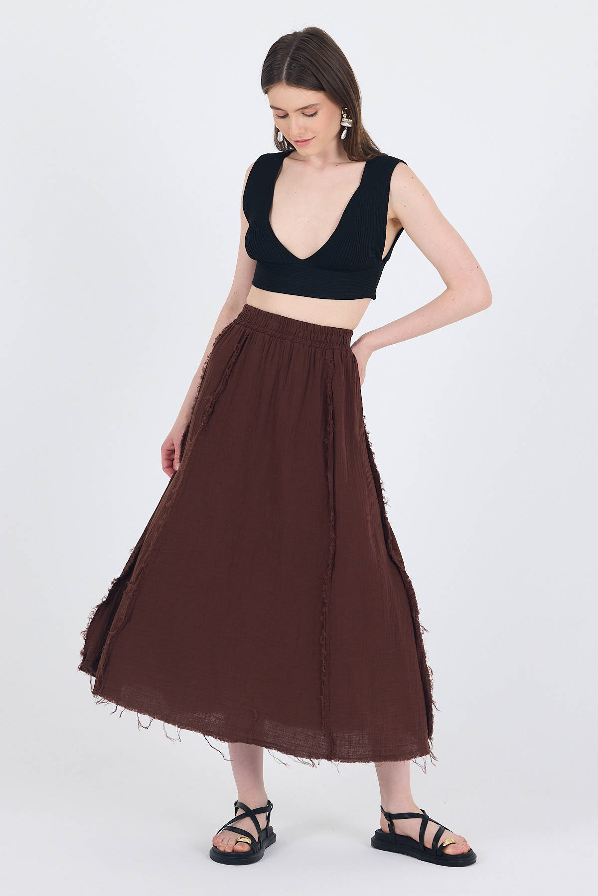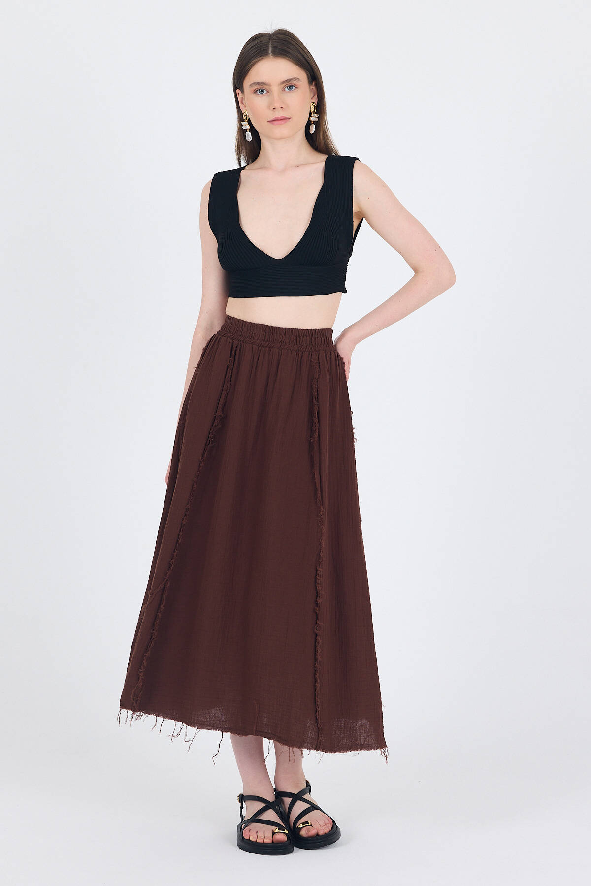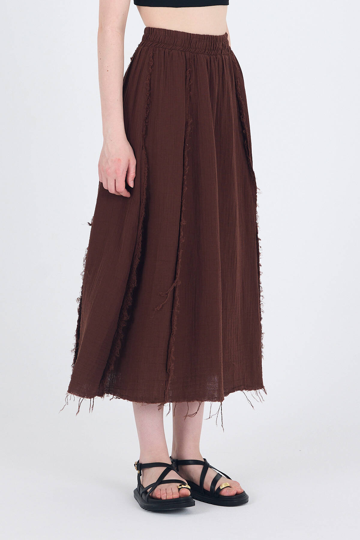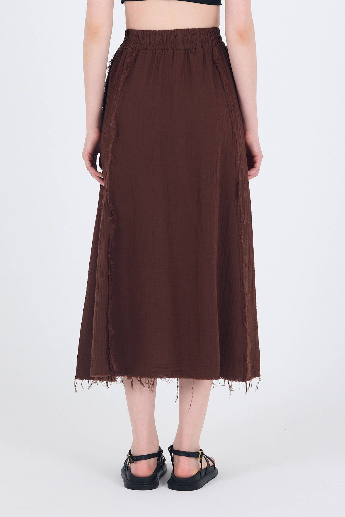 Kahve %100 Pamuk Müslin Midi Etek 7038