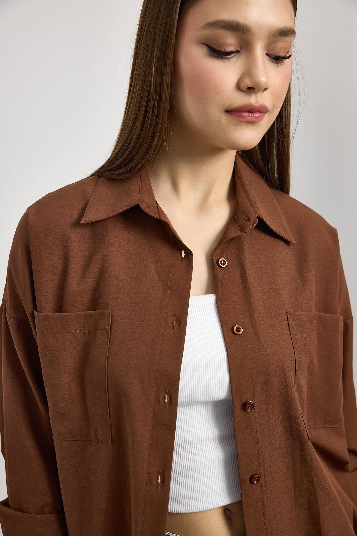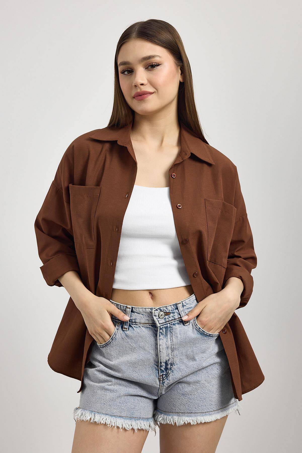 Kahve Çift Cepli Oversize Uzun Basic Gömlek TCR 6256A