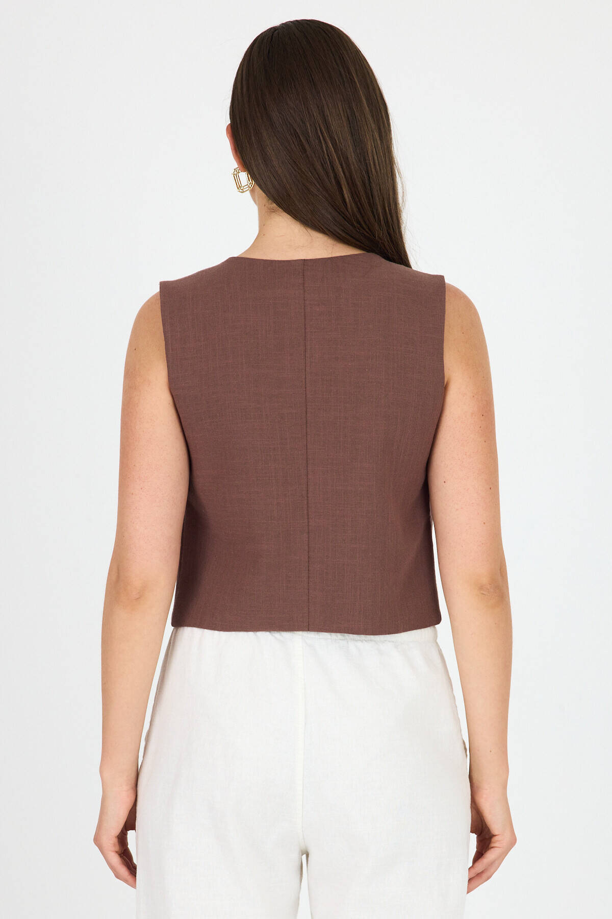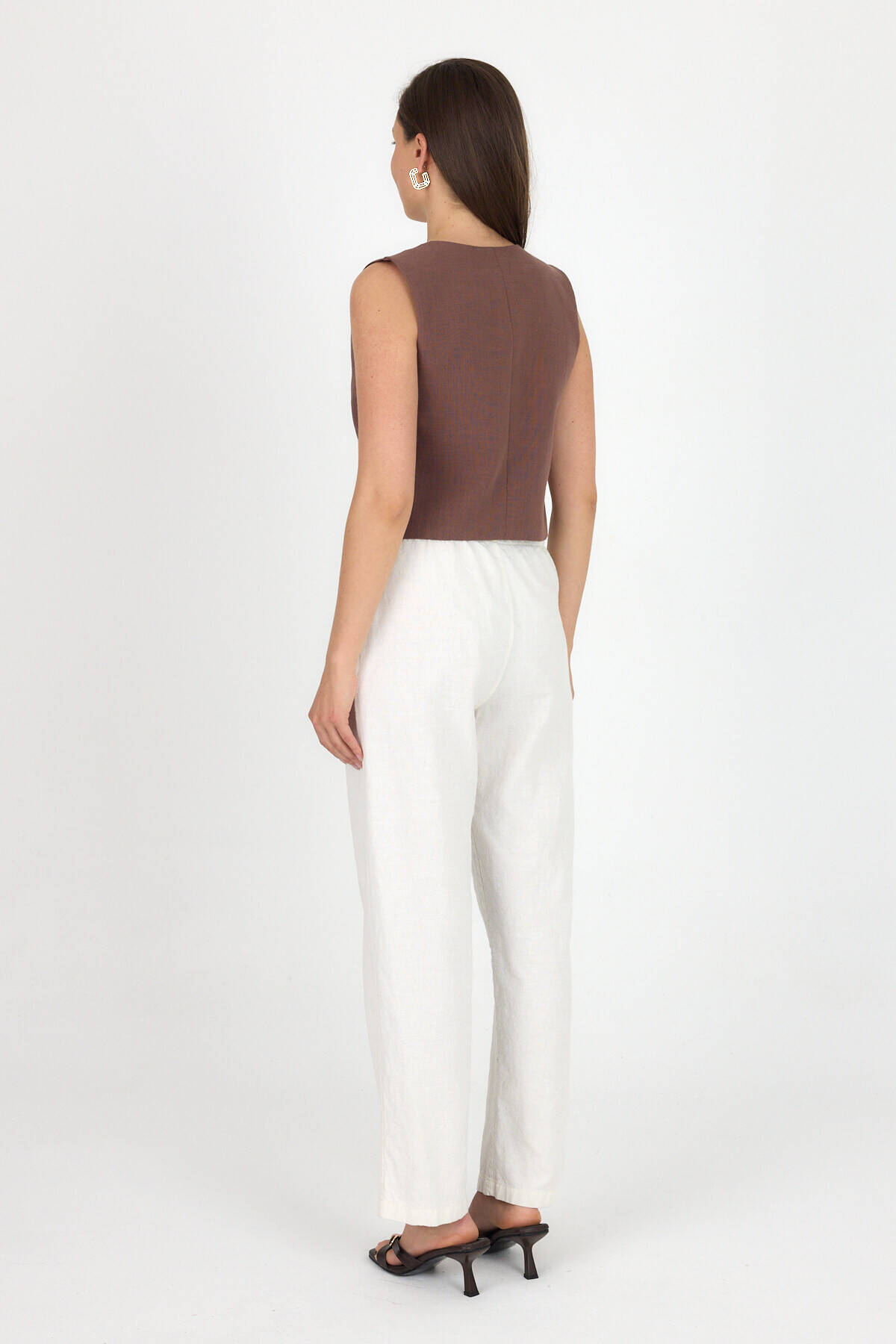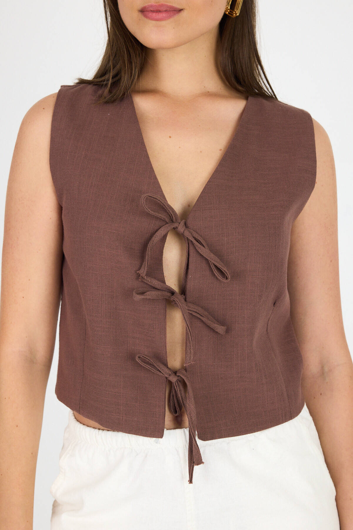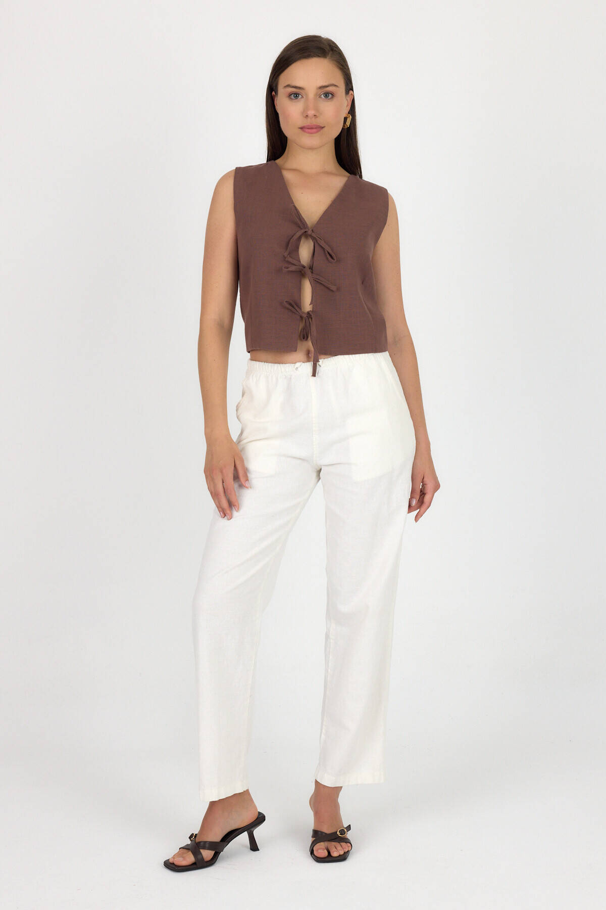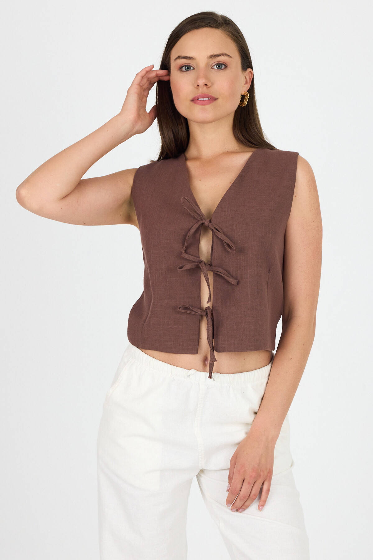 Kahve Keten Görünümlü %100 Pamuk Bağlama Detaylı Yelek 3853