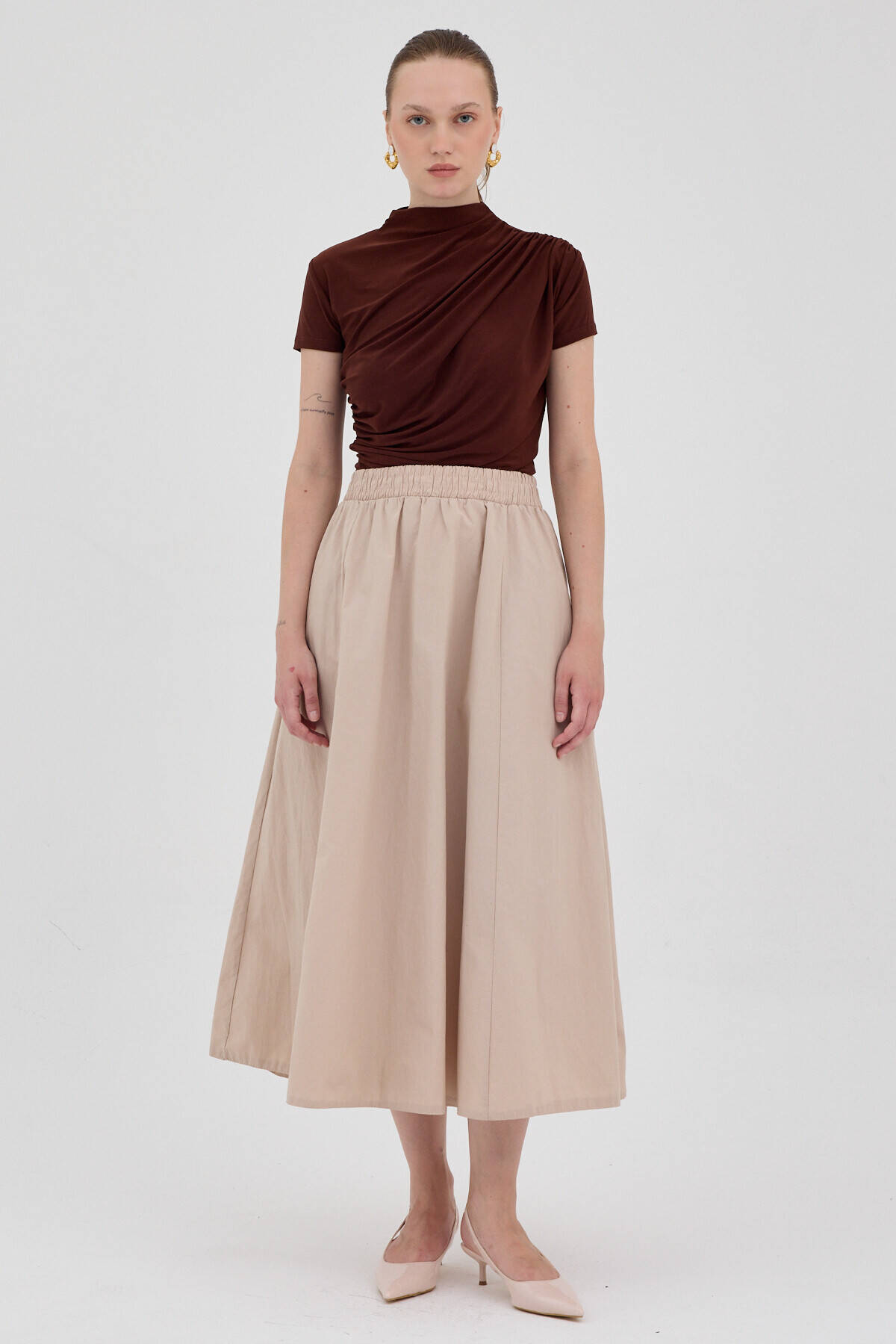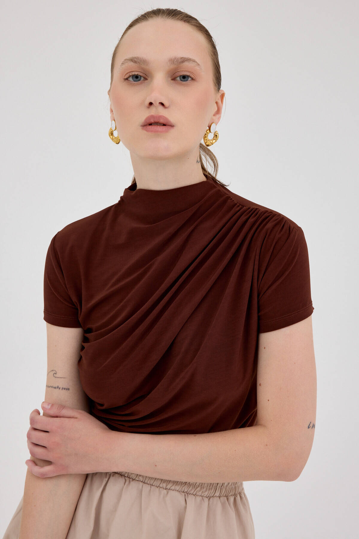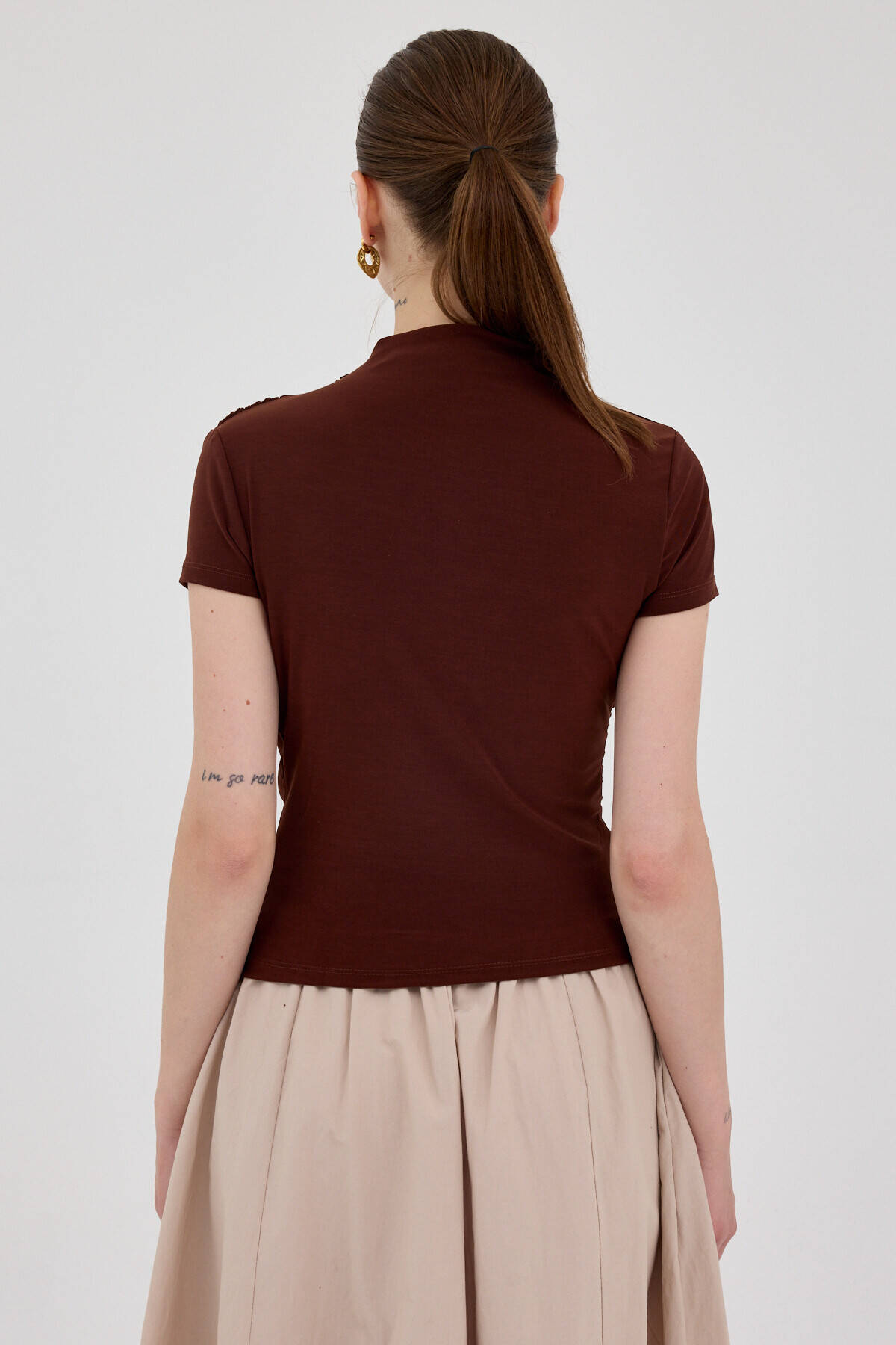 Kahve Kısa Kol Büzgülü Sandy Bluz 2417