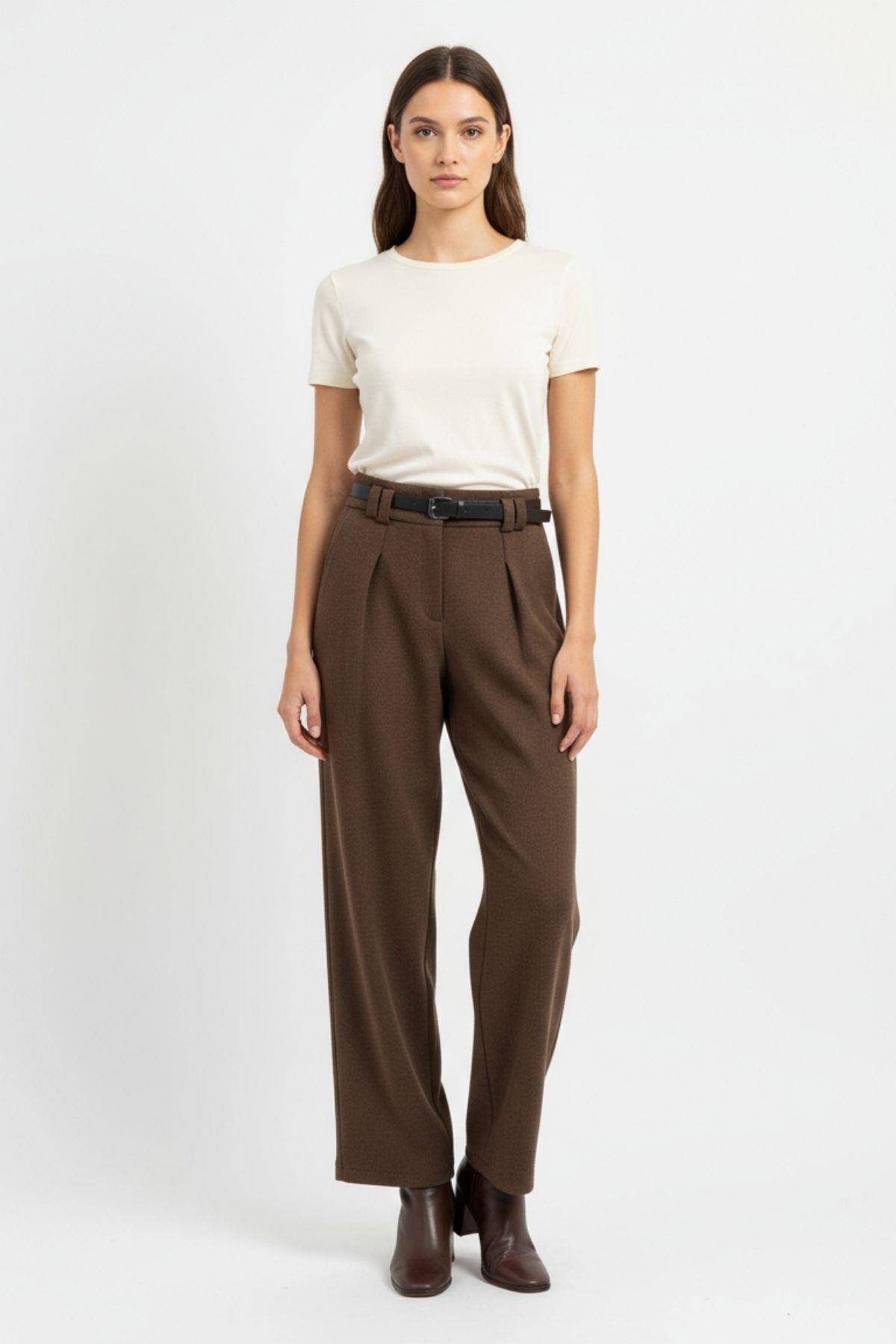 Kahve Pileli Kemerli Kadın Kumaş Pantolon 8119A