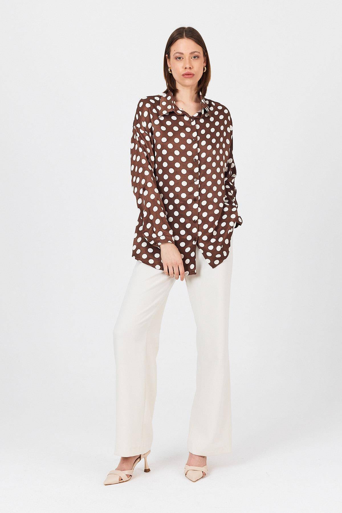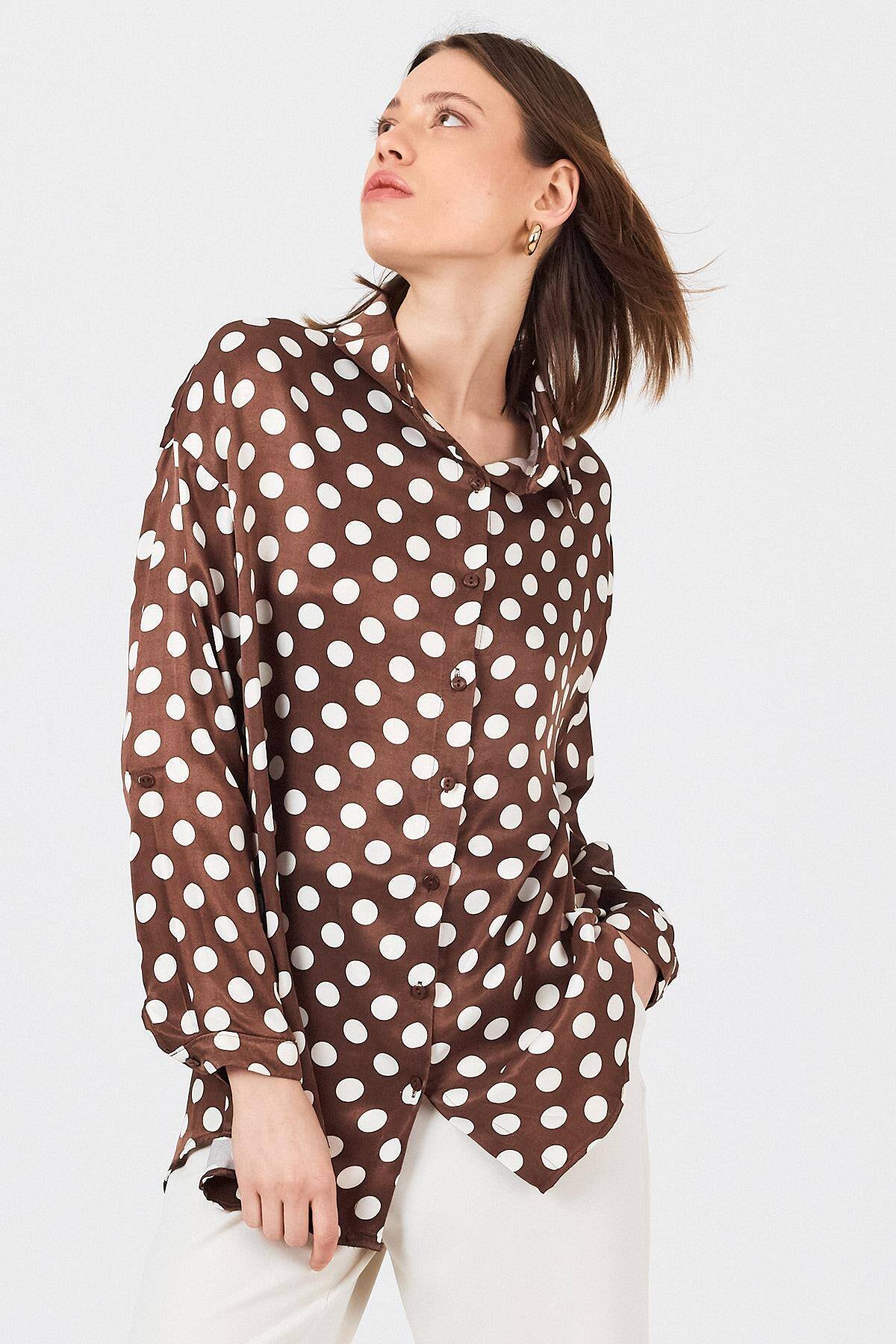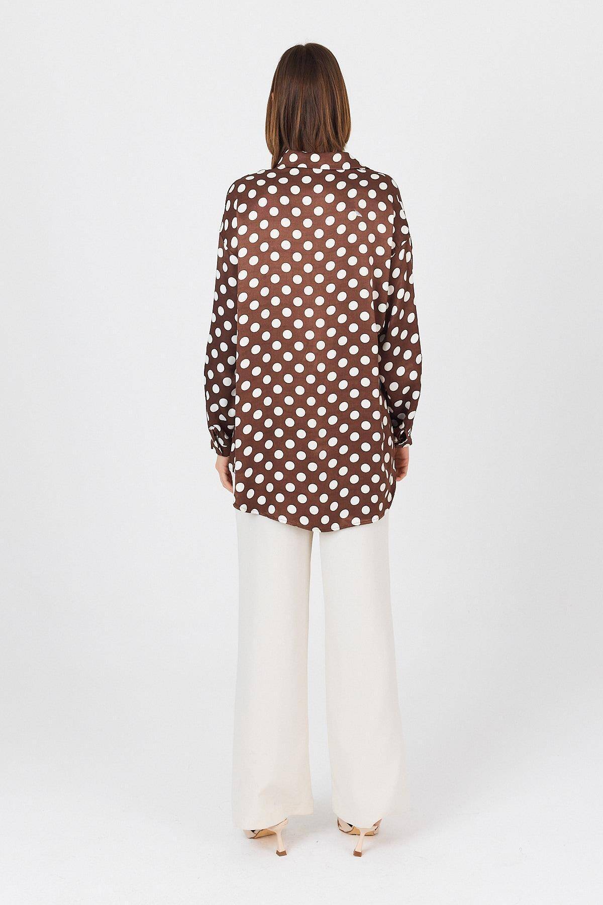 Kahve Puantiye Desen Oversize Saten Gömlek 9411