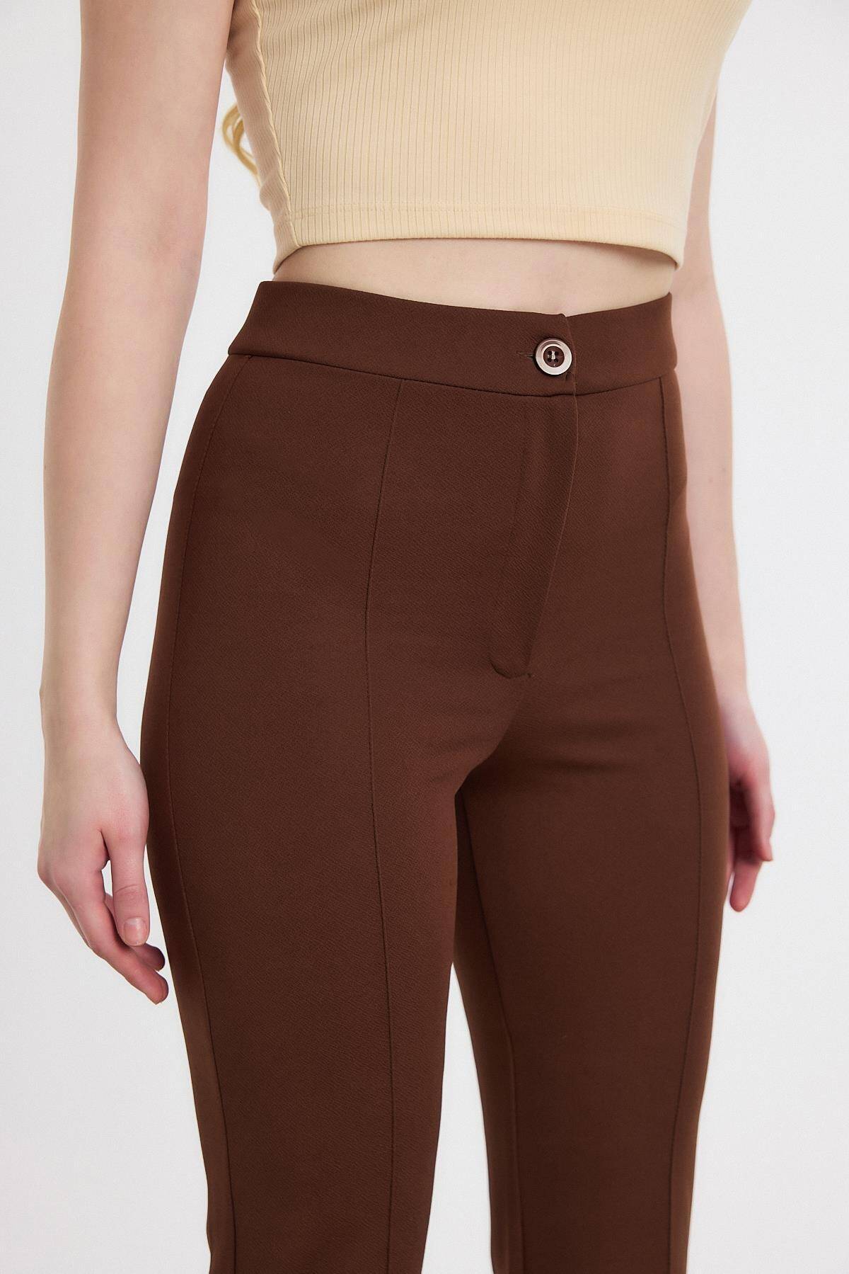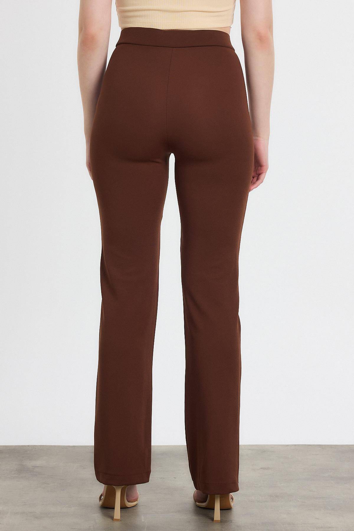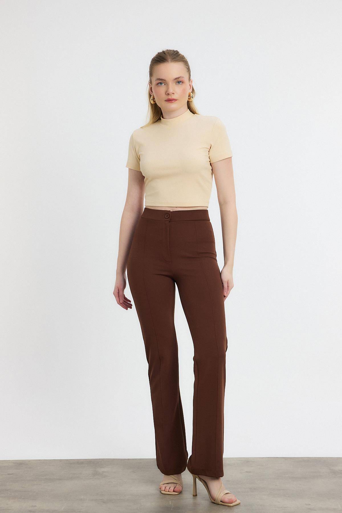 Kahve Straight/Düz Kesim Yüksek Bel Nervür Dikişli Örme Pantolon 6873