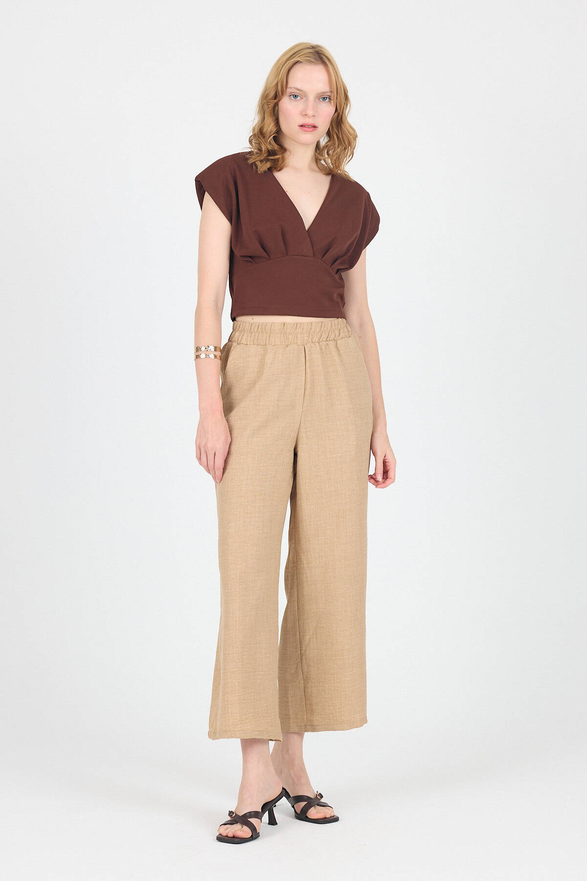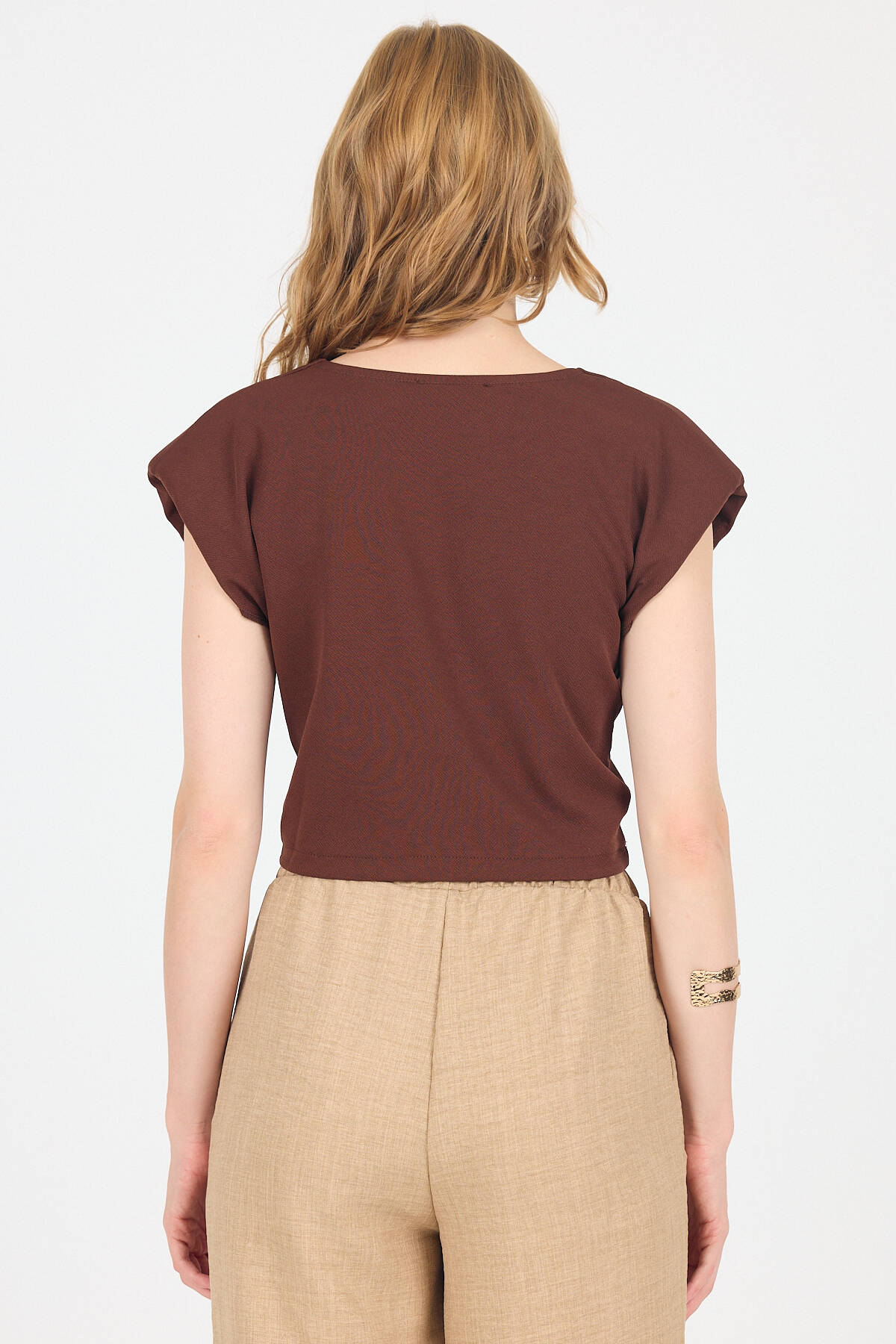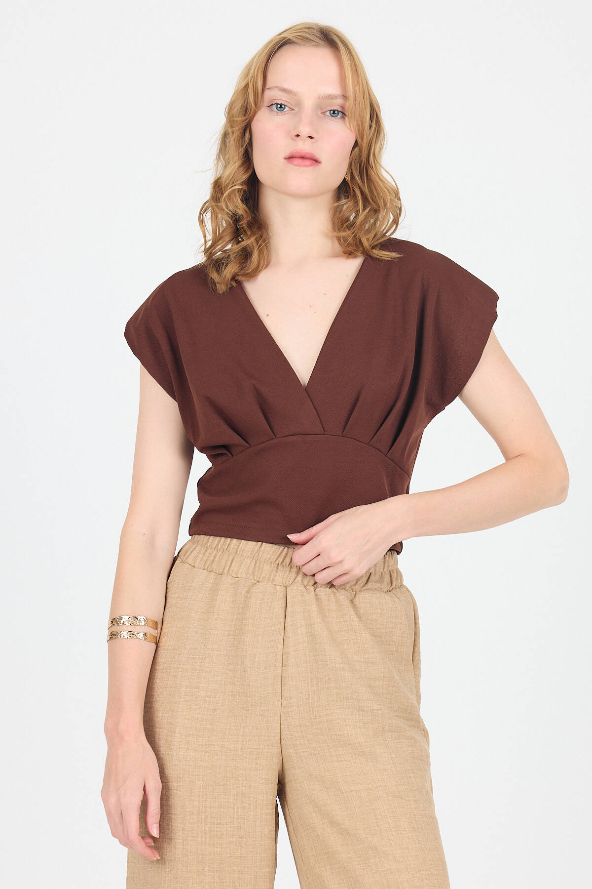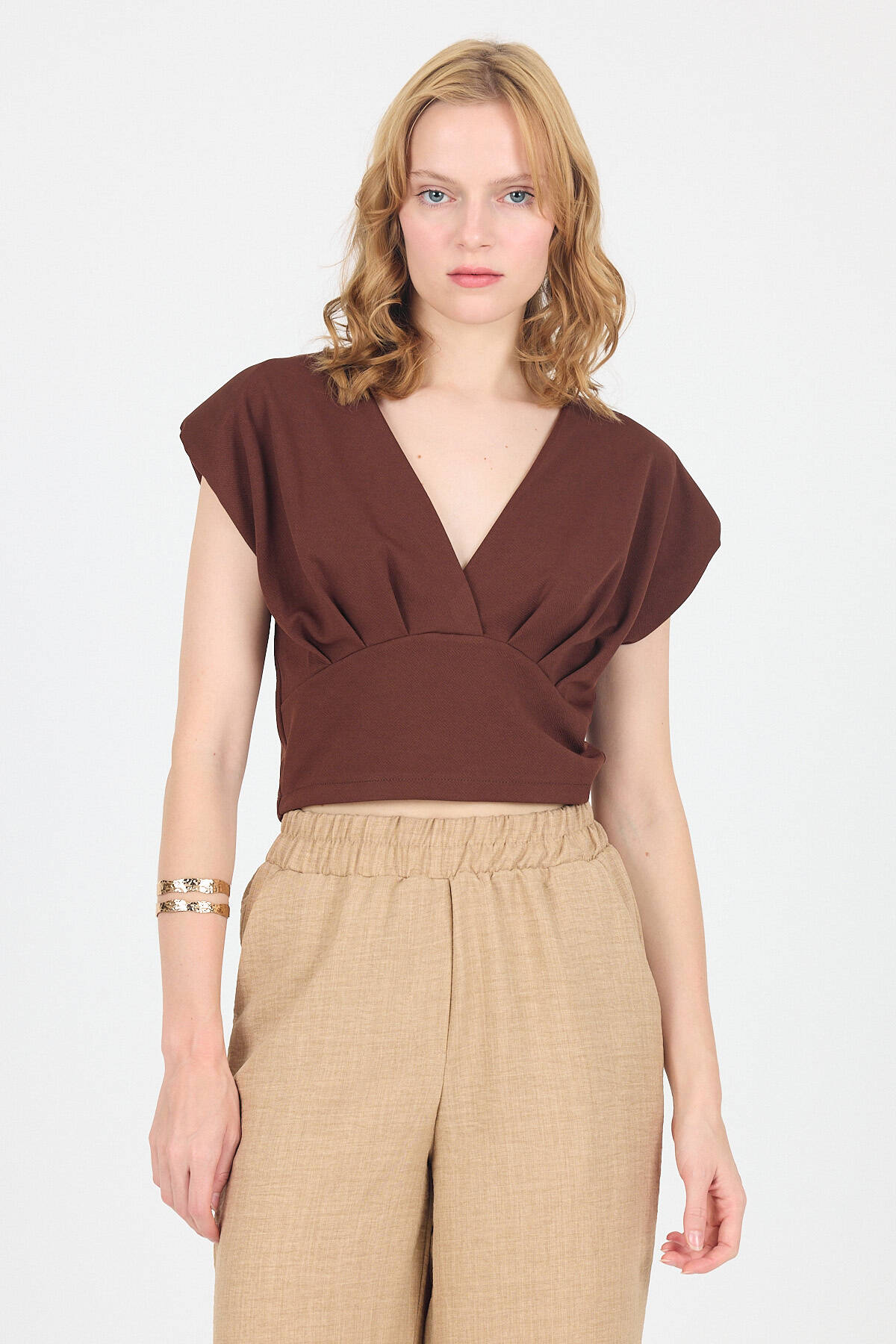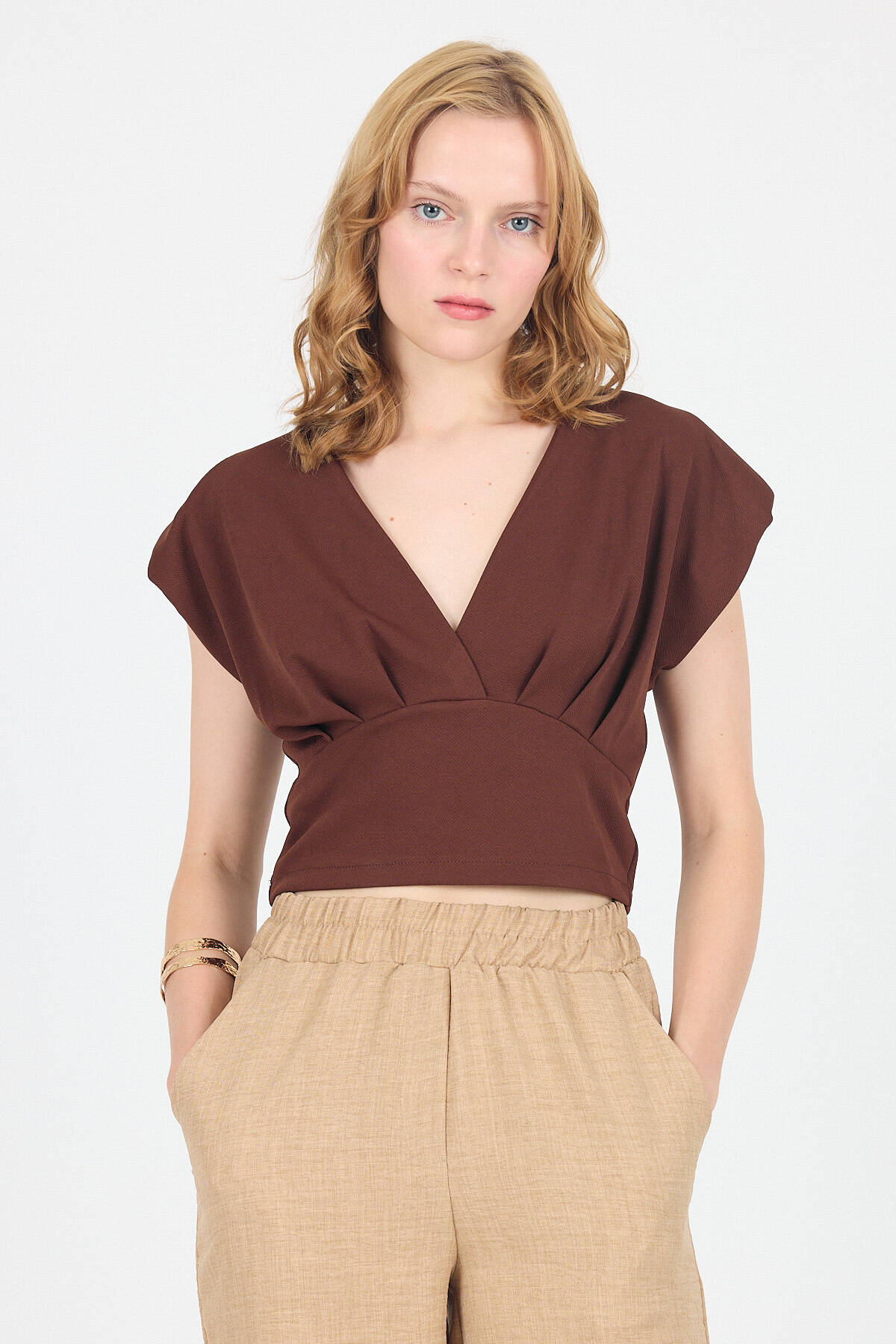 Kahve Vatkalı V Yaka Kruvaze Crop Bluz 4227