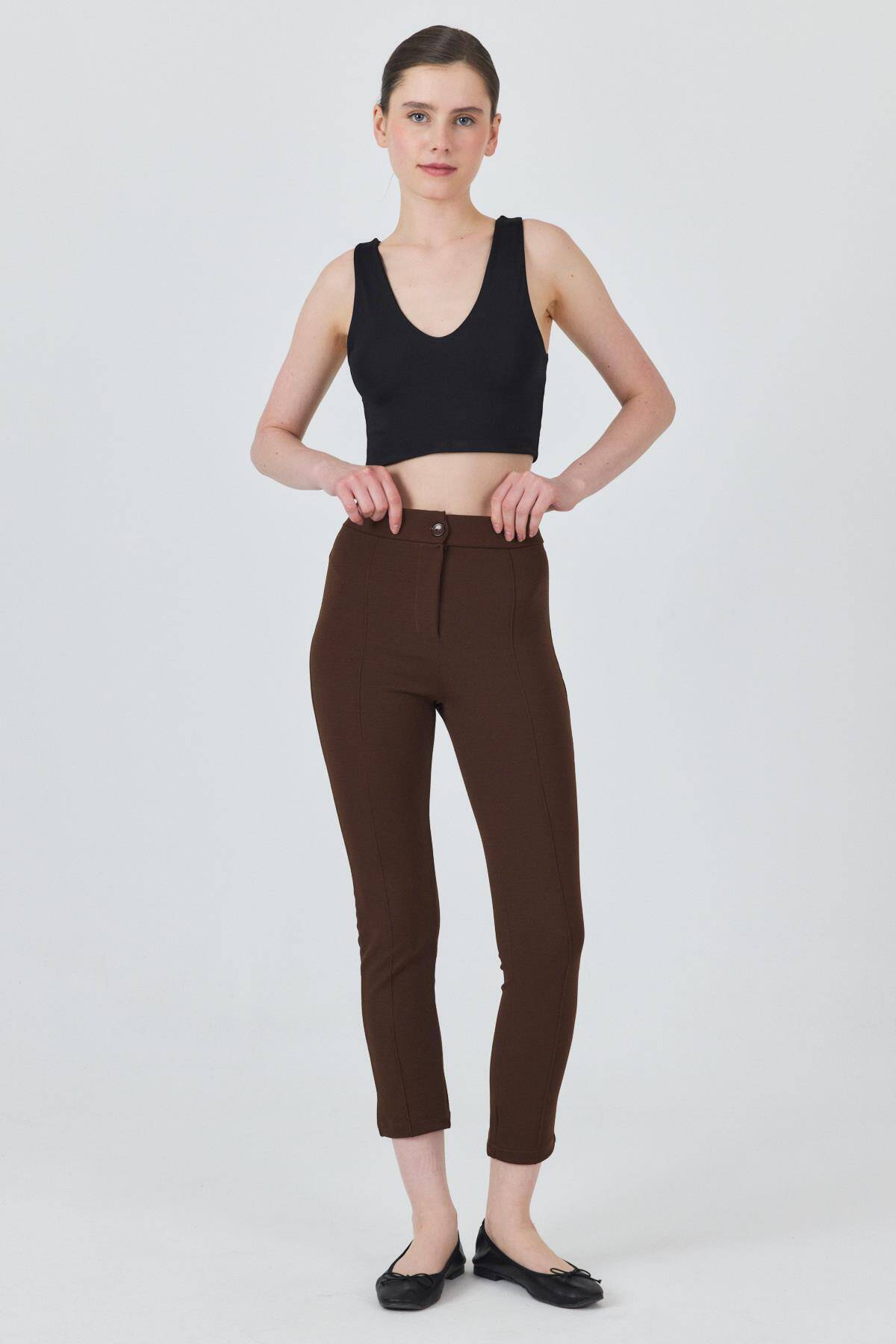 Kahve Yüksek Bel Nervür Dikiş Detaylı Tayt Pantolon 6875A