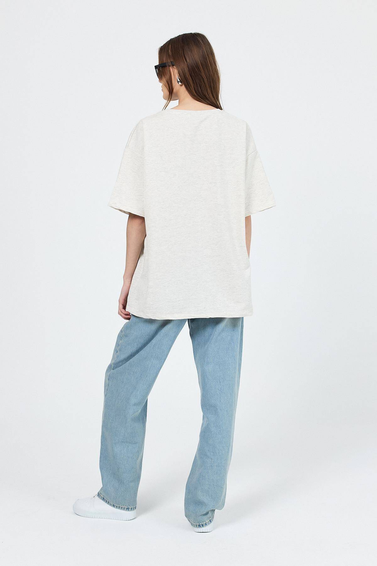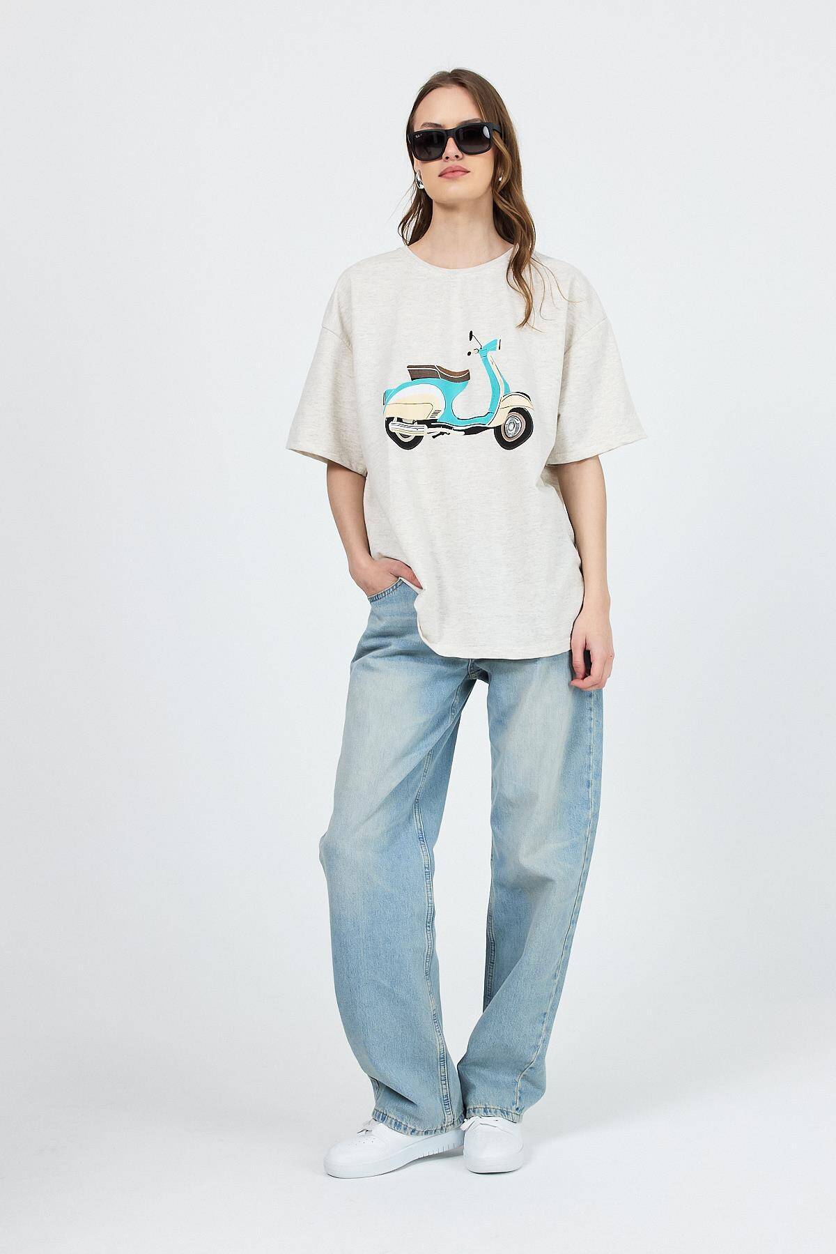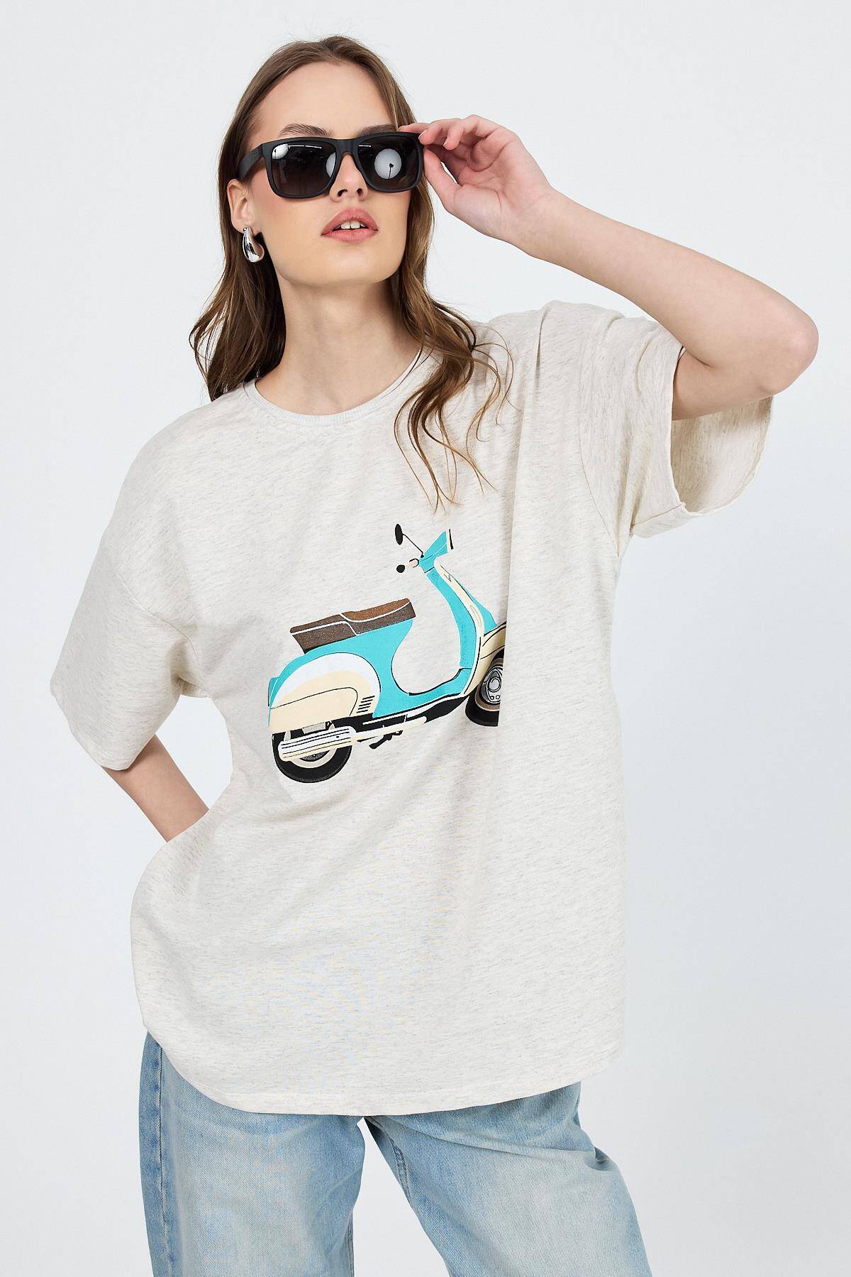 Karmelanj Bisiklet Yaka Motosiklet Baskı Detaylı Oversize Tişört 3098