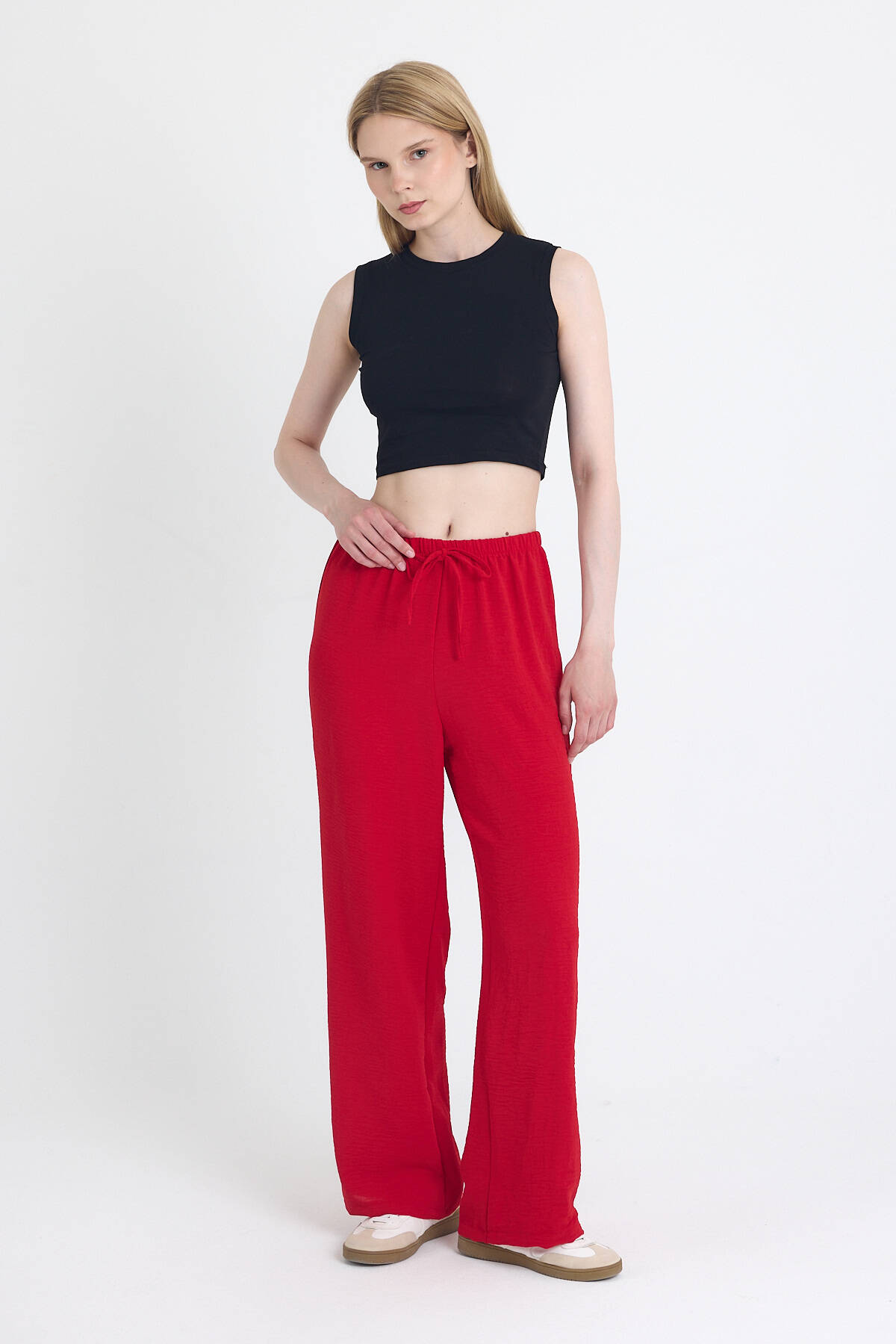 Kırmızı Beli Lastikli Bol Paça Dokuma Pantolon 4284-1