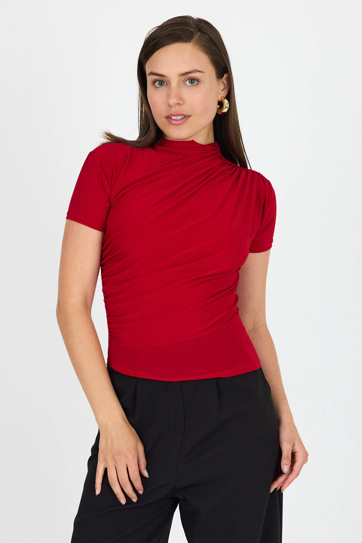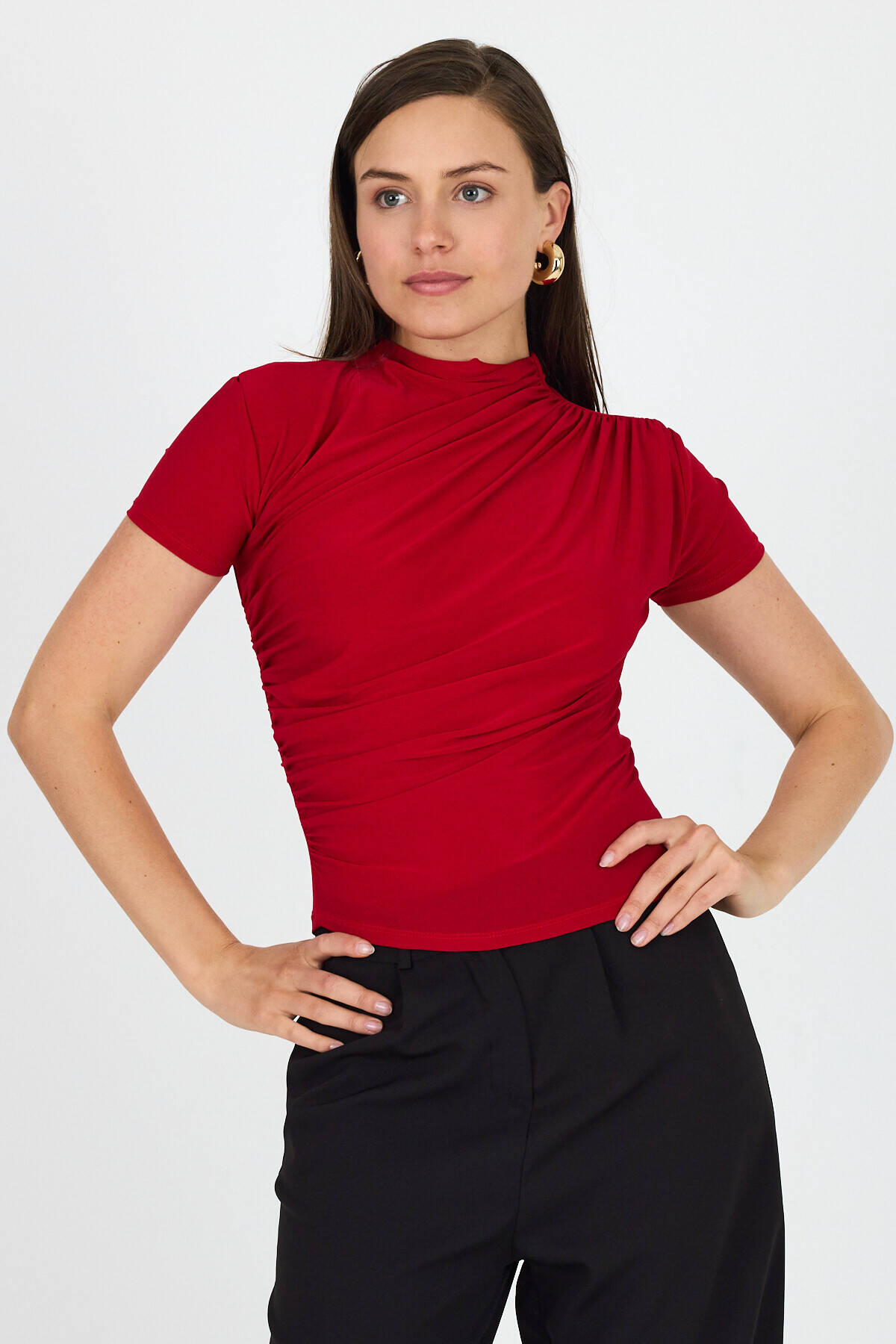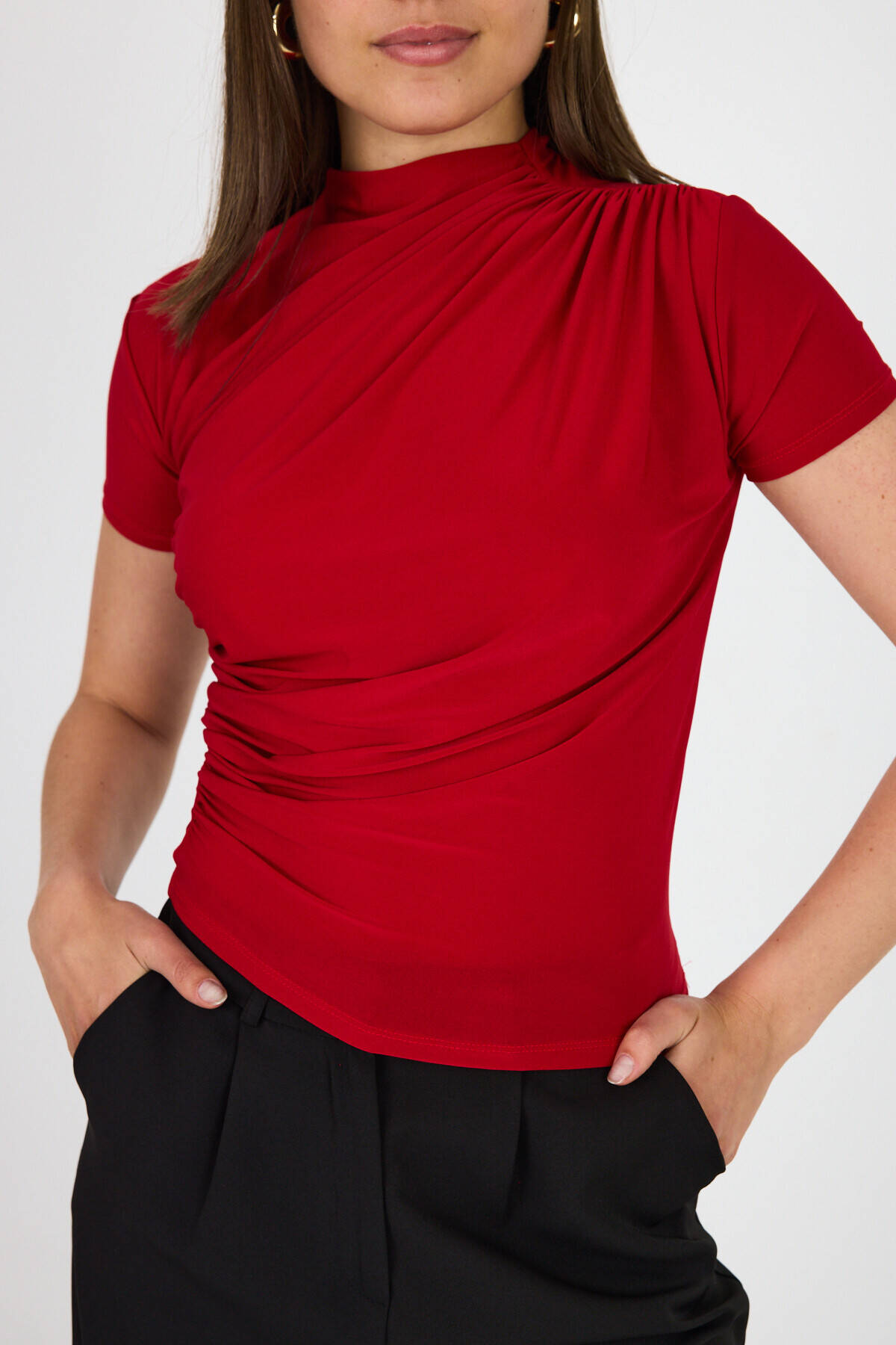 Kırmızı Kısa Kol Büzgülü Sandy Bluz 2417