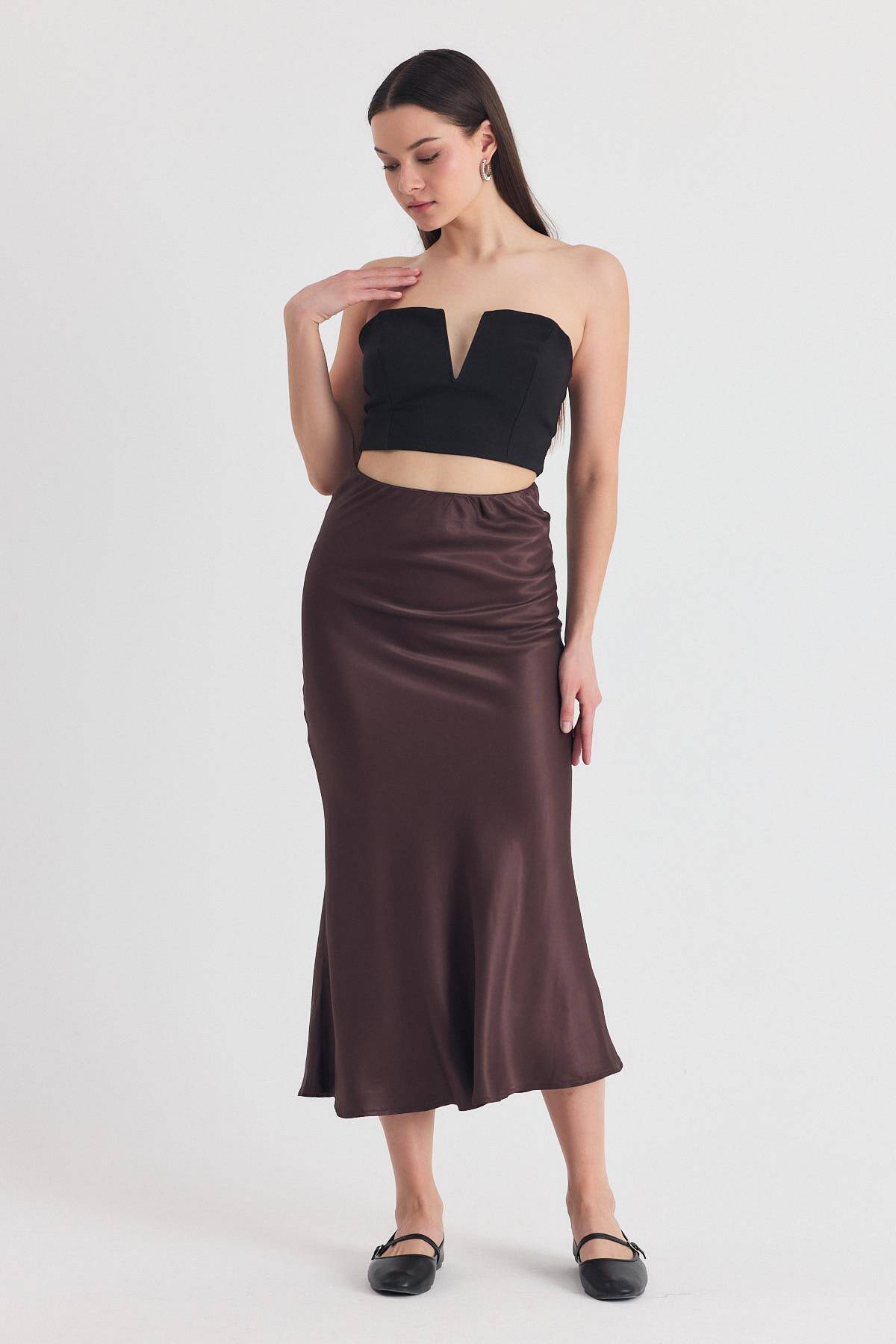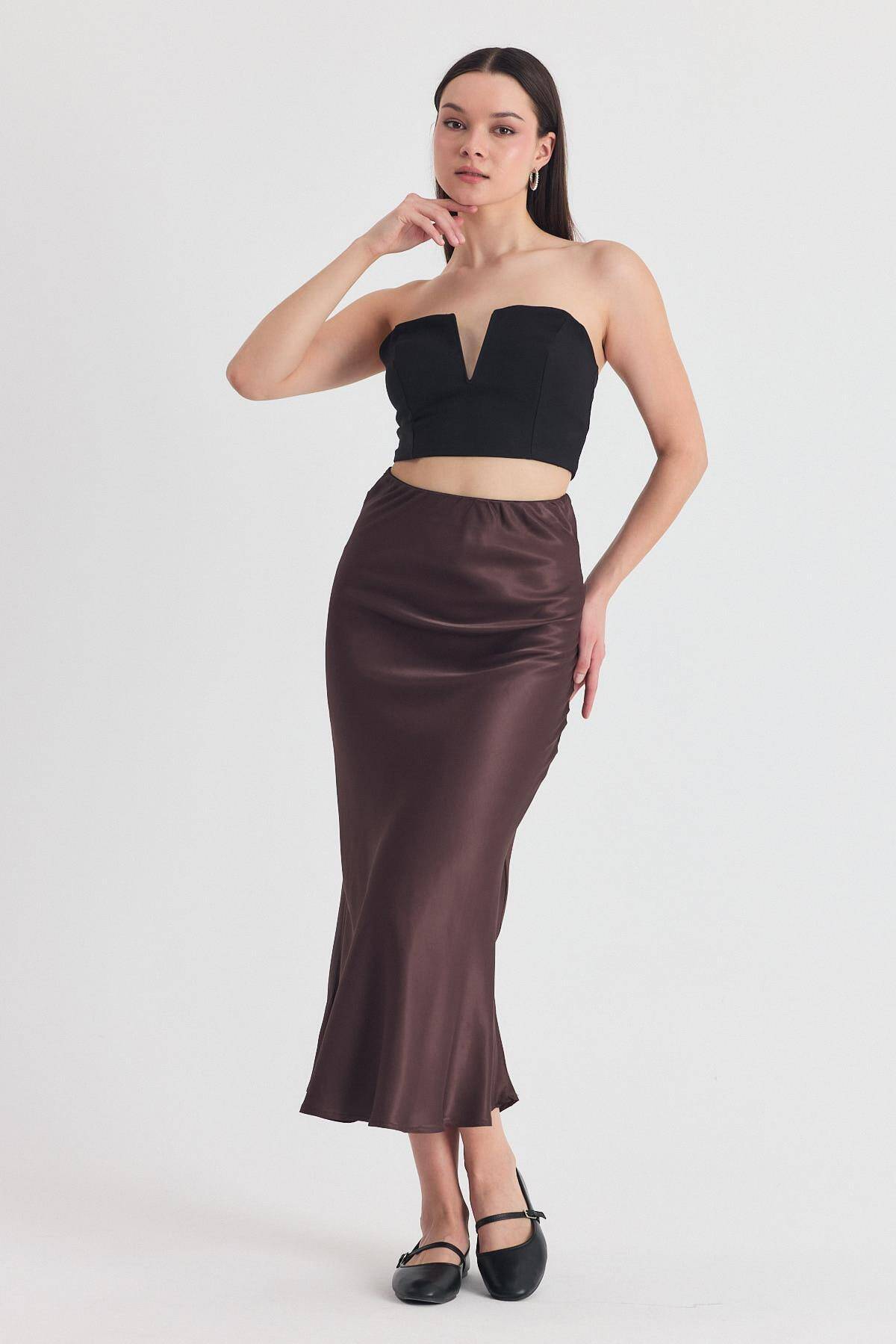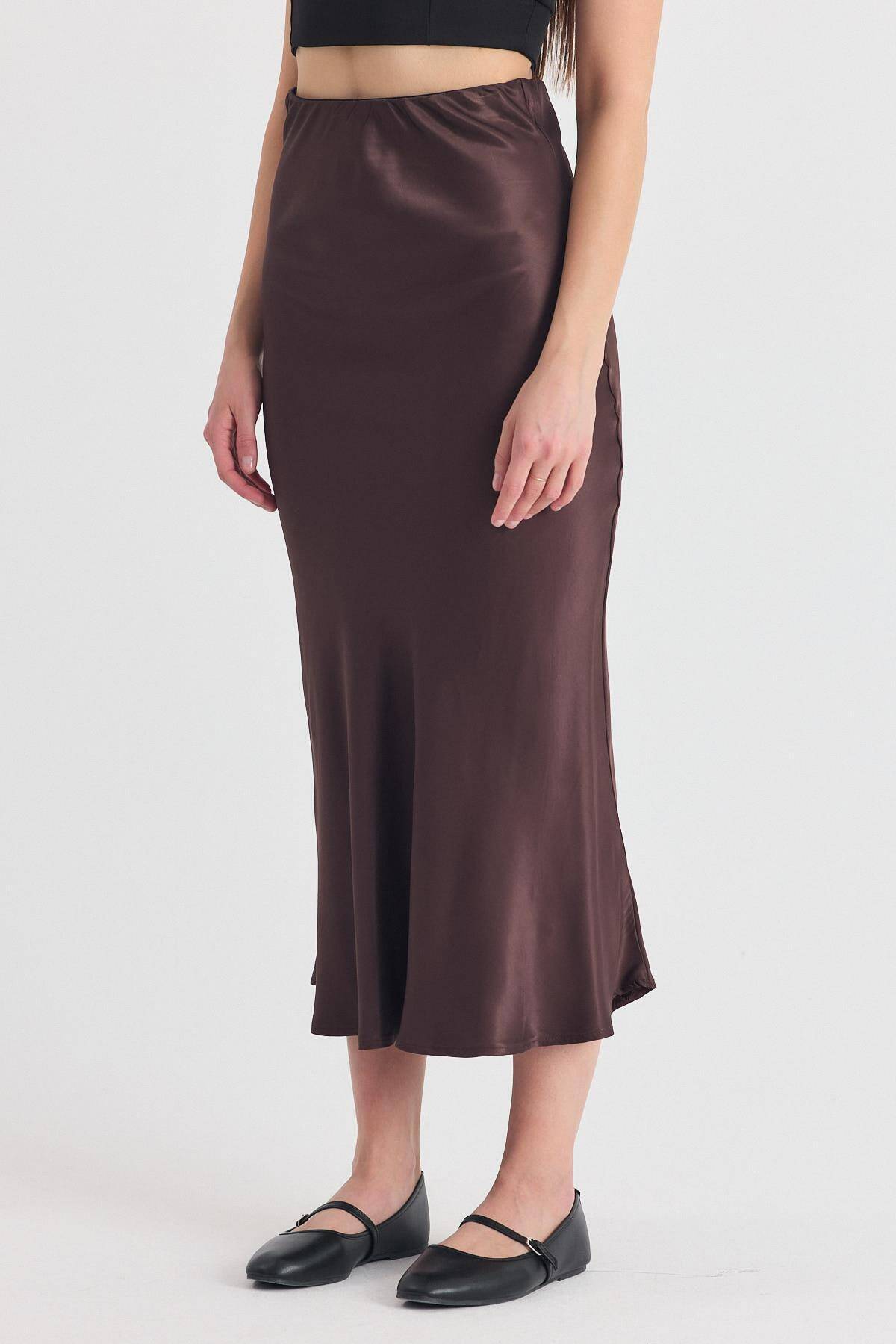 Koyu Bej Beli Lastikli Saten Midi Etek 9427