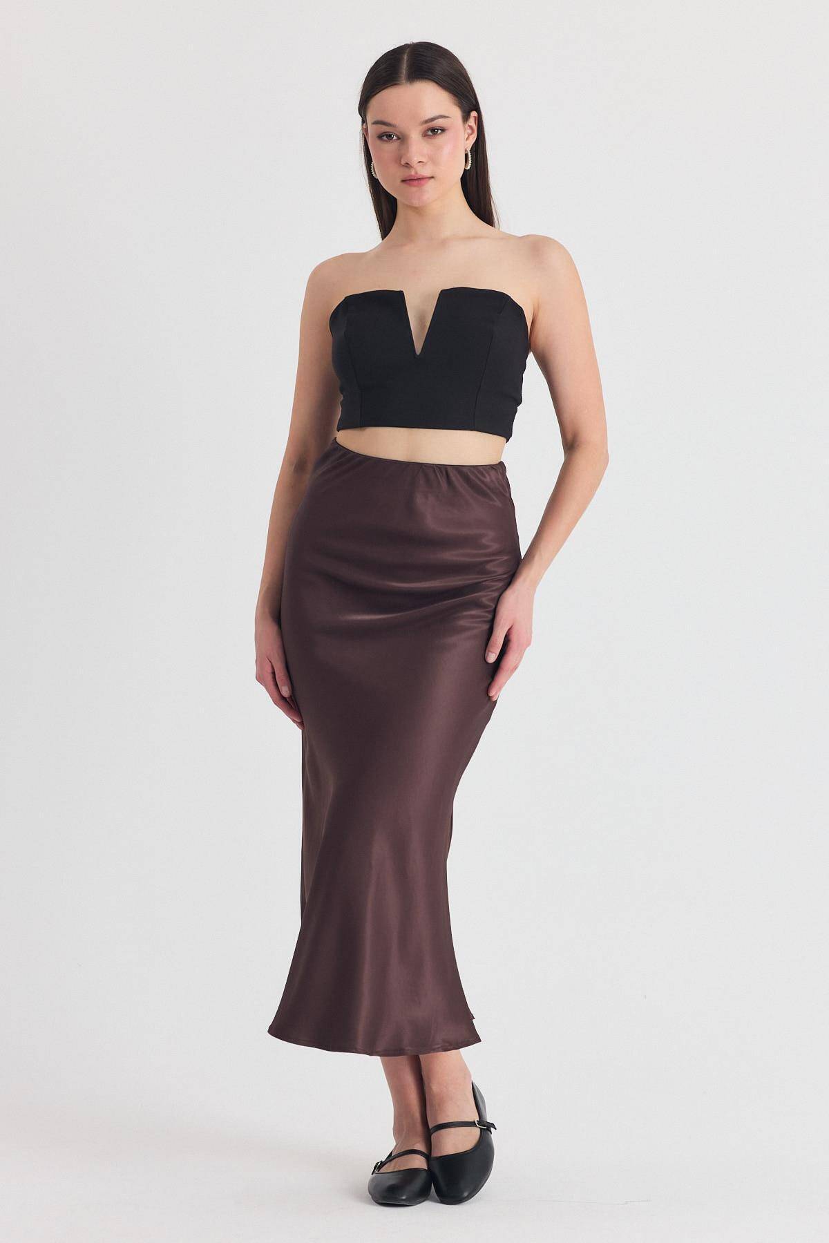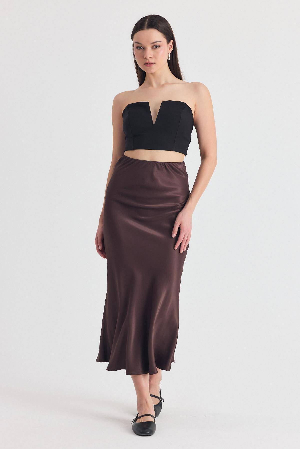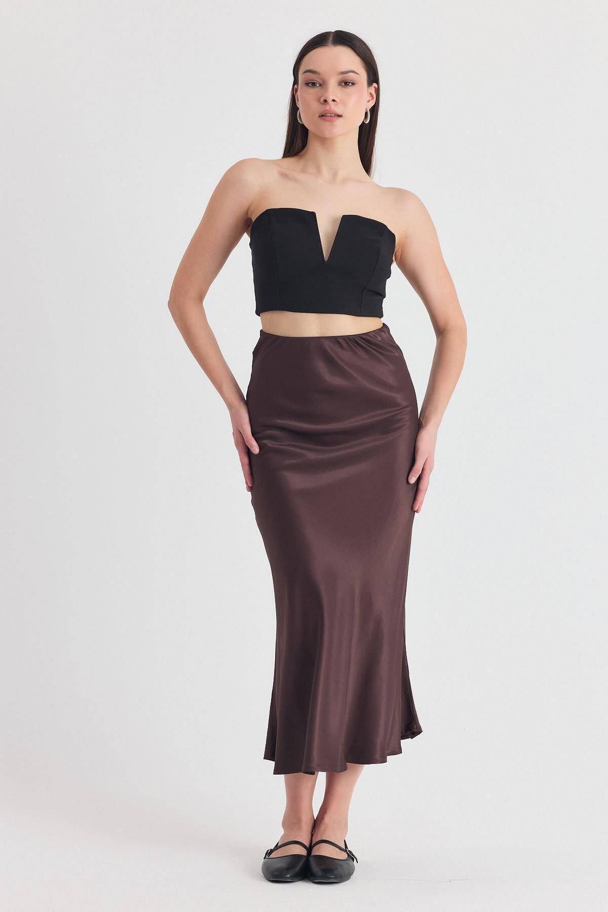 Koyu Bej Beli Lastikli Saten Midi Etek 9427