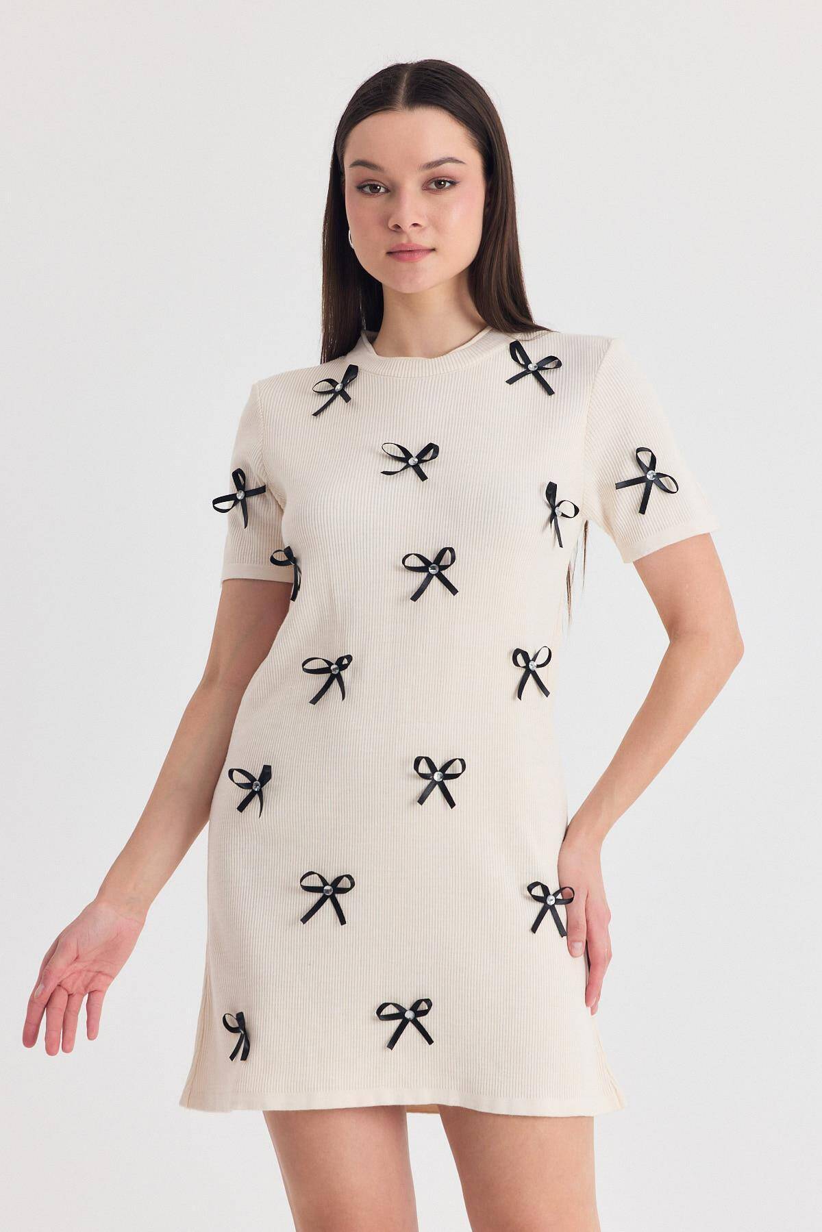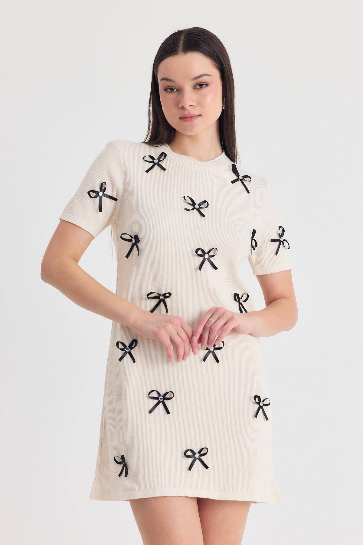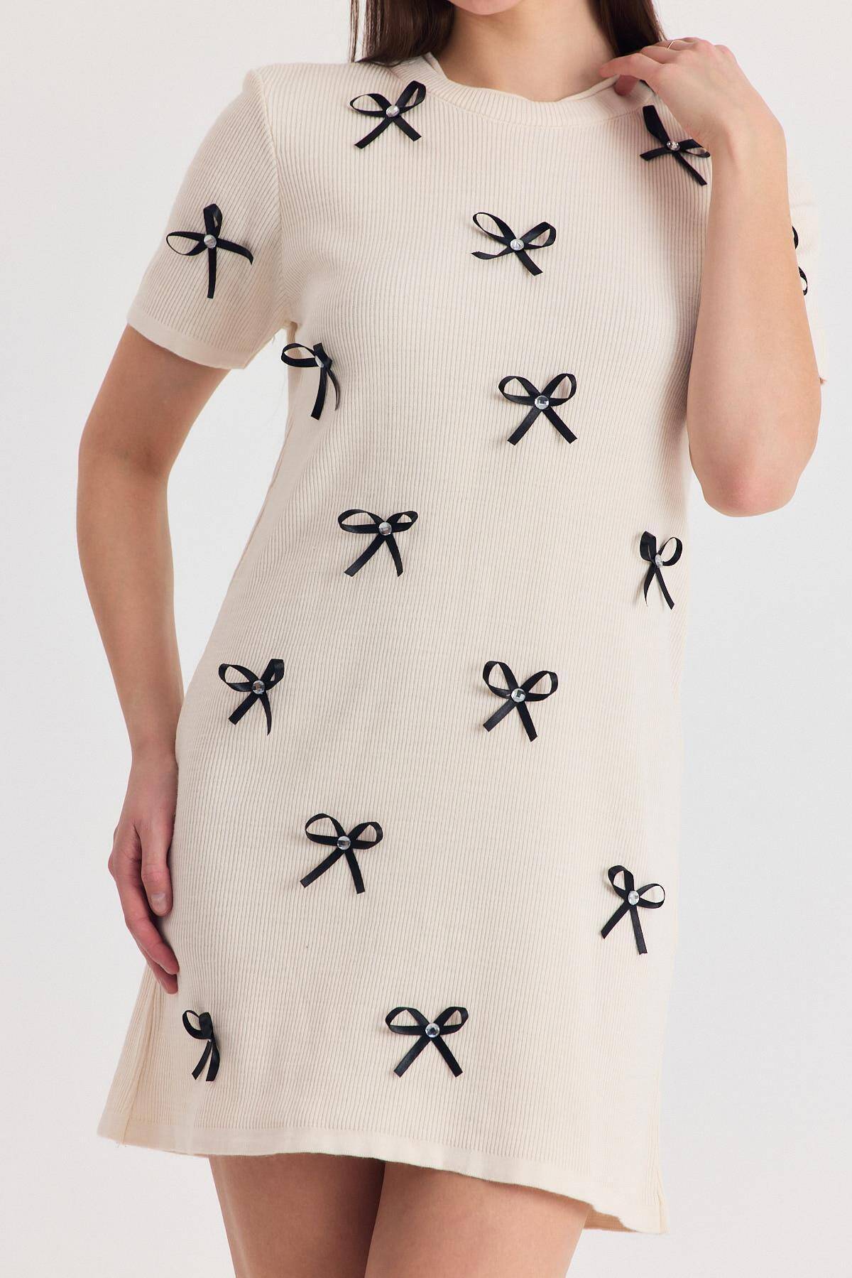 Krem Kurdela Detay Triko Elbise 2117