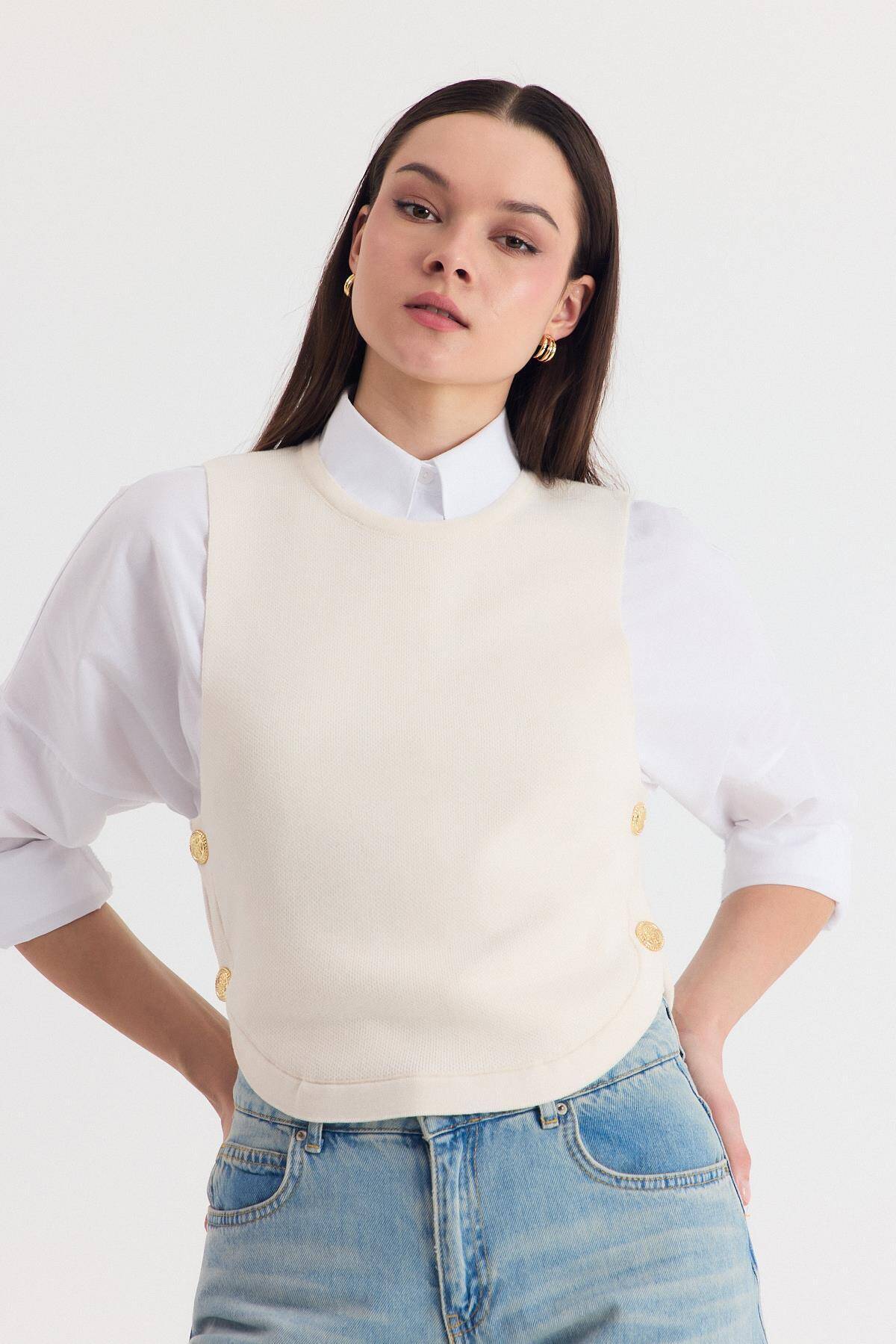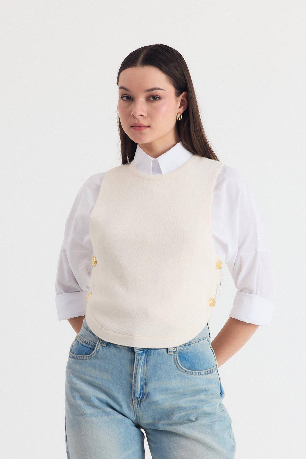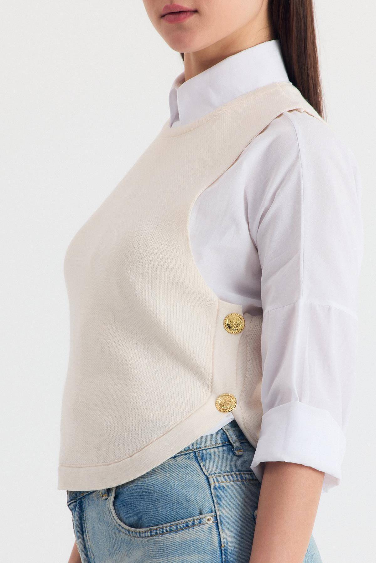 Krem Yan Düğme Detay Sıfır Kol Süveter 2111