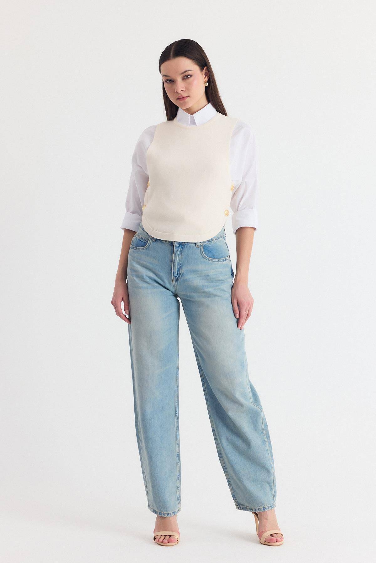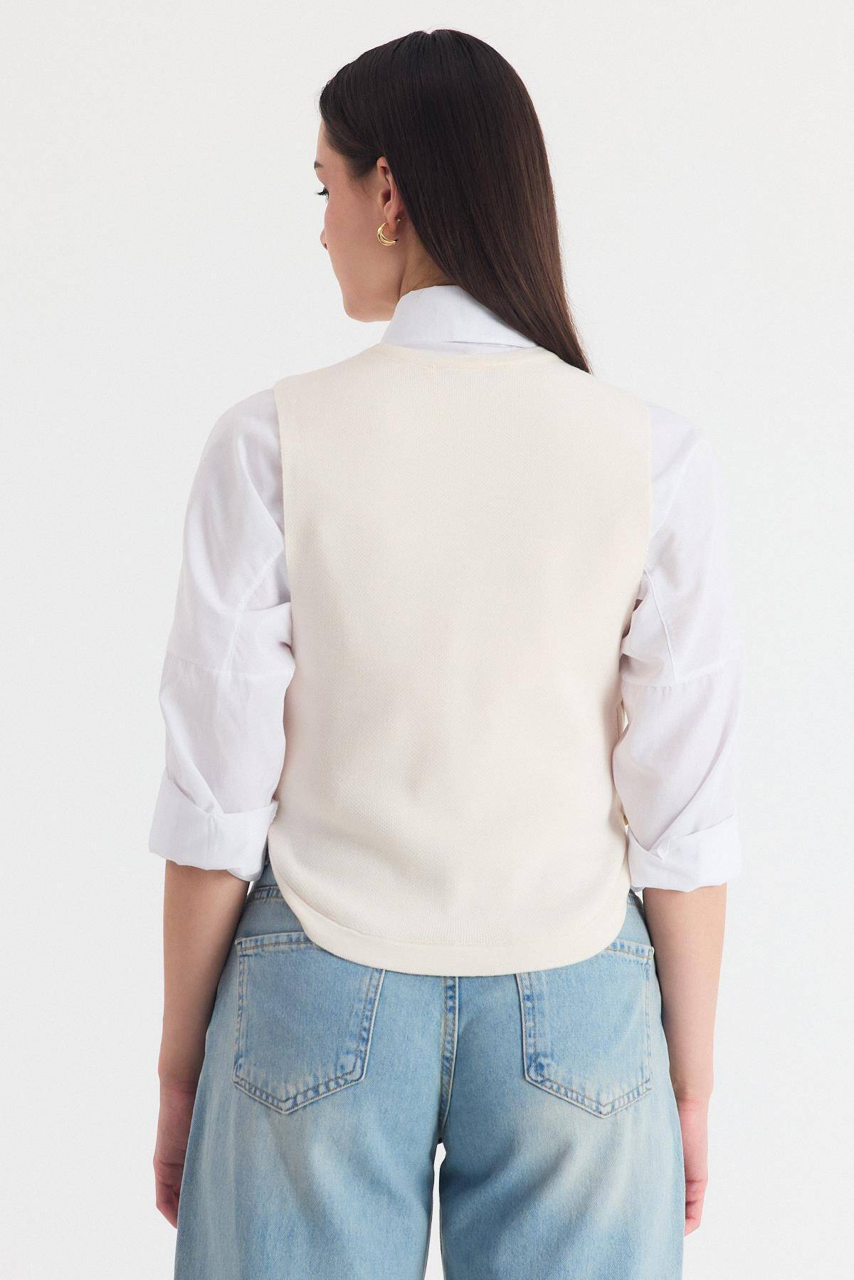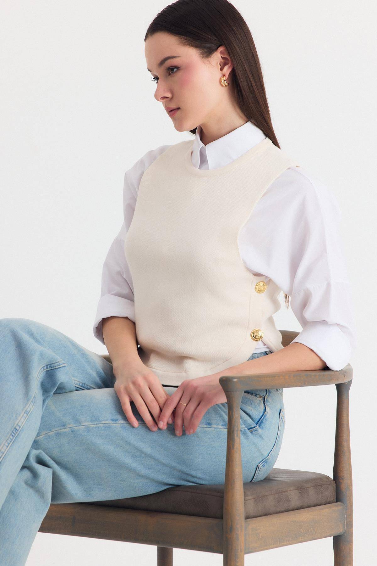 Krem Yan Düğme Detay Sıfır Kol Süveter 2111