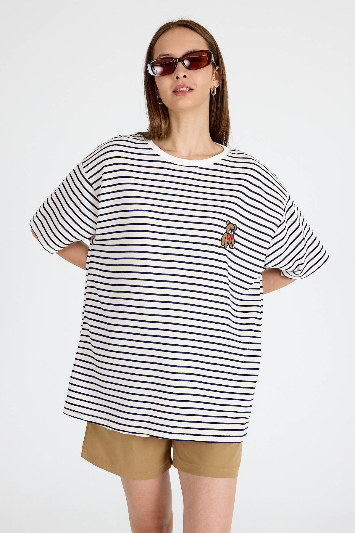 Laci Ayı Nakışlı Çizgili Oversize Tişört 3083
