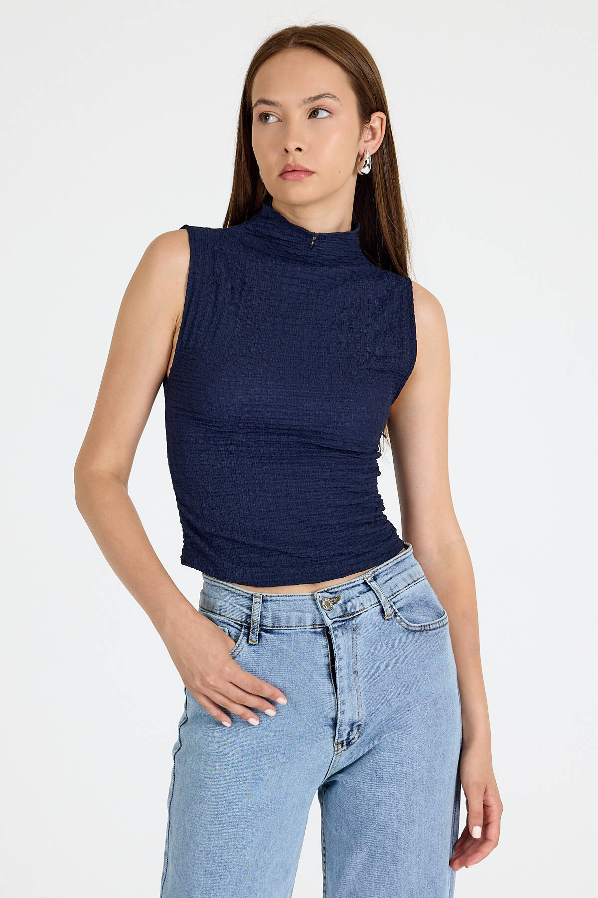 Laci Bürümcük Kumaş Dik Yaka Kolsuz Bluz 3458