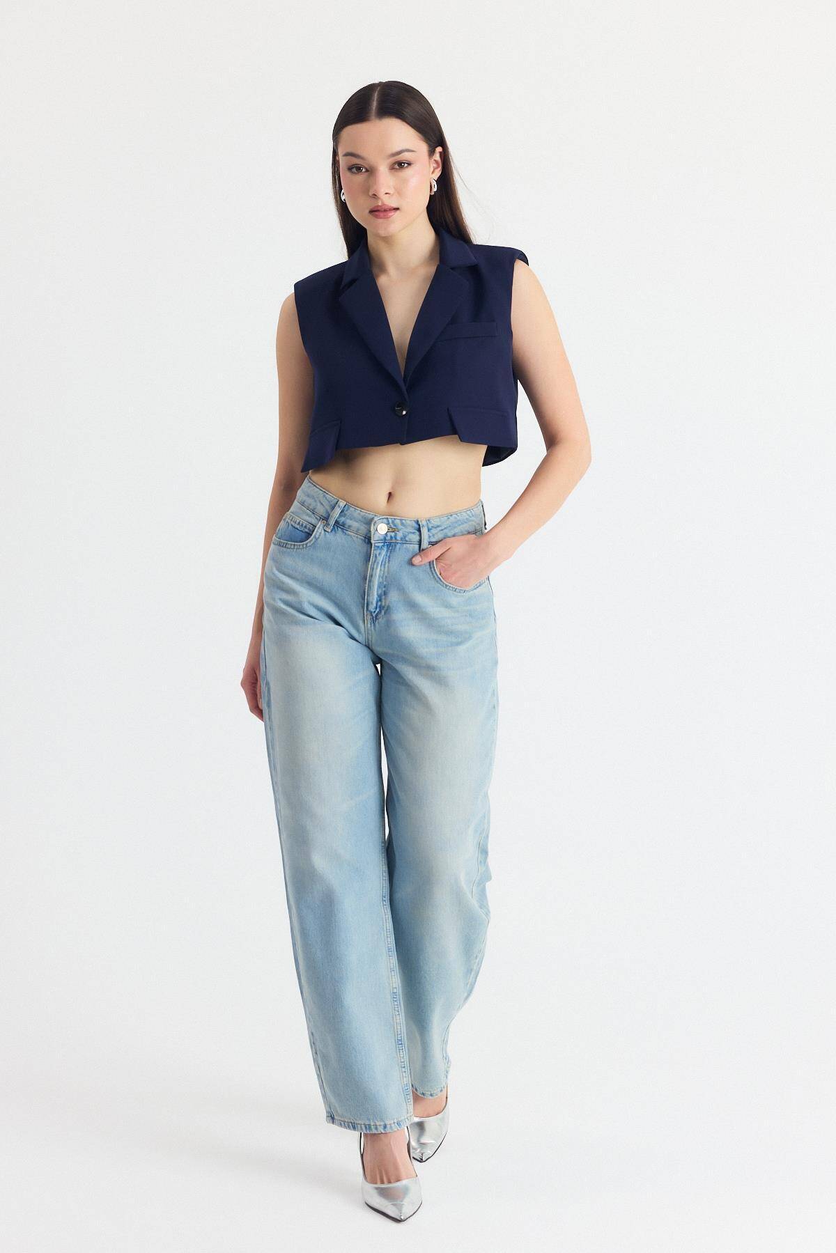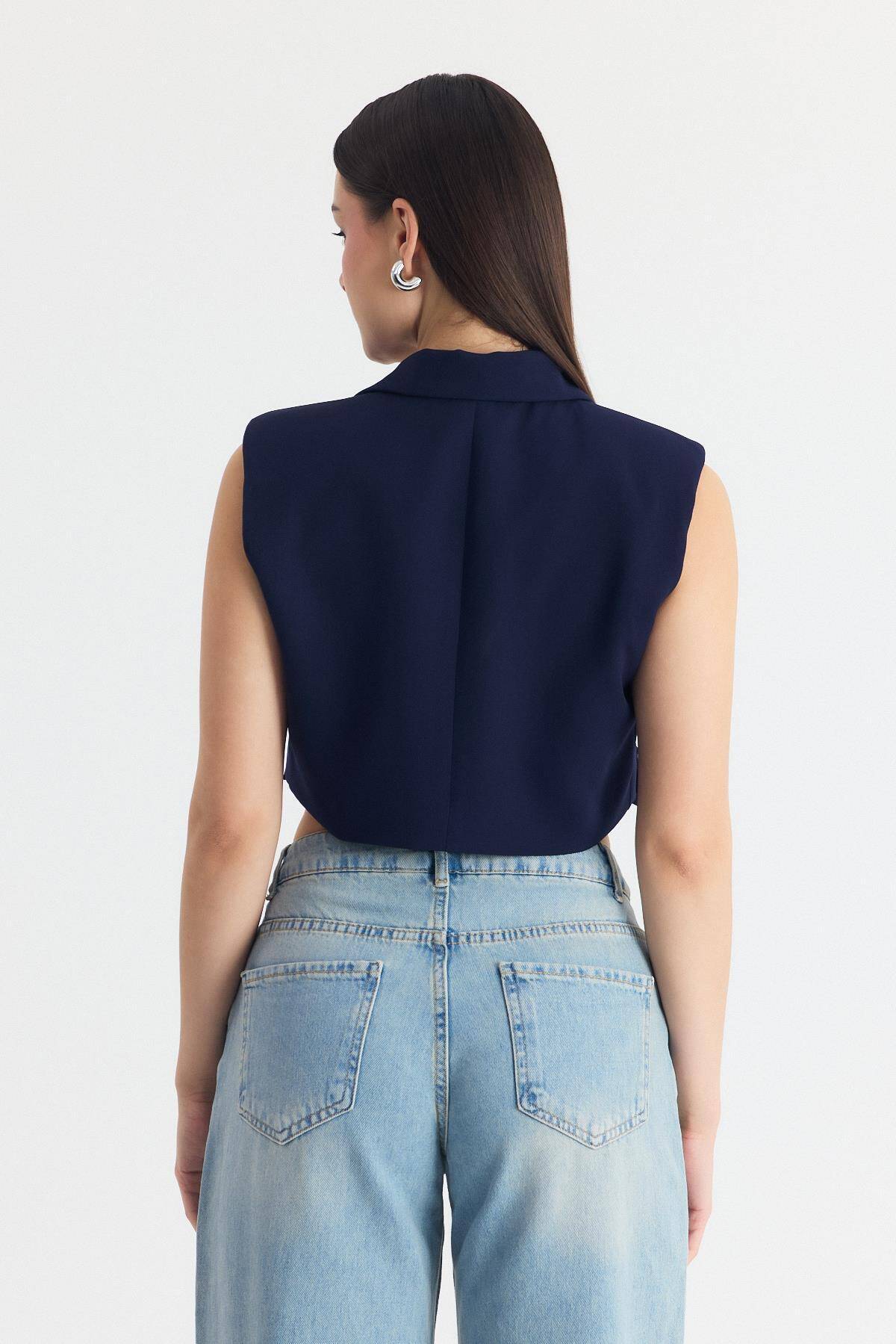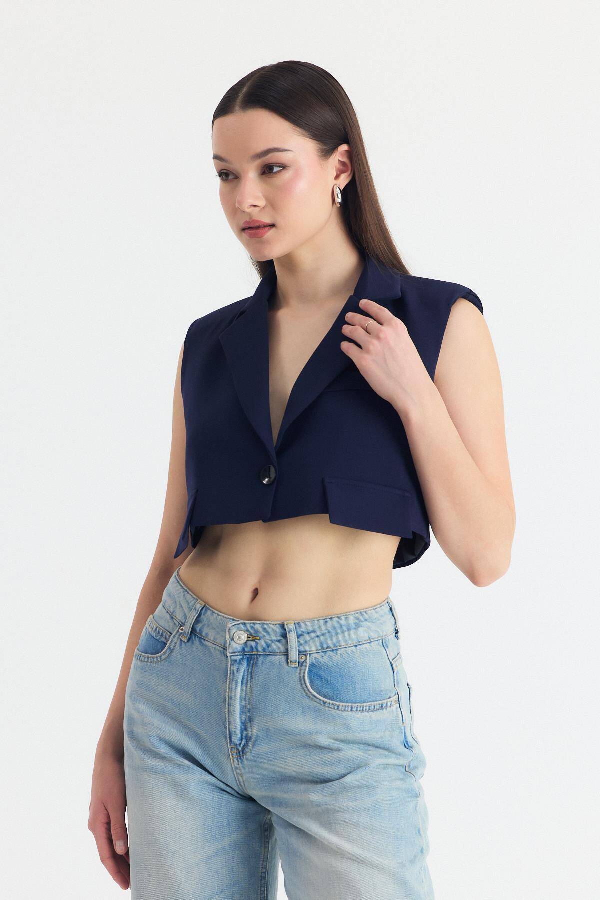 Laci Crop Vatkalı Tek Düğme Cep Detay Yelek 6929
