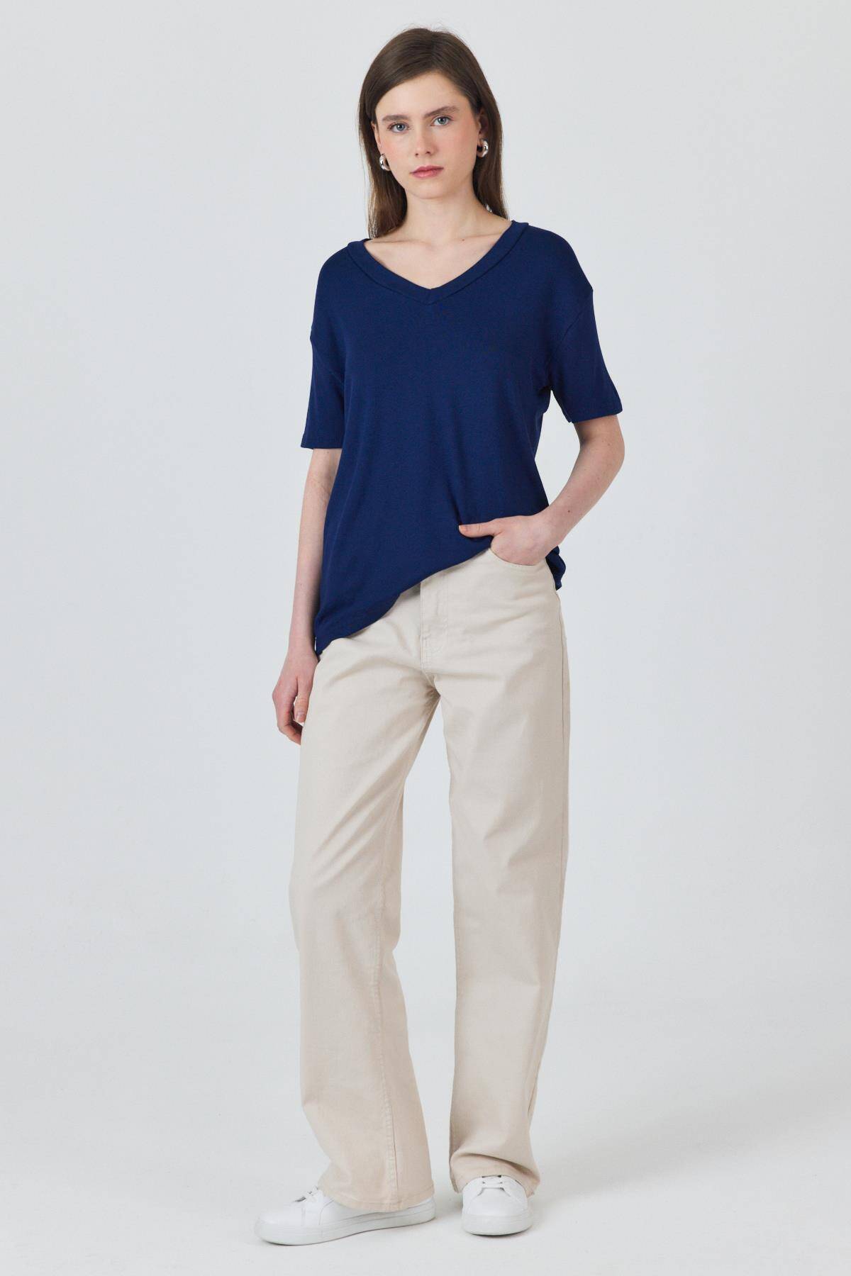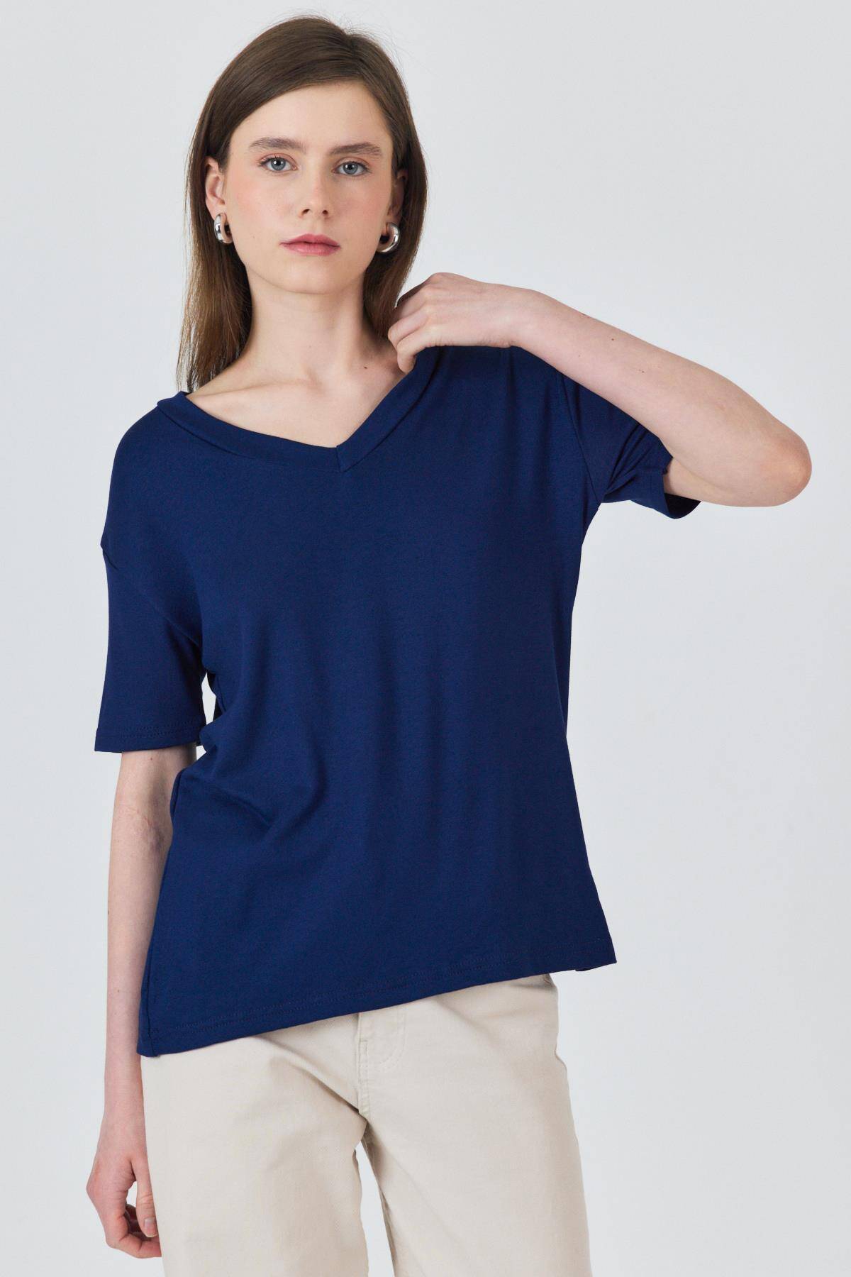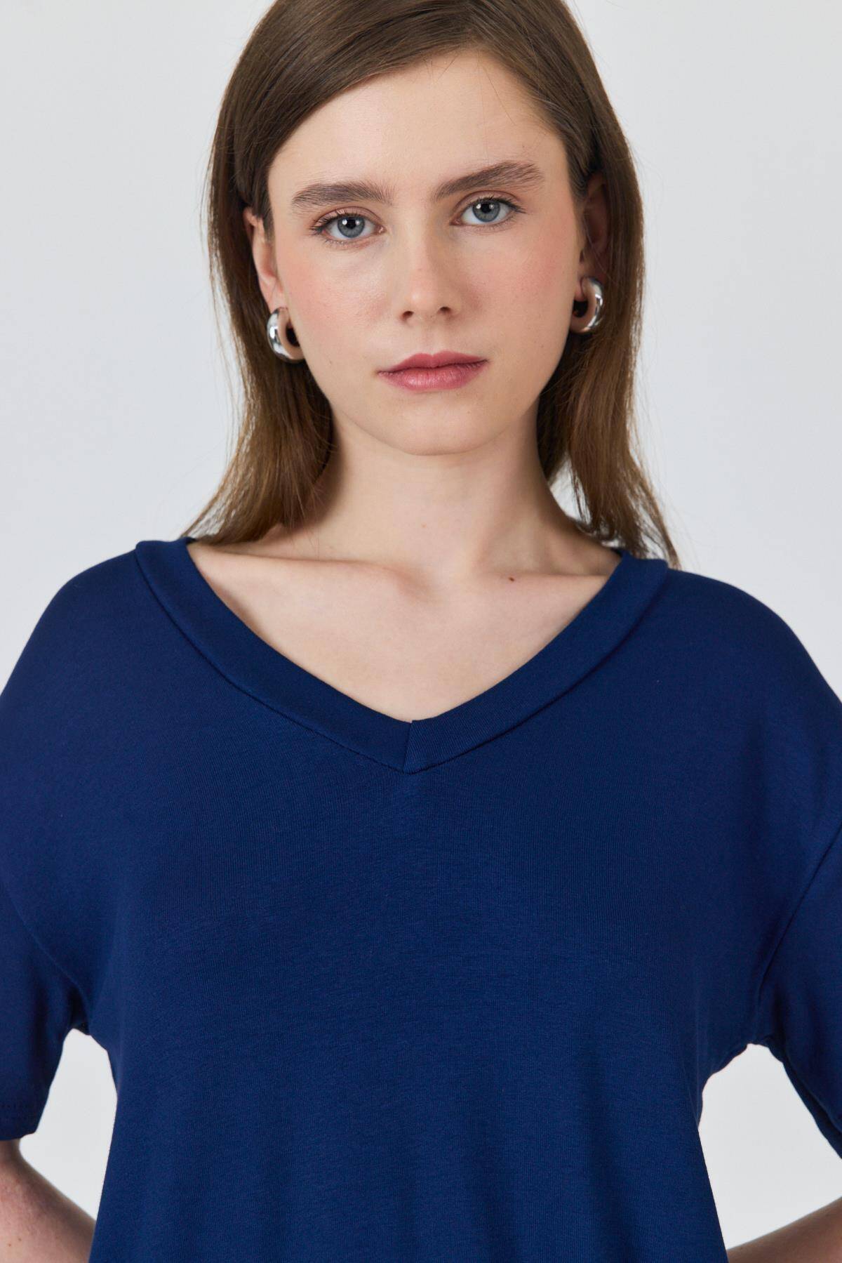 Laci V Yaka Viskoz/Yumuşak Kumaş Dökümlü Tişört 3077
