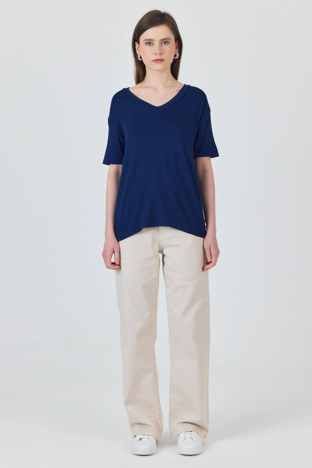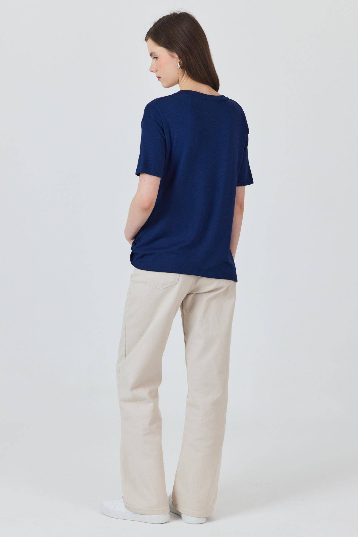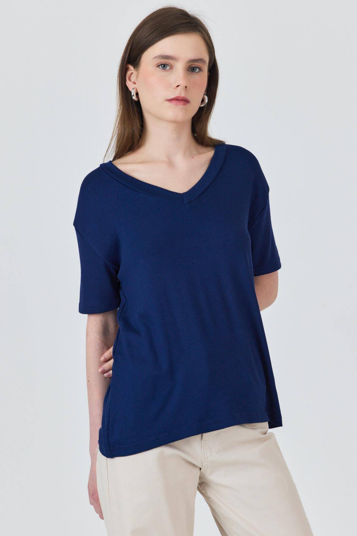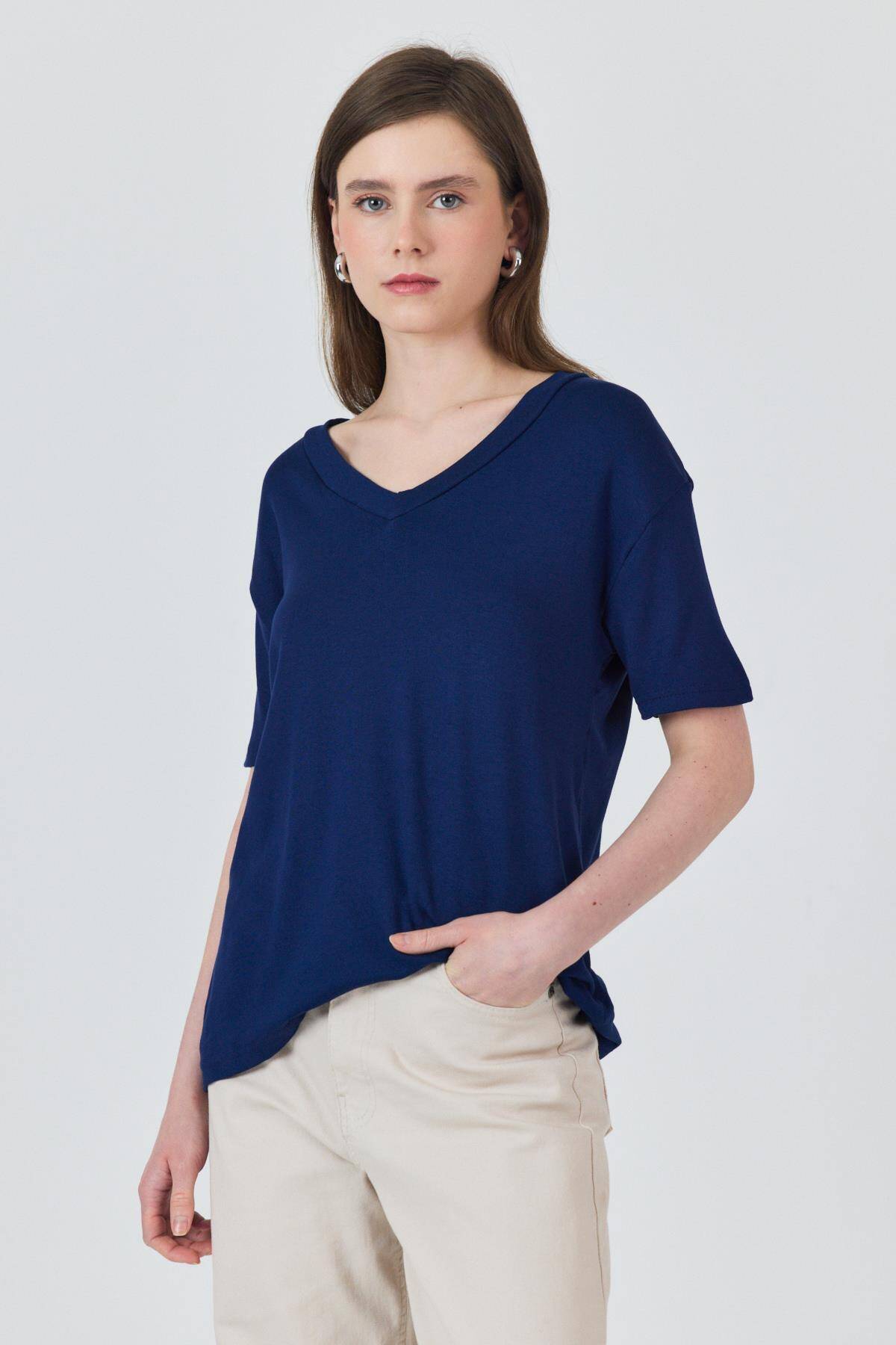 Laci V Yaka Viskoz/Yumuşak Kumaş Dökümlü Tişört 3077