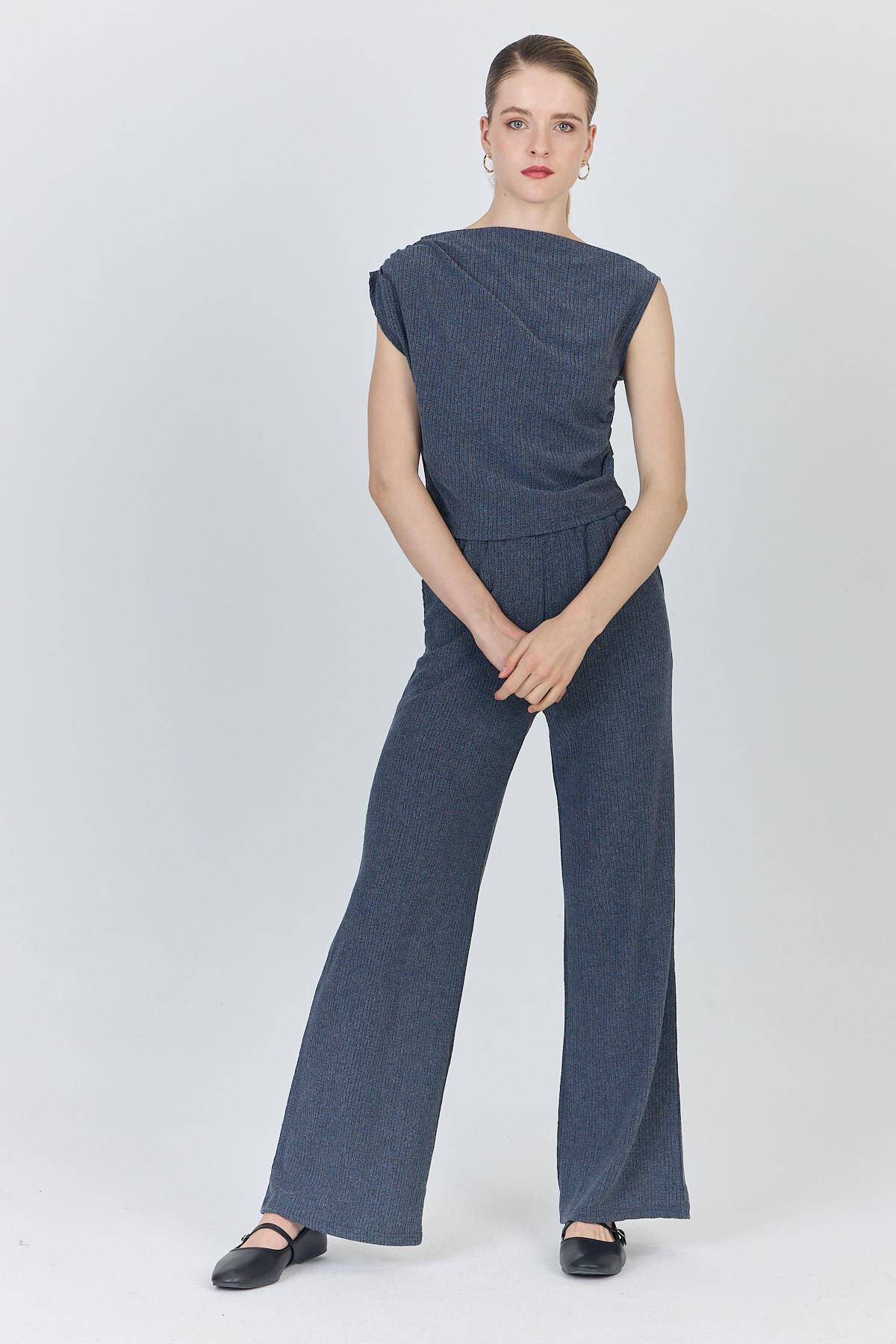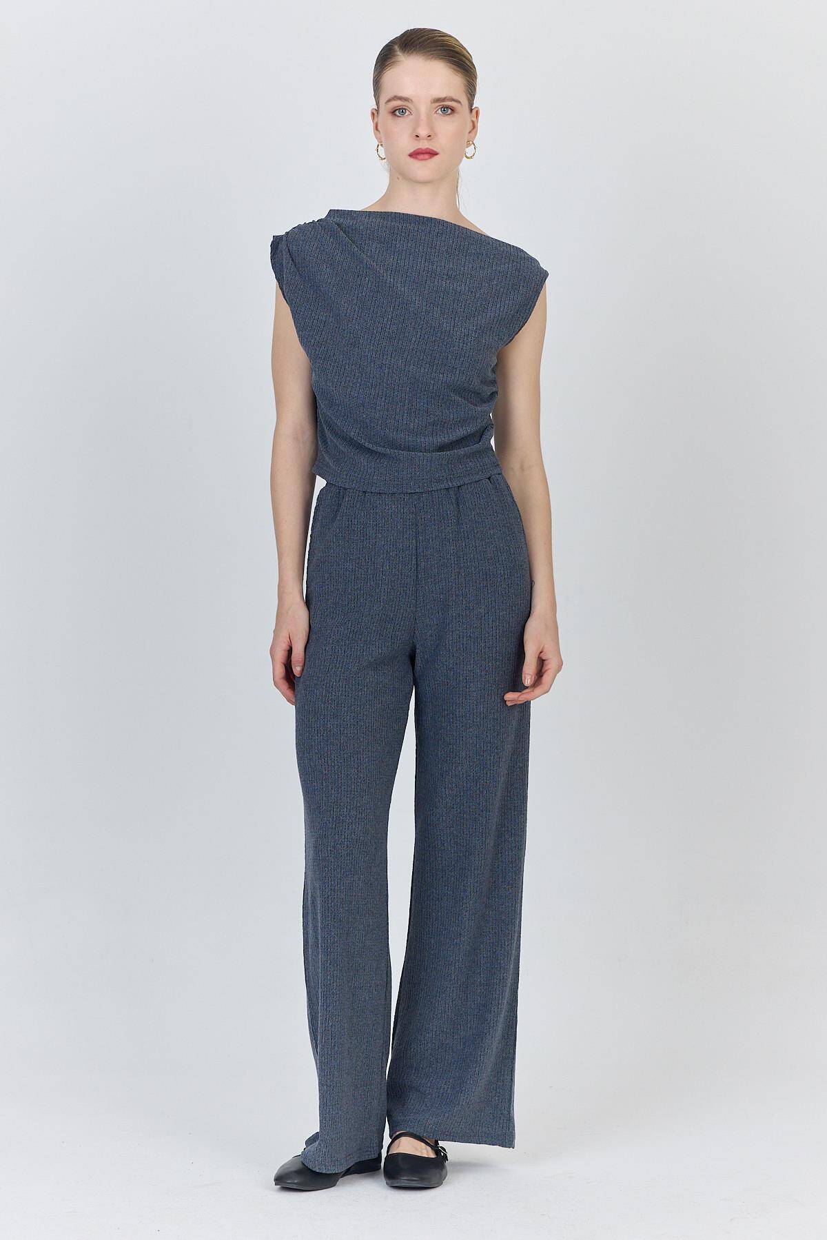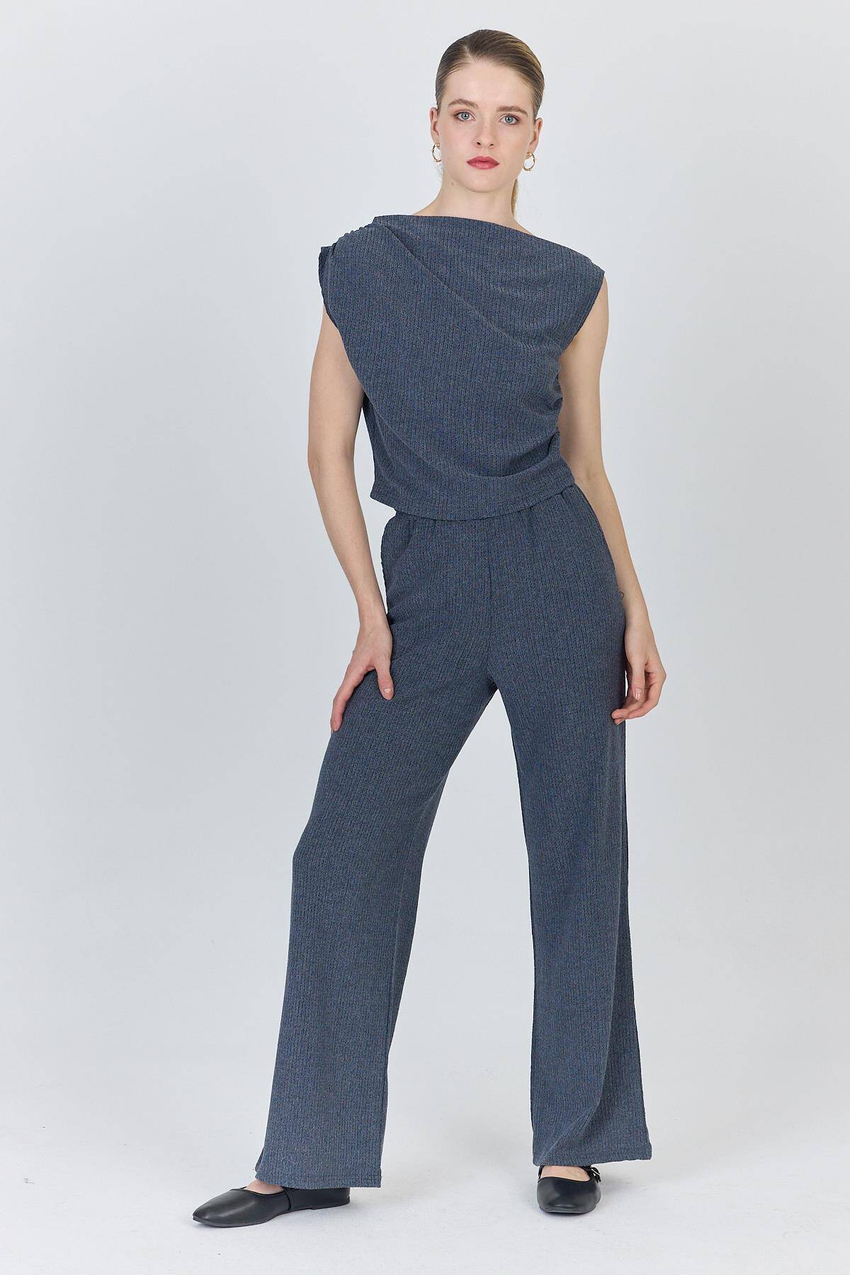 Mavi Asimetrik Omuz Detaylı Bluz ve Geniş Paça Pantolon Takım 1491