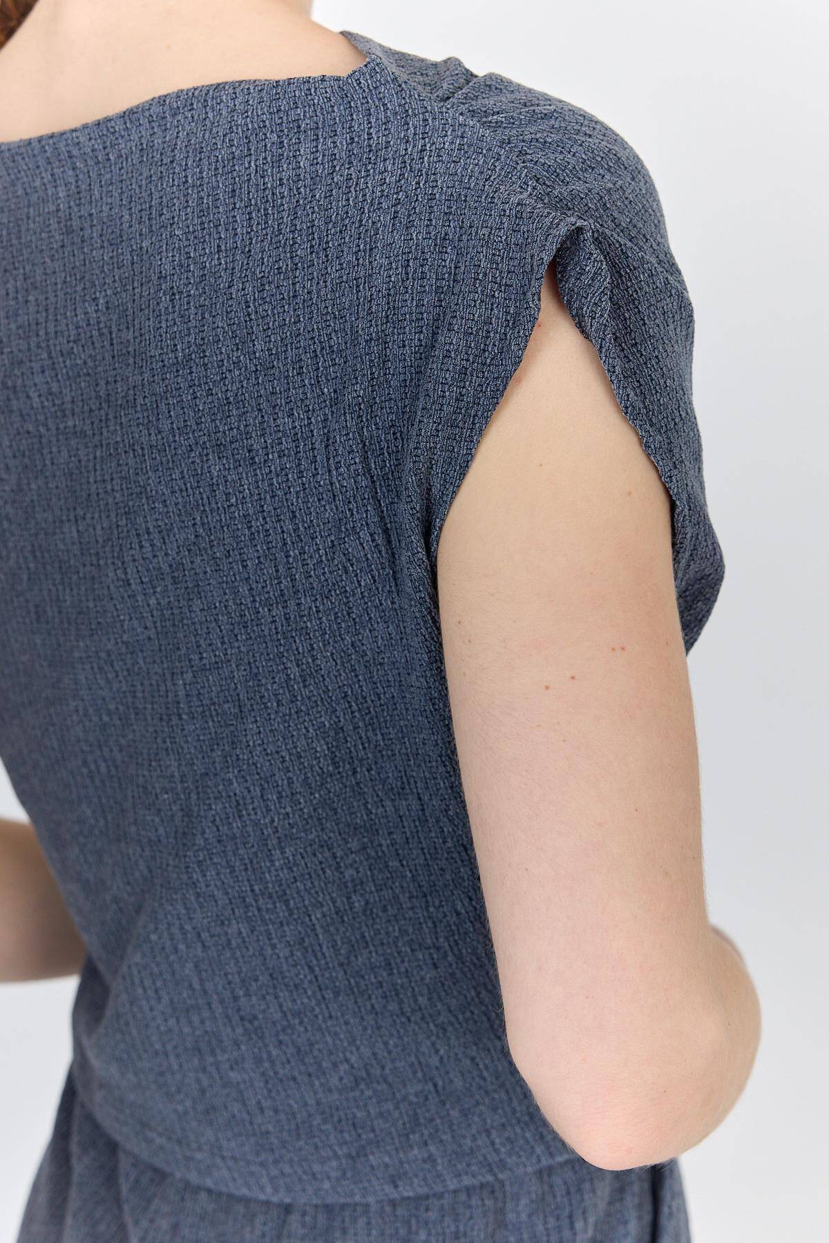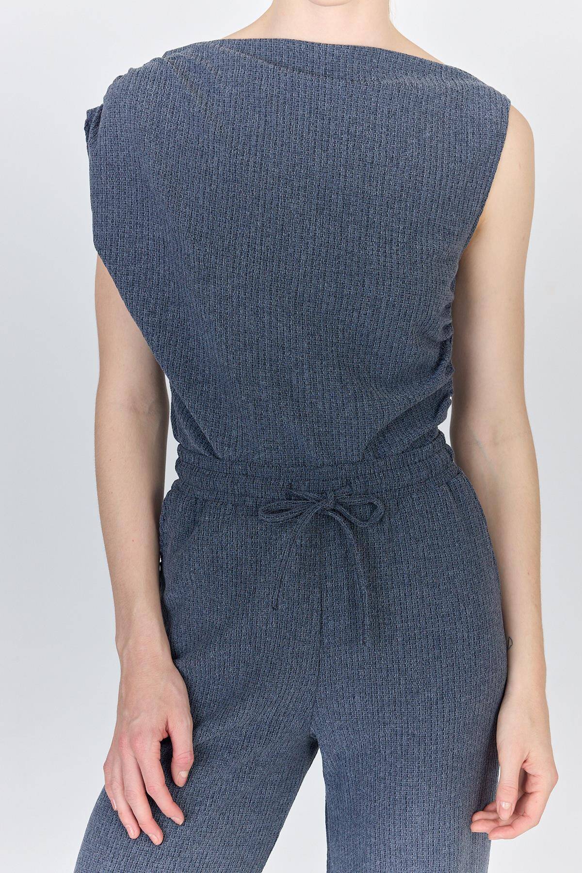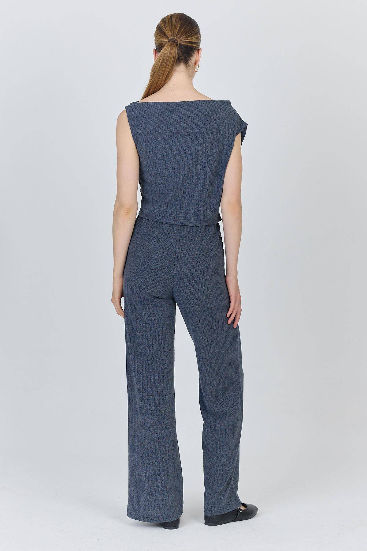 Mavi Asimetrik Omuz Detaylı Bluz ve Geniş Paça Pantolon Takım 1491