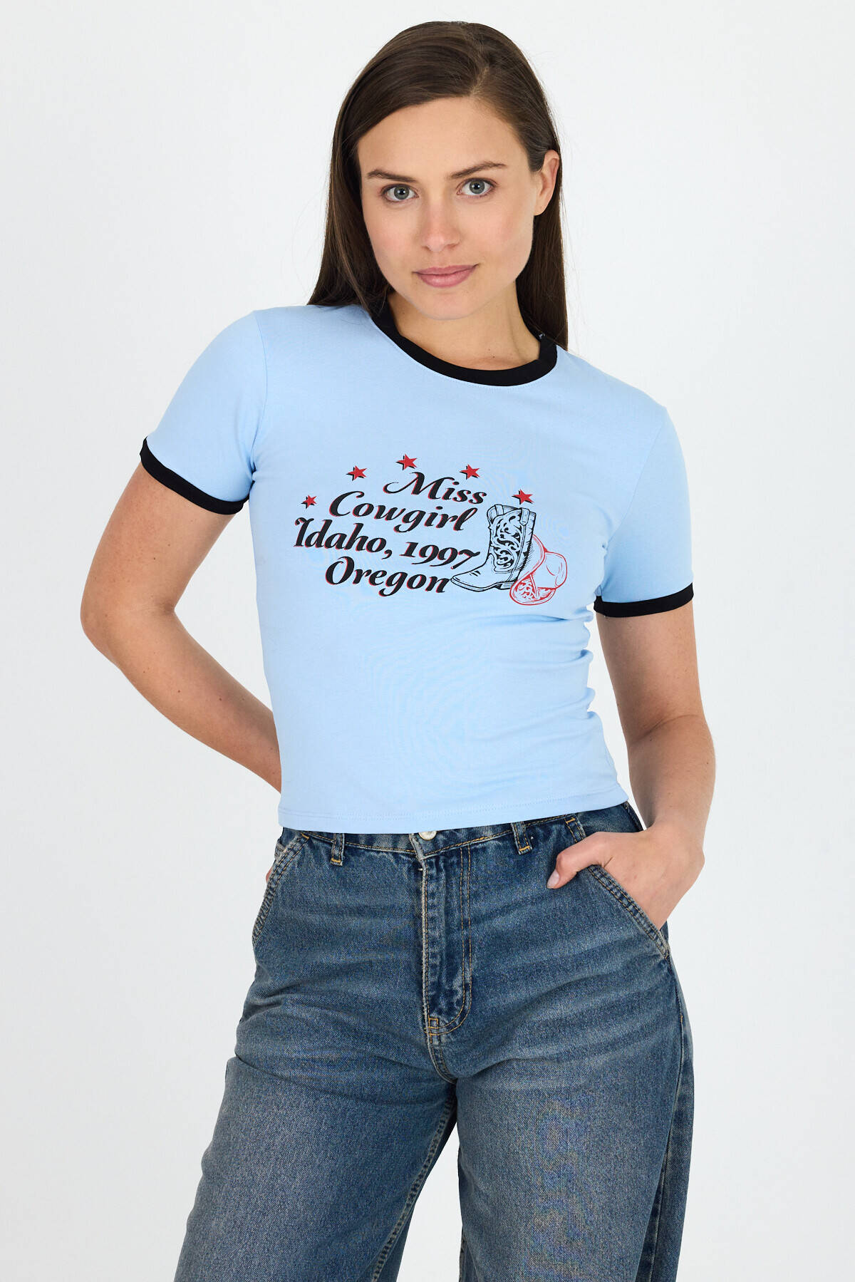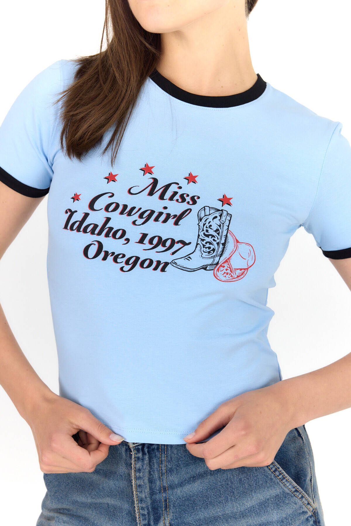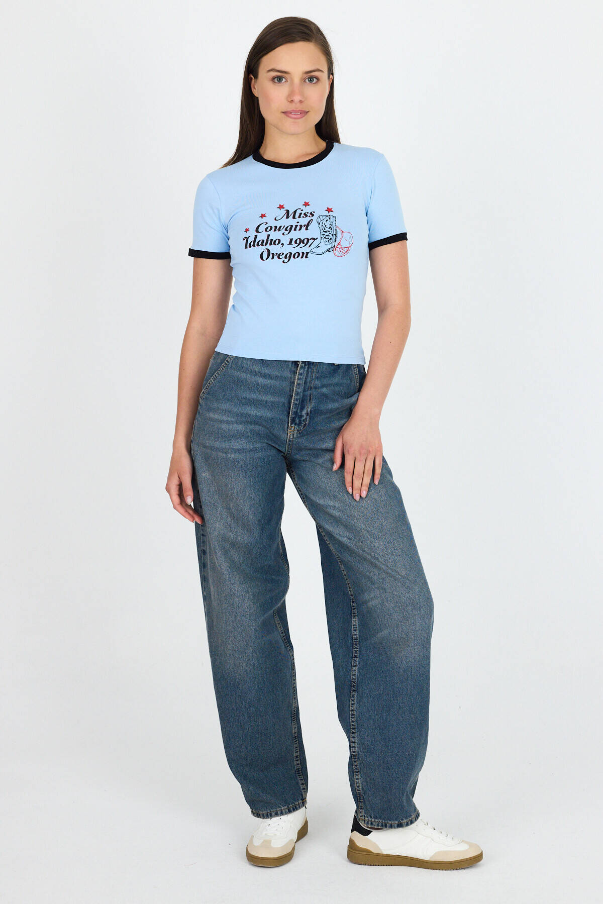 Mavi Baskılı Ribana Detaylı Pamuklu Crop Tişört 9191M