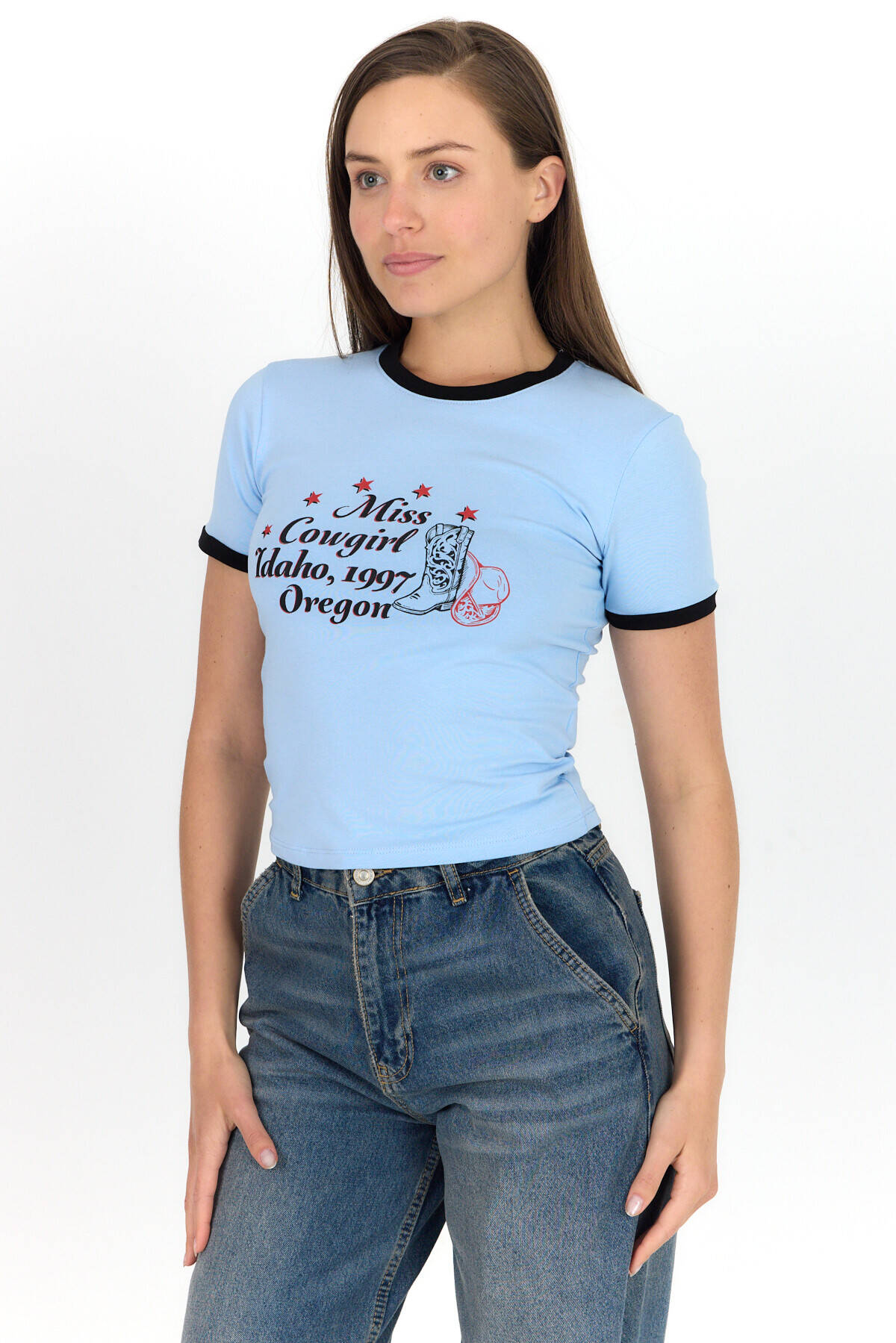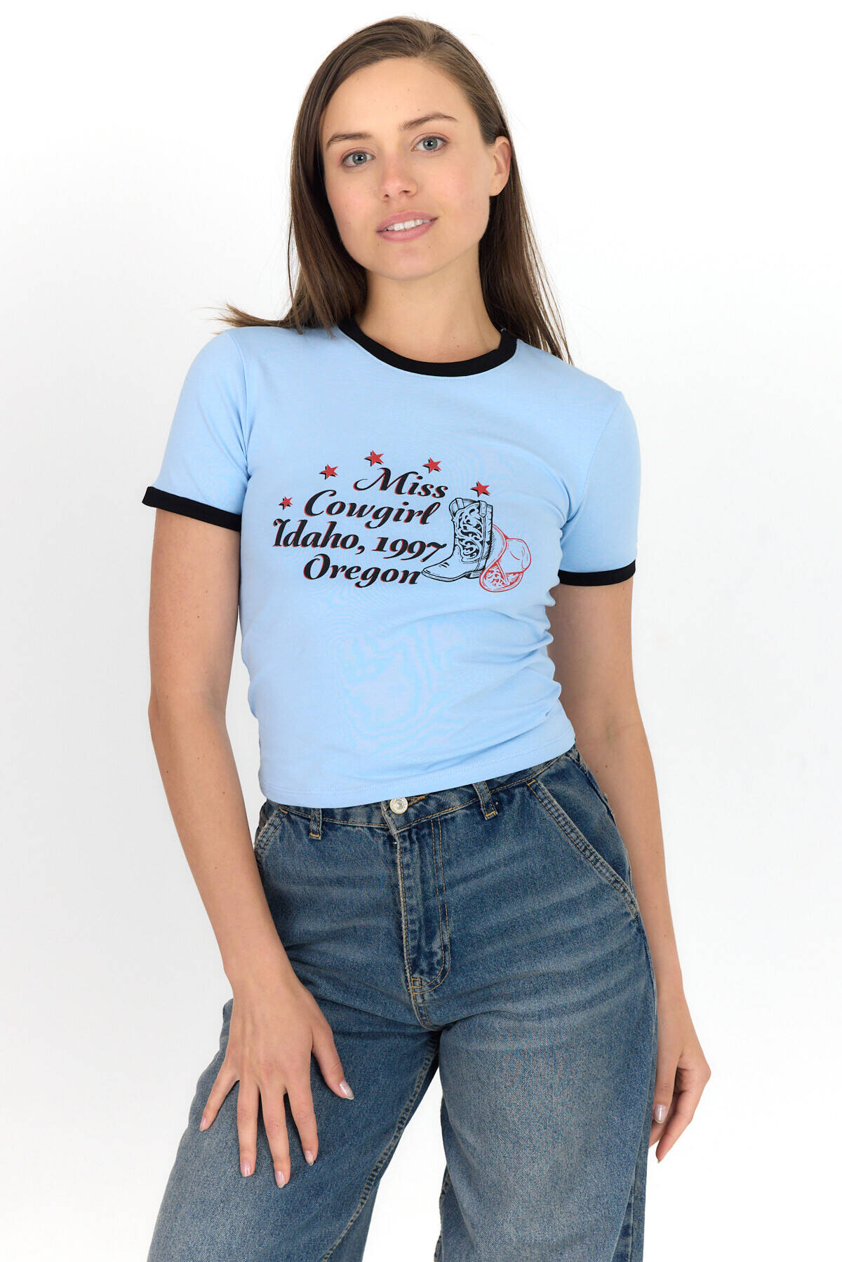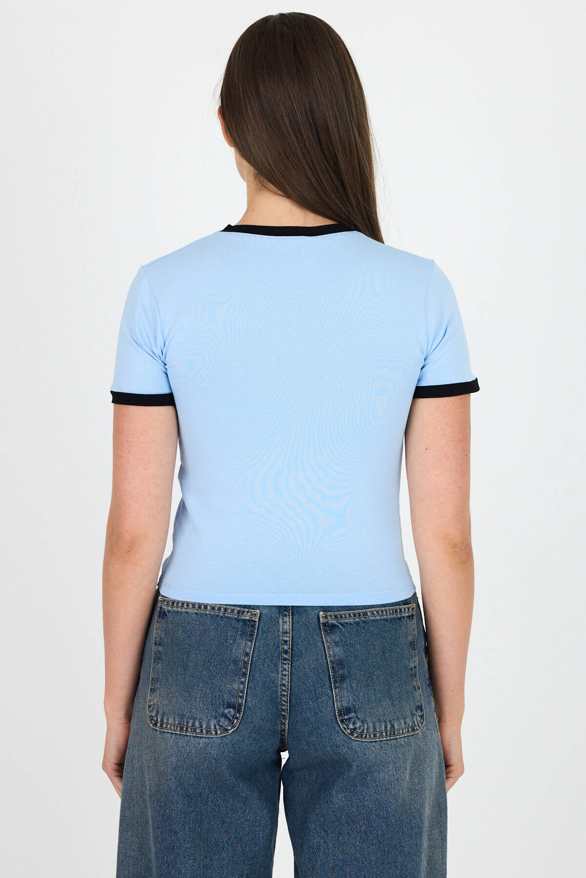 Mavi Baskılı Ribana Detaylı Pamuklu Crop Tişört 9191M
